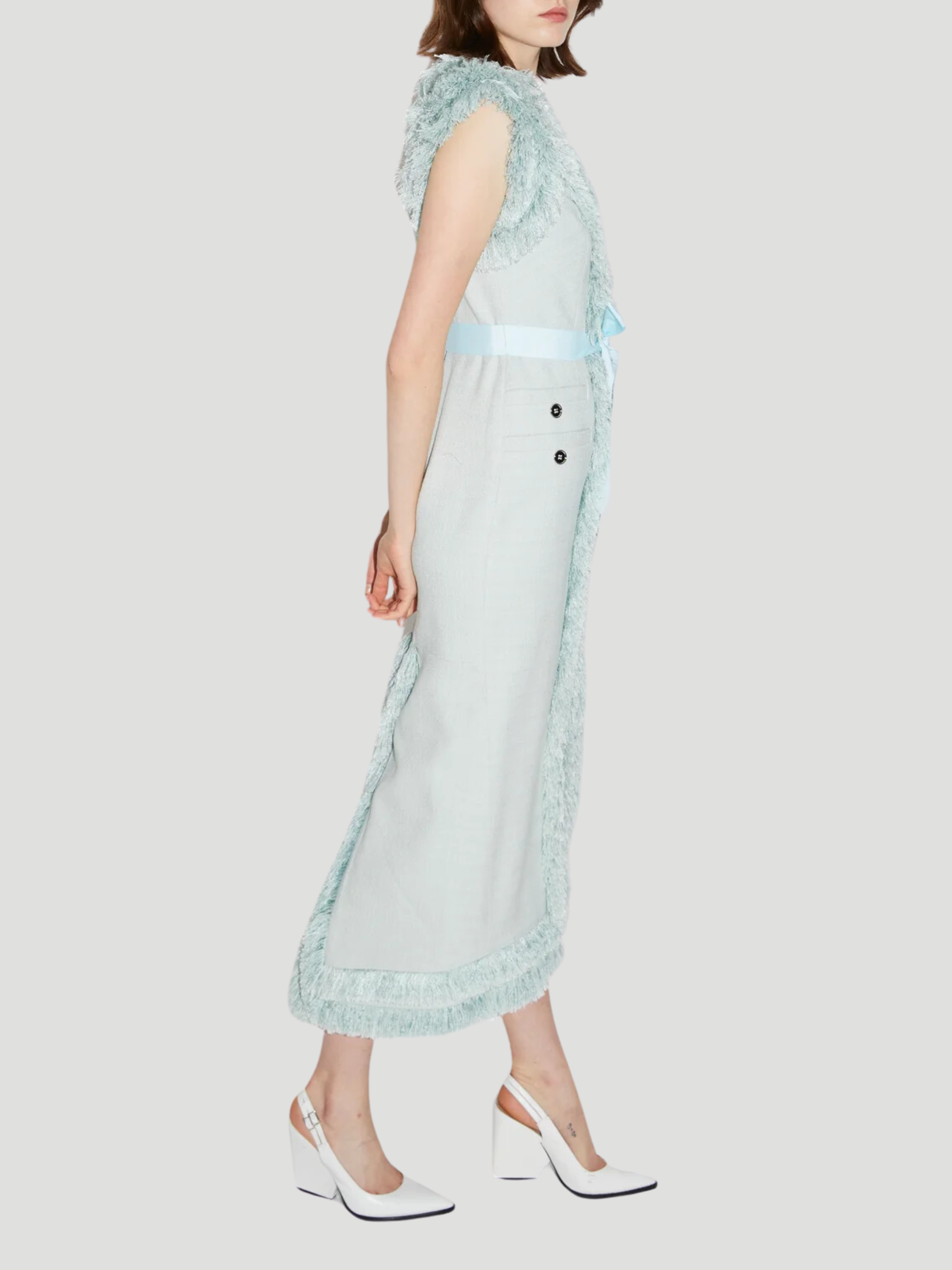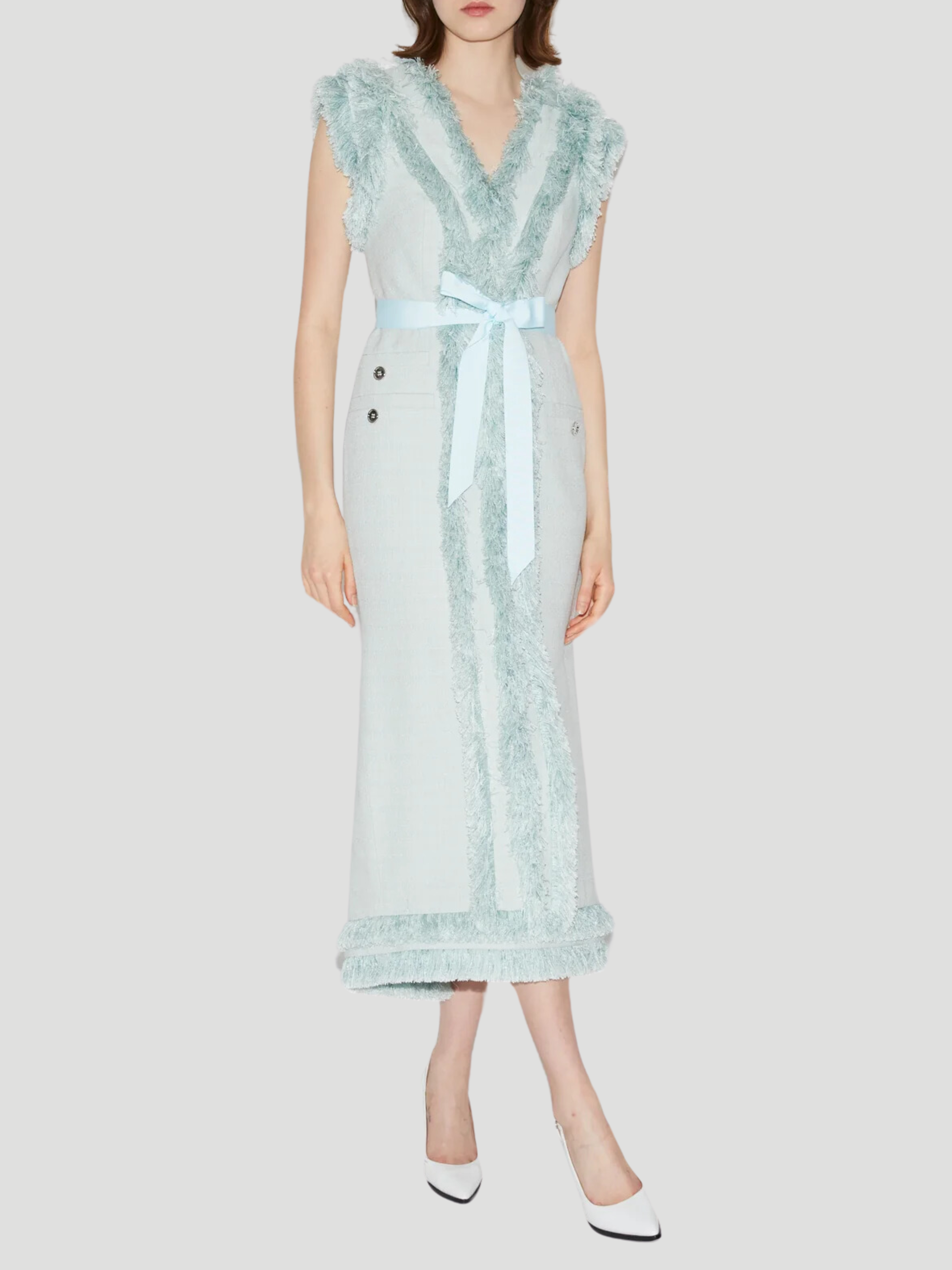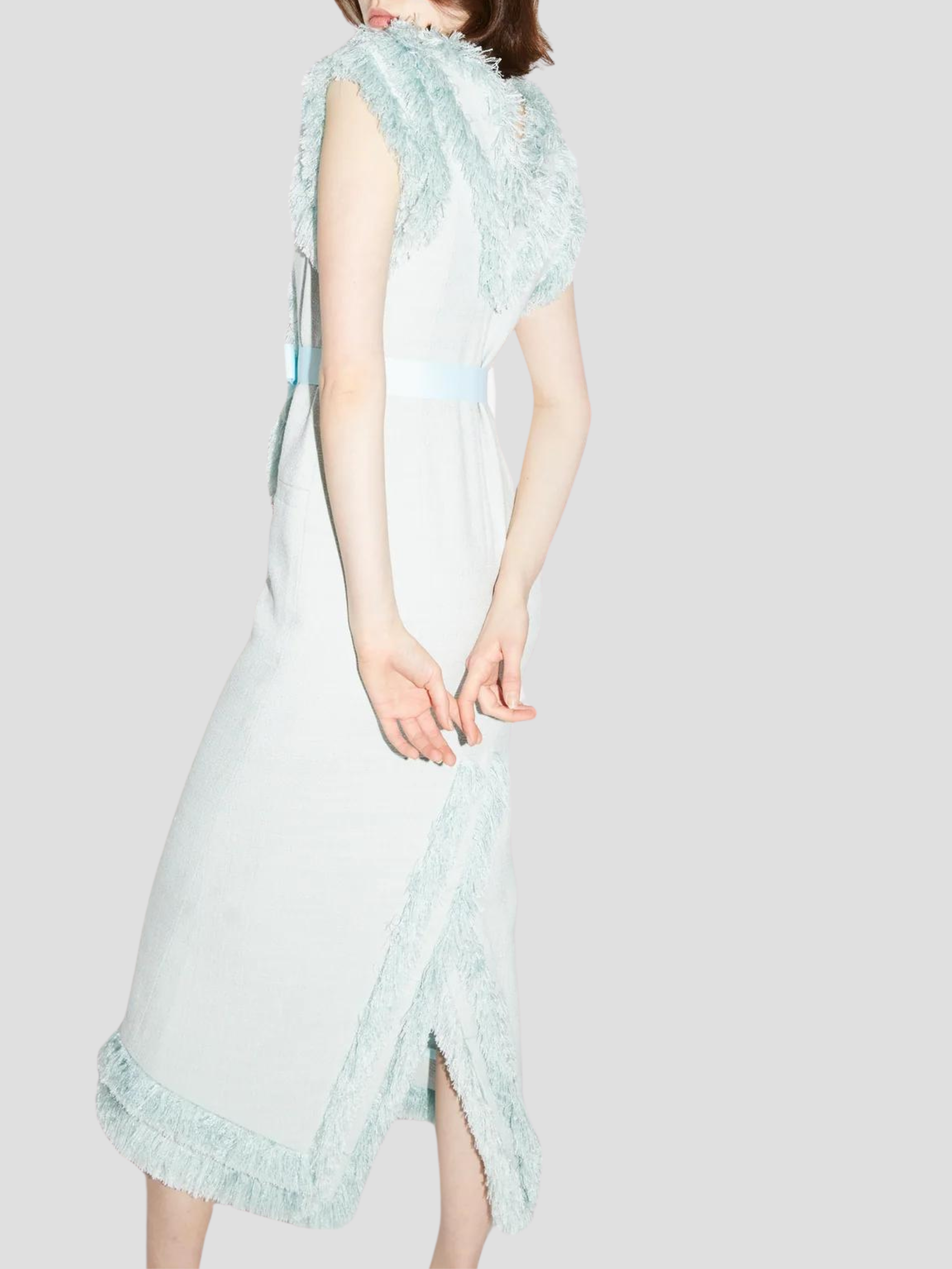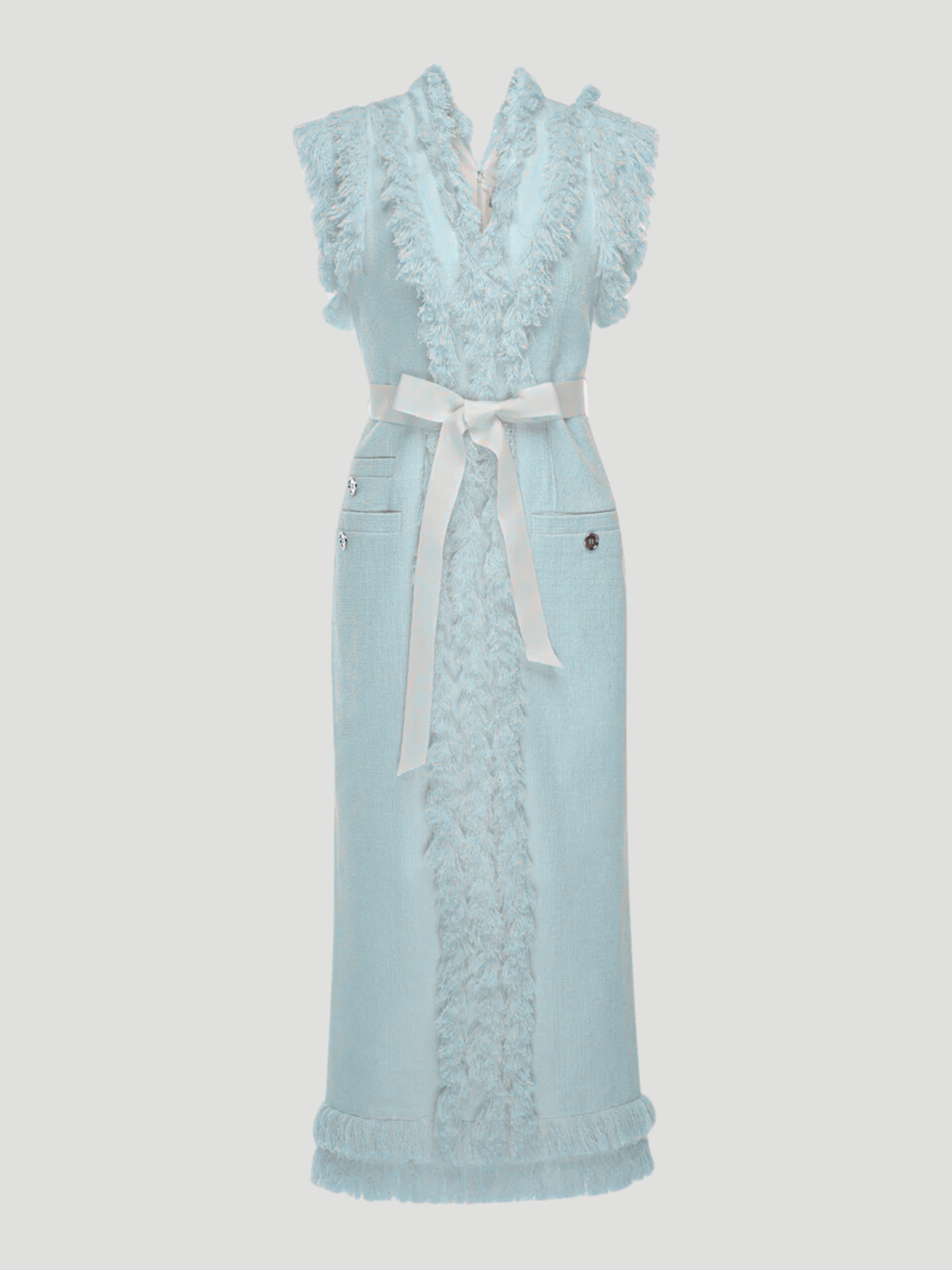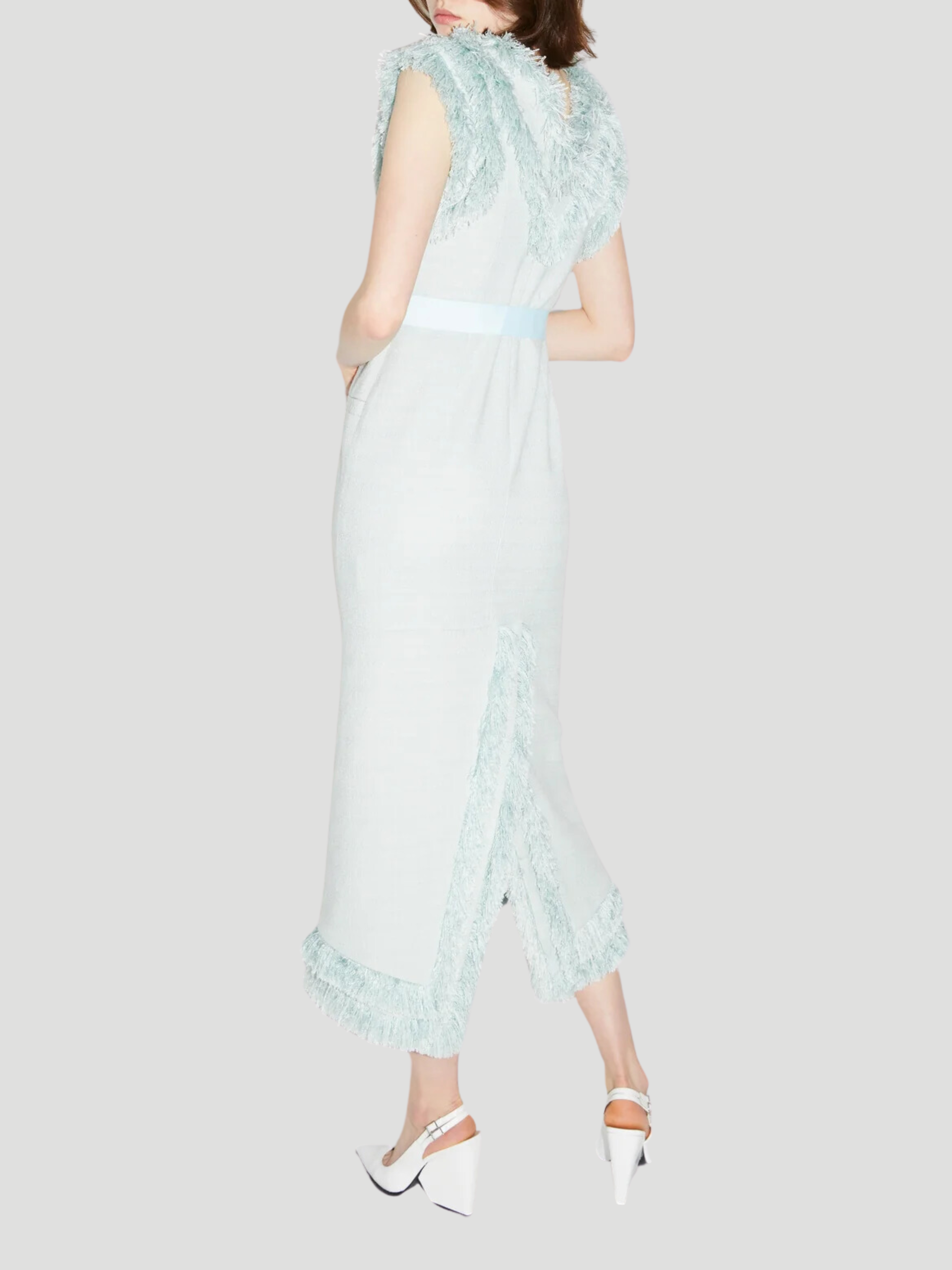 The Arlo Tweed Sleeveless Dress from Huishan Zhang is a refined and glamorous addition to your wardrobe. It is crafted from luxurious light blue tweed, creating a dynamic and textured visual effect. The fitted silhouette flatters the figure with grace and poise, while the frayed hem fringes add a touch of movement. With thoughtful design elements, such as the asymmetric back vent, this dress offers a contemporary twist on a classic silhouette.