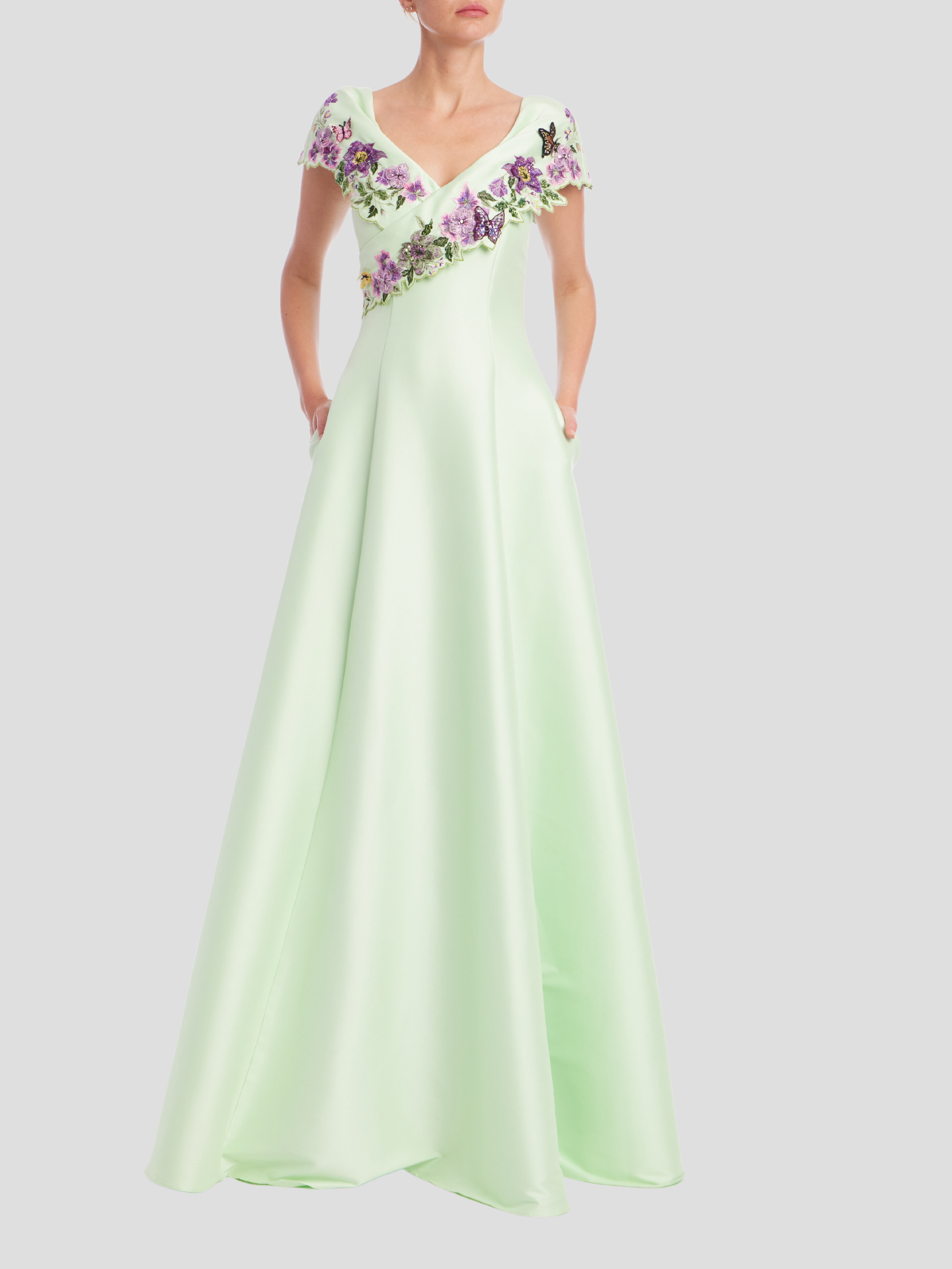 Effortlessly exude elegance in our Embellished Surplice Gown in Green. The deep green color and embellished details create a stunning and sophisticated look. The surplice design flatters the figure, making you feel confident and beautiful. Perfect for any special occasion, this gown is sure to turn heads.
