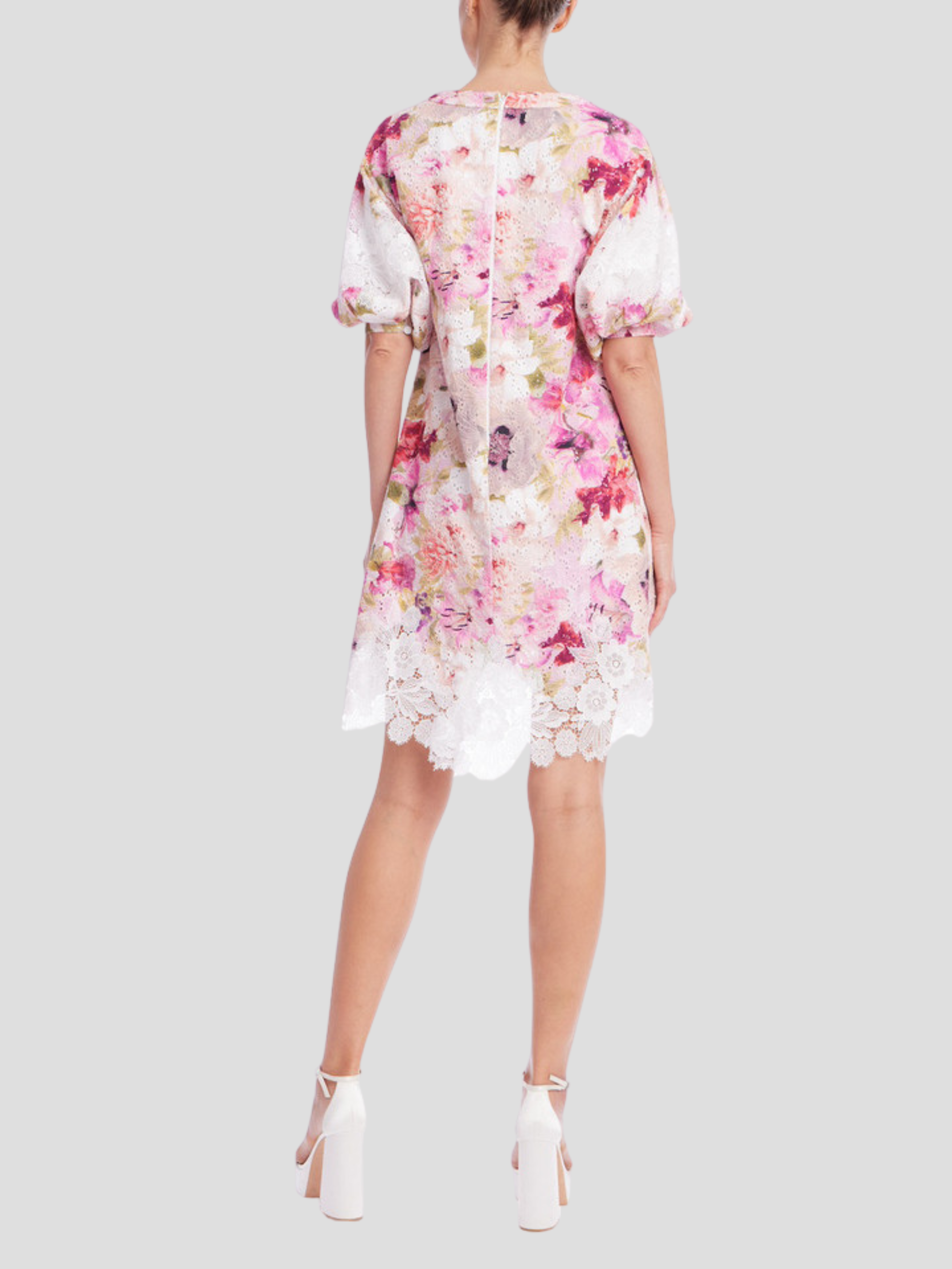 Step into effortless elegance with this Floral Embroidered Lace V-Neck Mini Dress in Pink Multi. Featuring delicate eyelet embroidery, romantic puff sleeves, and a scalloped lace hem, this dress blends modern femininity with timeless charm. The vivid floral print adds a burst of color, making it perfect for garden parties, weddings, or any summer celebration. The flattering V-neckline and tailored silhouette ensure a comfortable yet stylish fit, while the intricate detailing elevates your look from casual to couture-inspired. Pair with strappy heels for a polished ensemble.