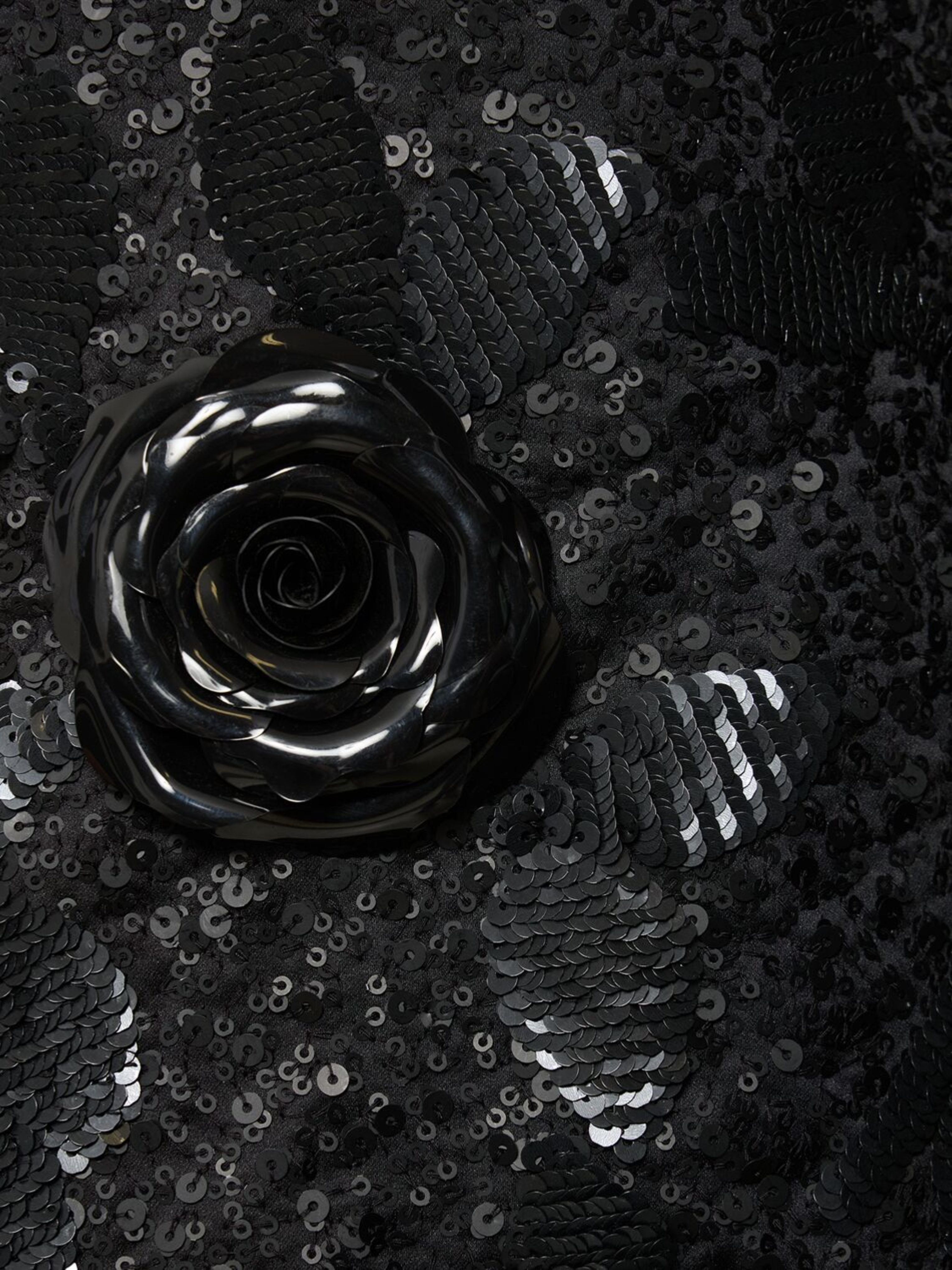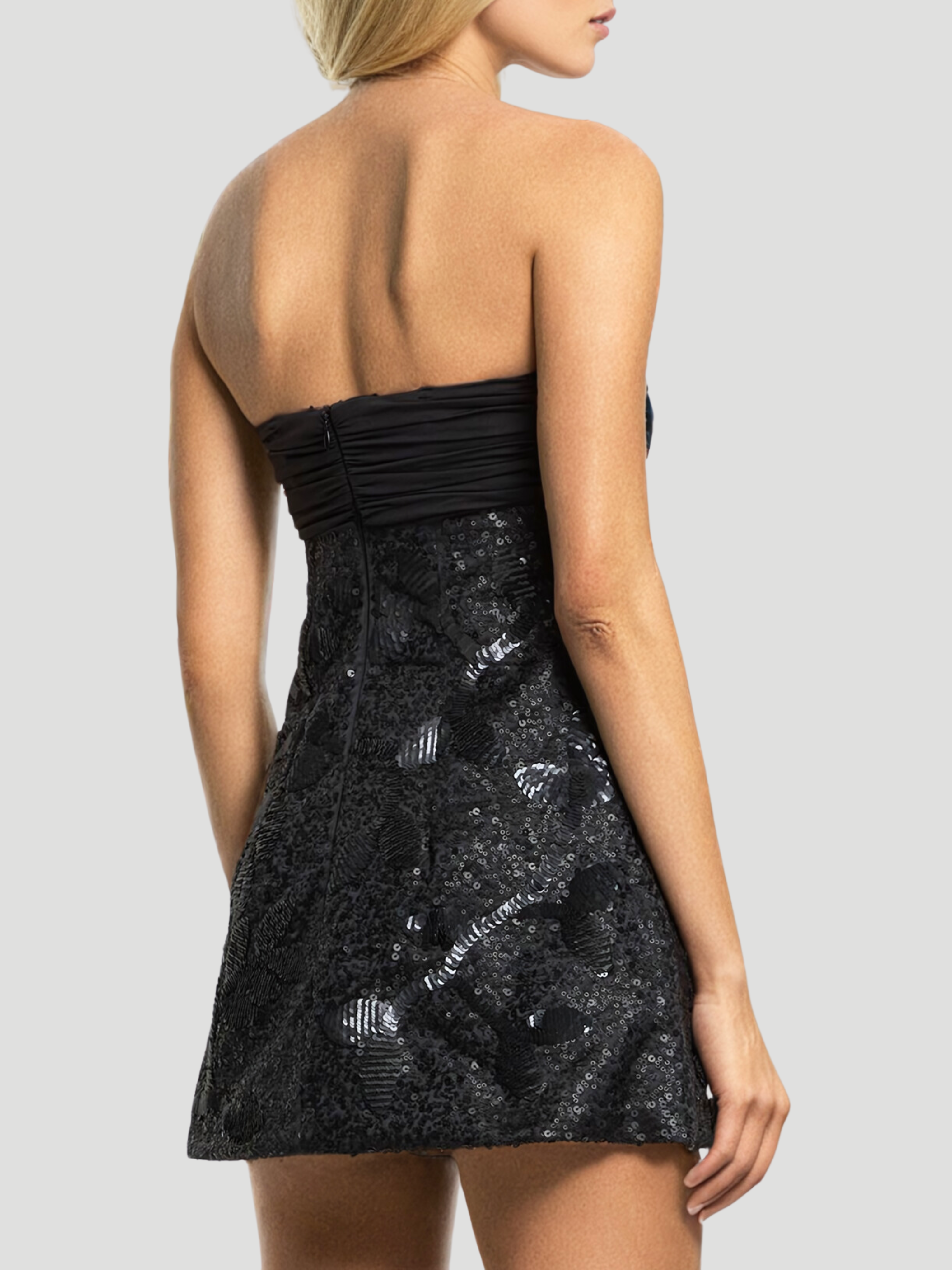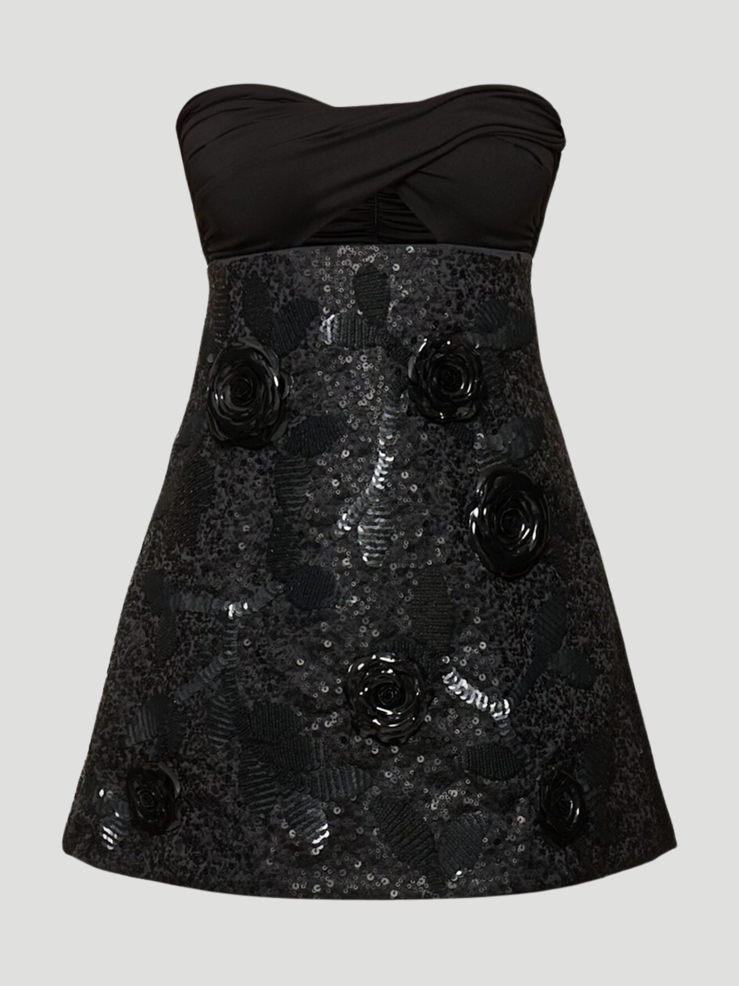 Indulge in unparalleled glamour with Salvo Rizza's Sequins and 3D Mini Dress. The strapless design and twisted bust add a touch of '90s sex appeal, while the shimmering sequins and rosette appliqués showcase impeccable Italian craftsmanship. Make a statement at any event with this hyper-embellished and three-dimensional masterpiece.