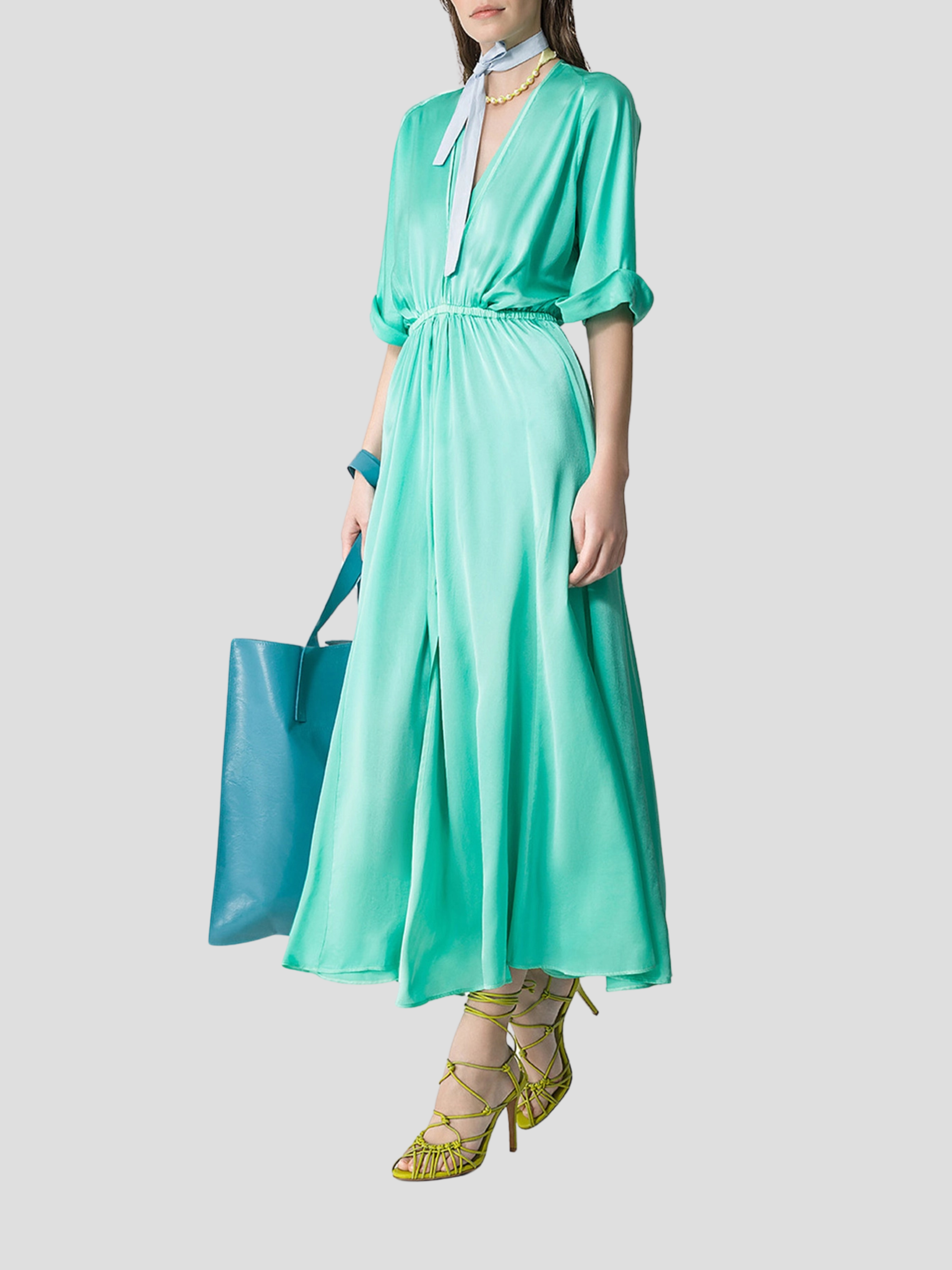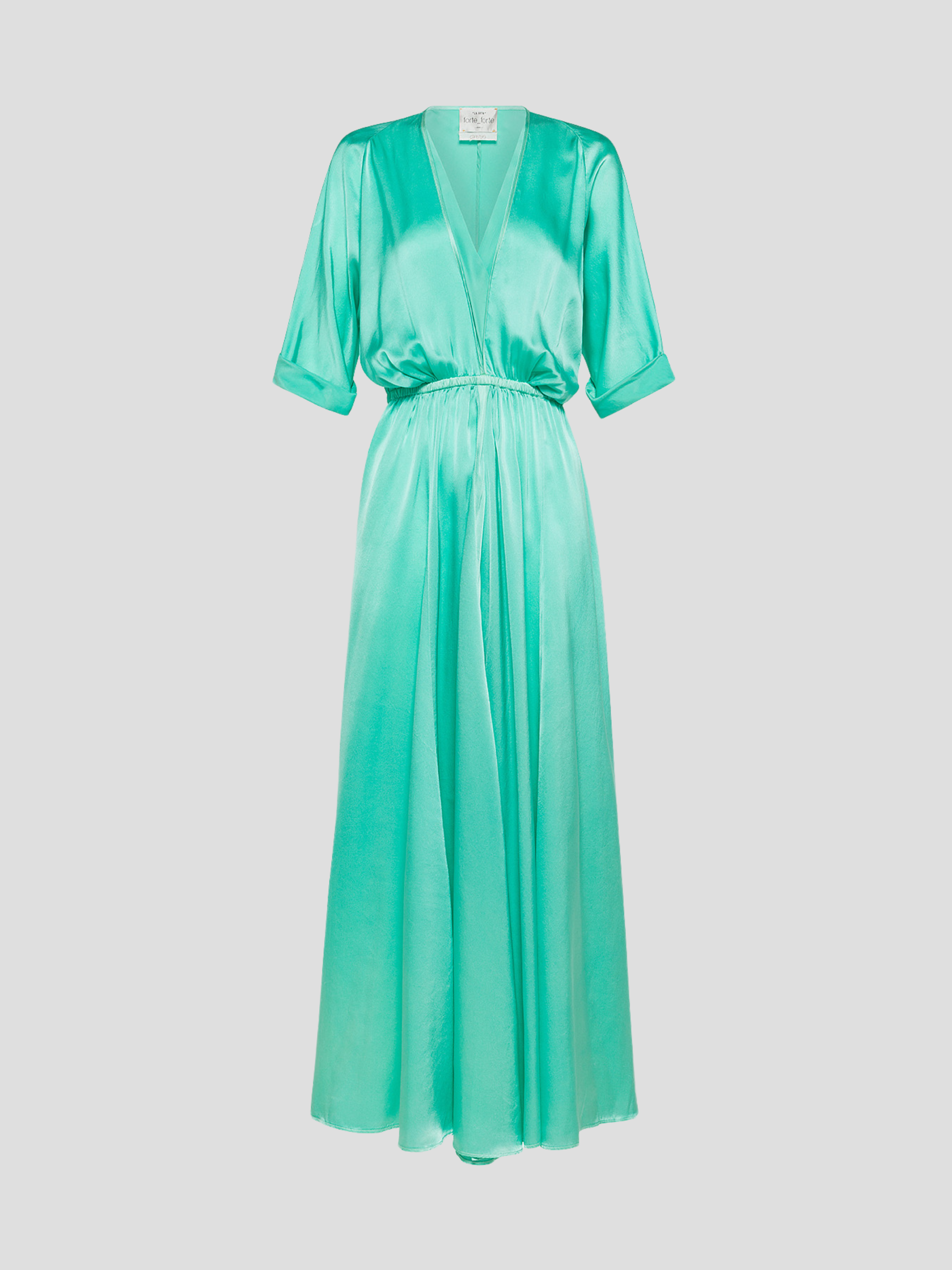Half–sleeve gown made of sumptuous silk satin. the v–neckline has been exquisitely detailed with a folded edge and raised piping. the waist has been defined with an elasticated panel and gently gathered fabric folds for a fervently feminine look. the central vent and trimmed cuffs bring an original touch to a half–sleeve dress that will prove to be a perfect partner for glamorous day–to–night dressing.