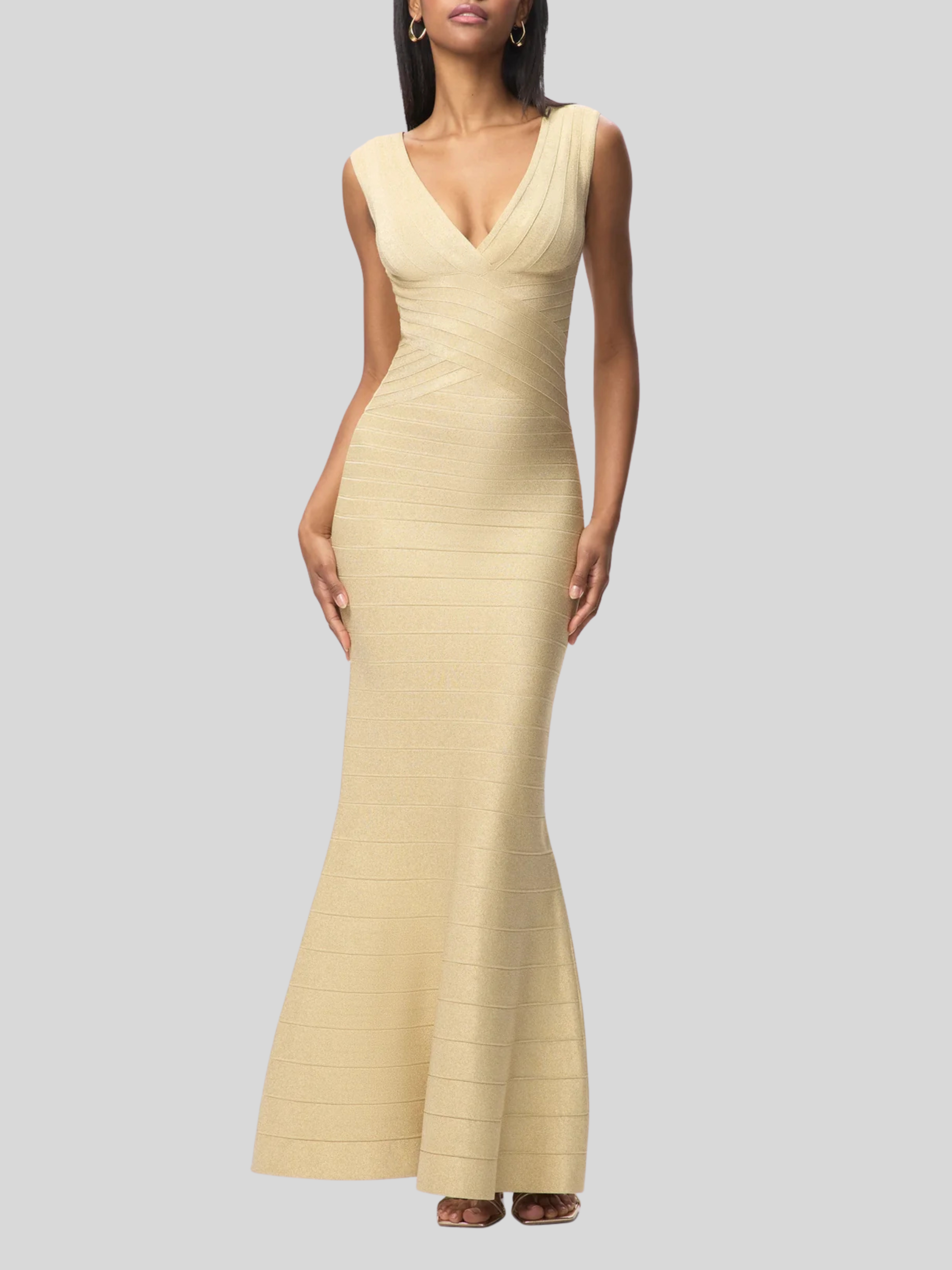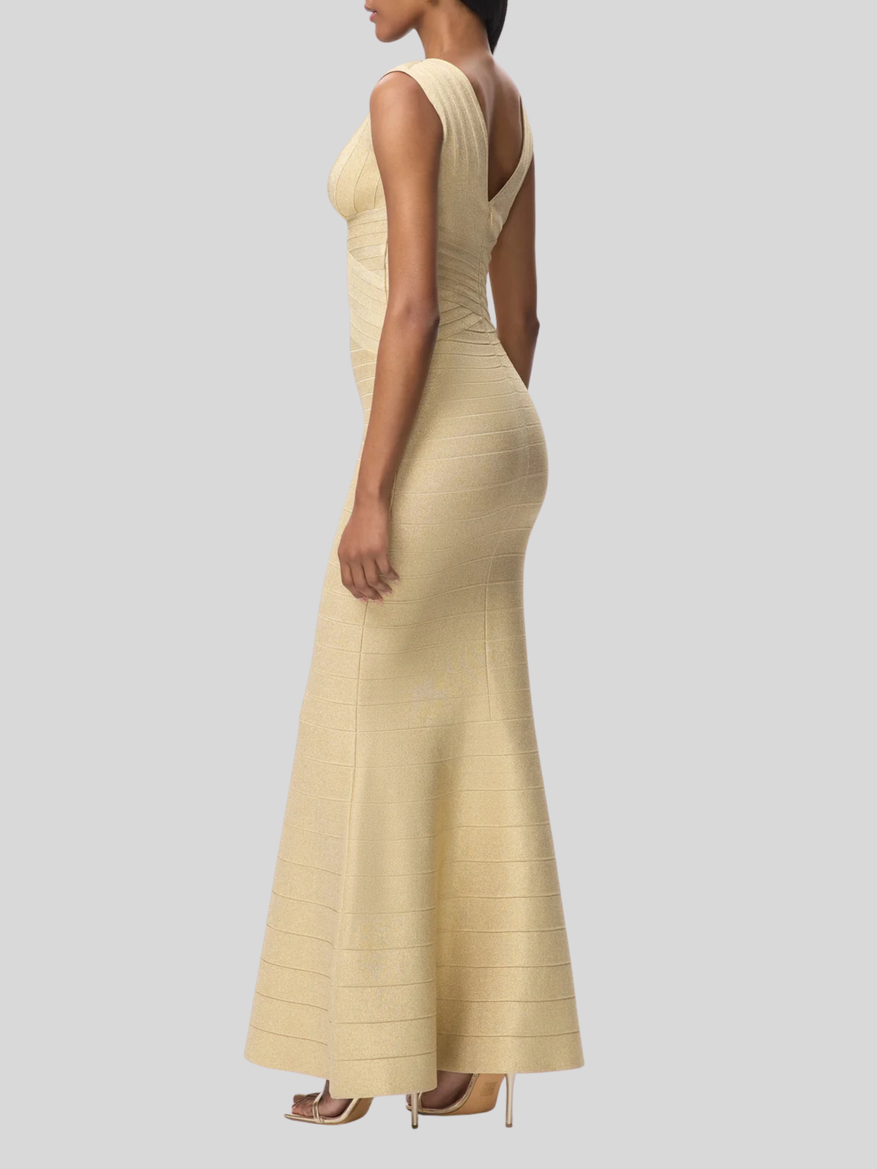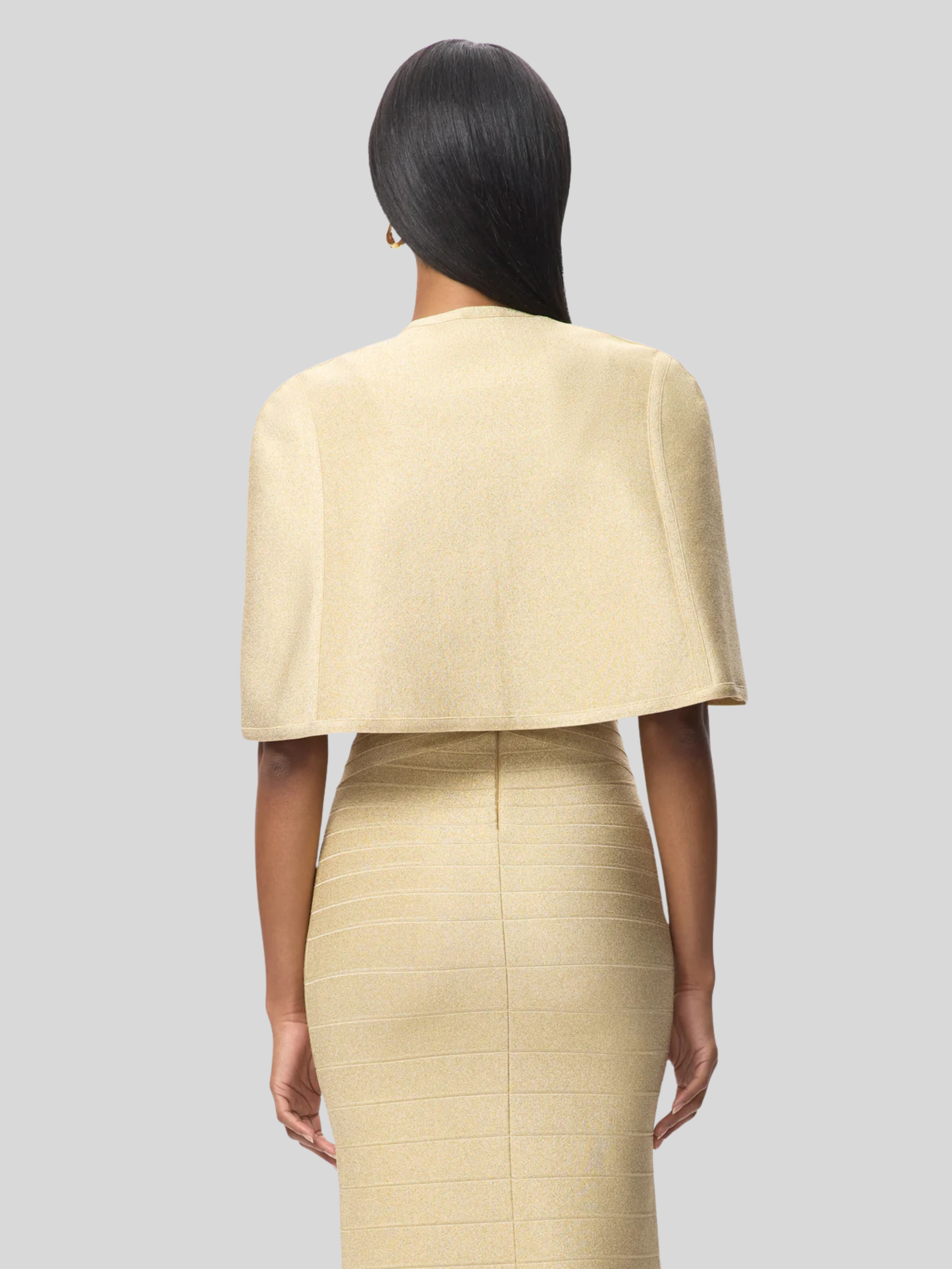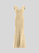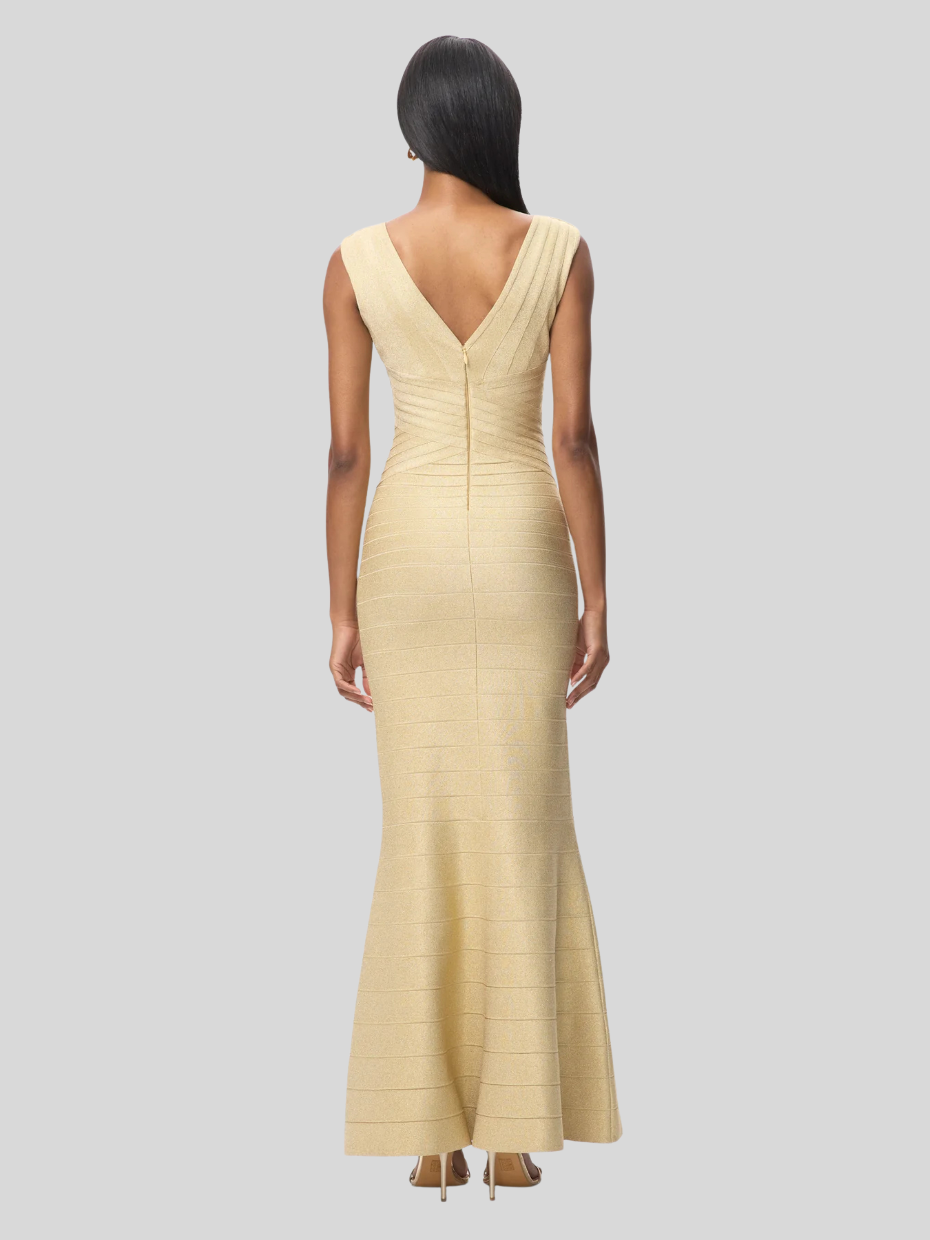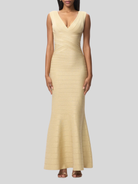 With a subtle metallic sheen in gradient bandage, the Mira Gown debuts for Resort '26. The floor-length gown features a true bandage bodice, wide V-neckline, mermaid hem and is finished with a center-back zip.