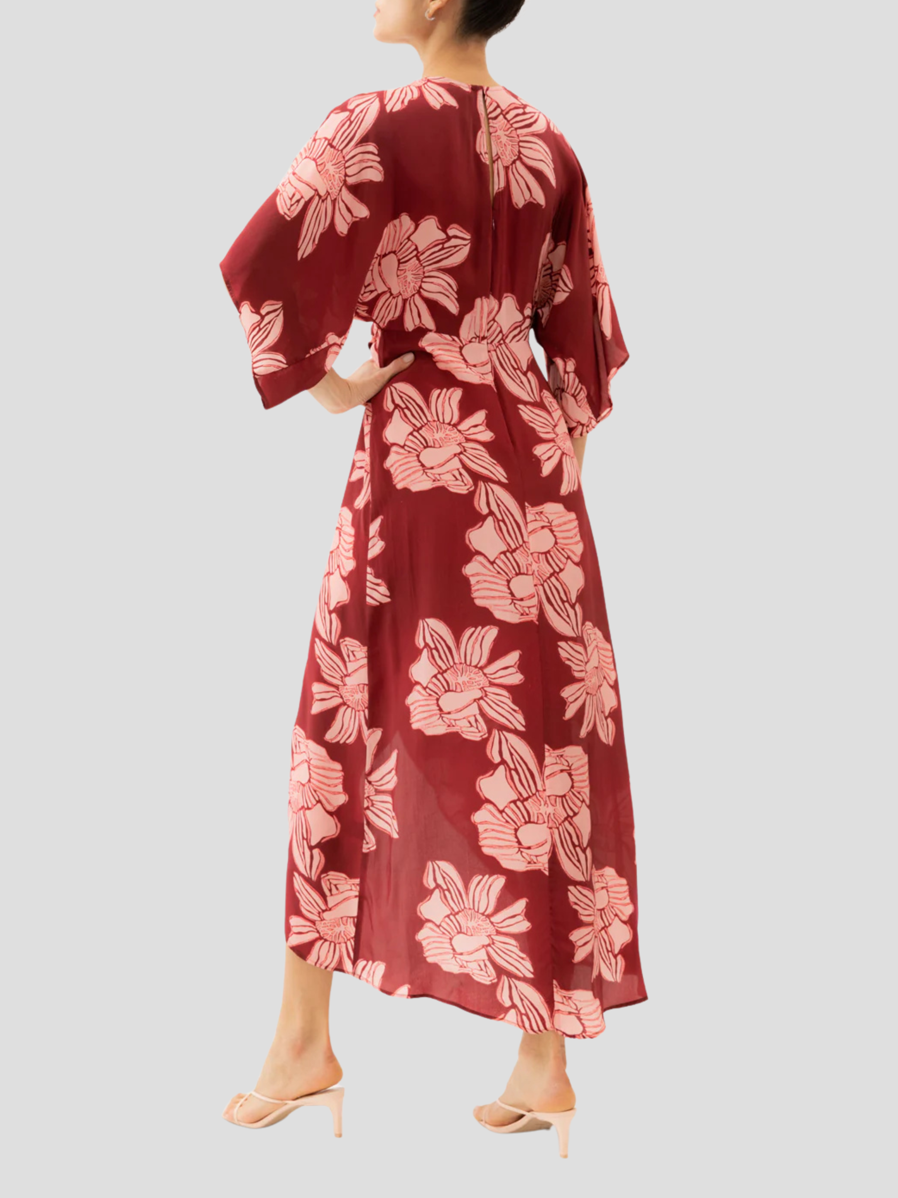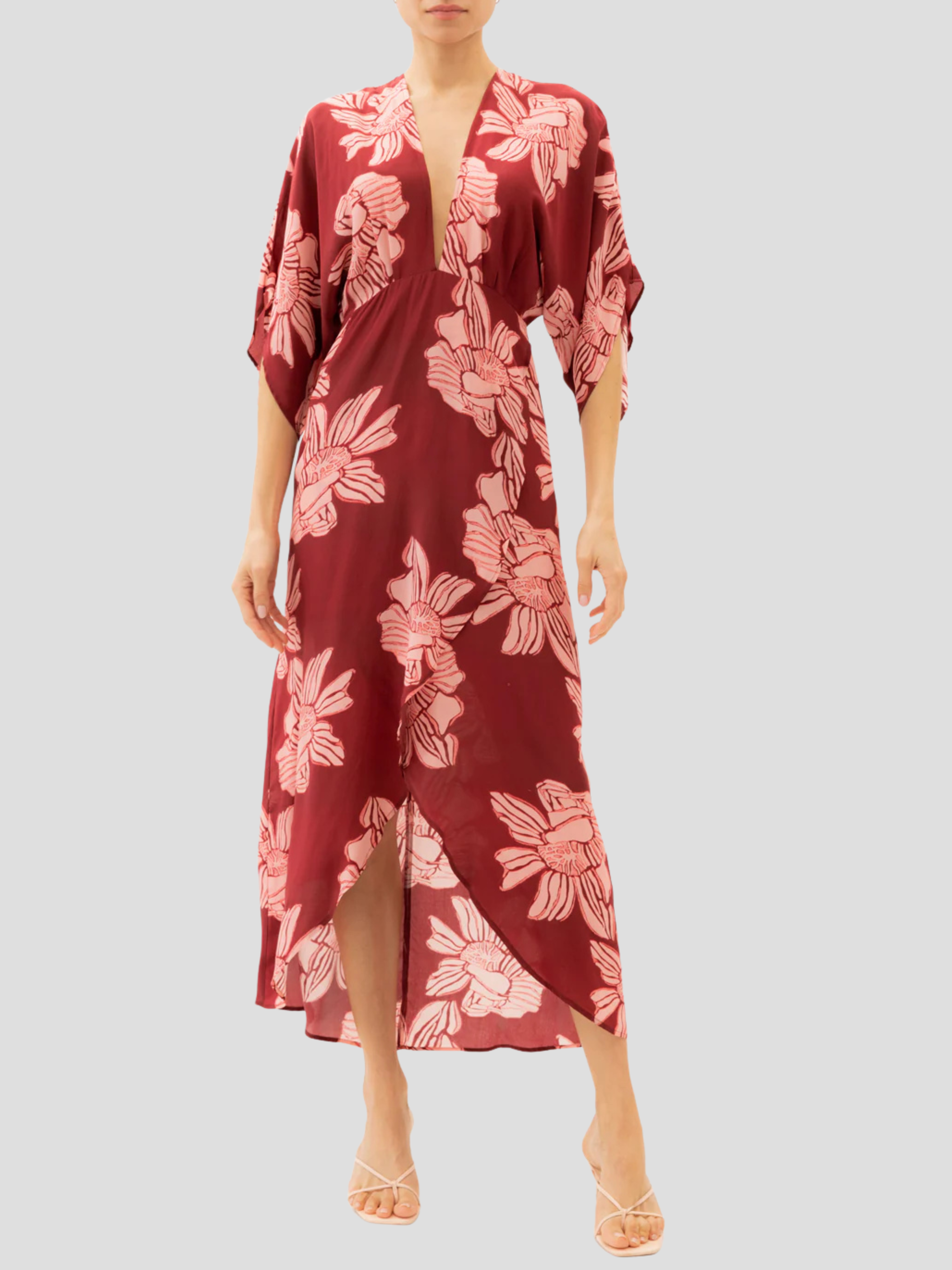 The Katherine maxi dress boasts an empire waist, a plunging neckline with a secure hook and eye closure, semi-long kimono sleeves, and a wrap-style skirt. The one-of-a-kind print is a combination of 70% cotton and 30% silk, making this airy garment ideal for any special occasion or casual event.