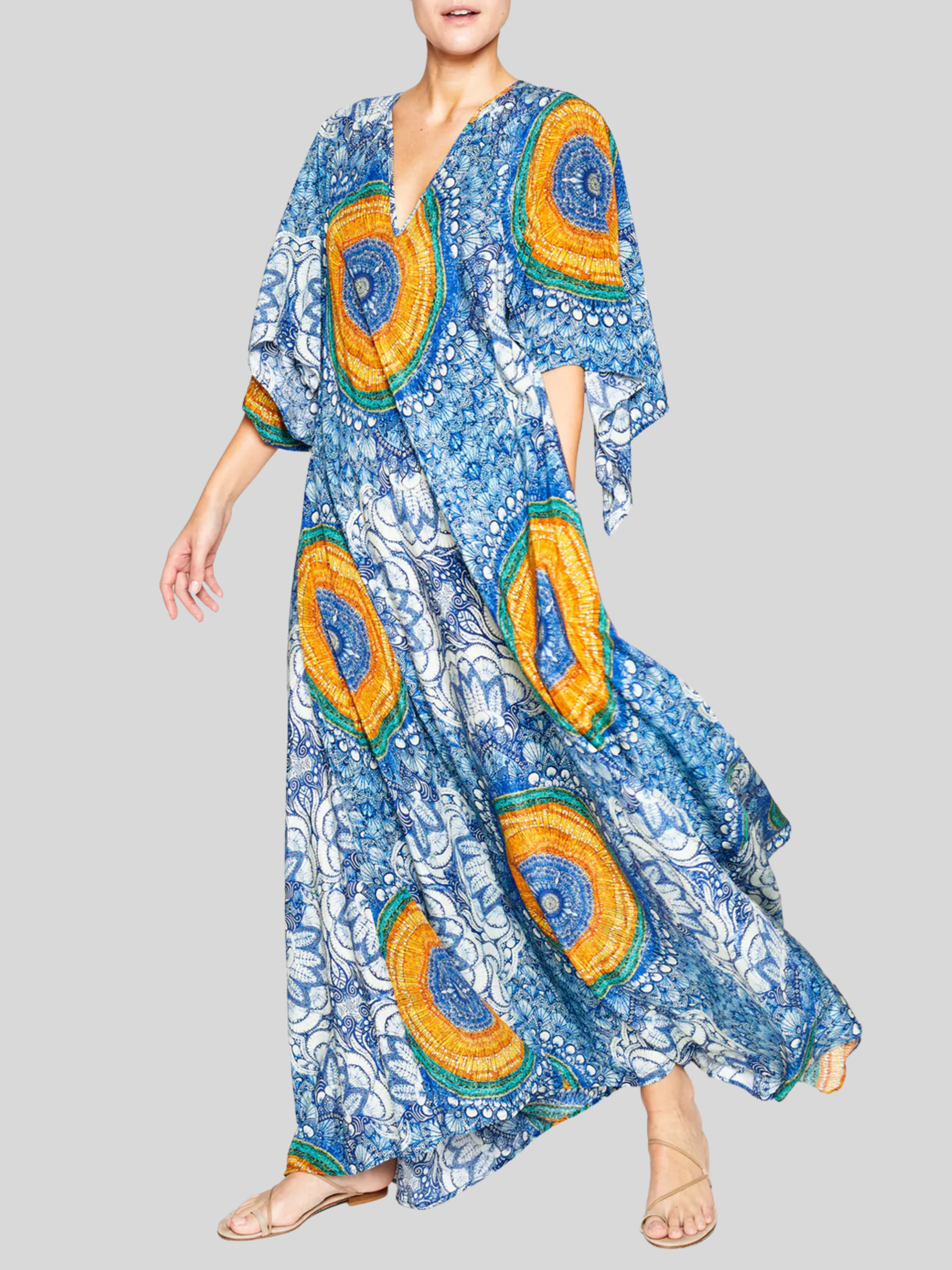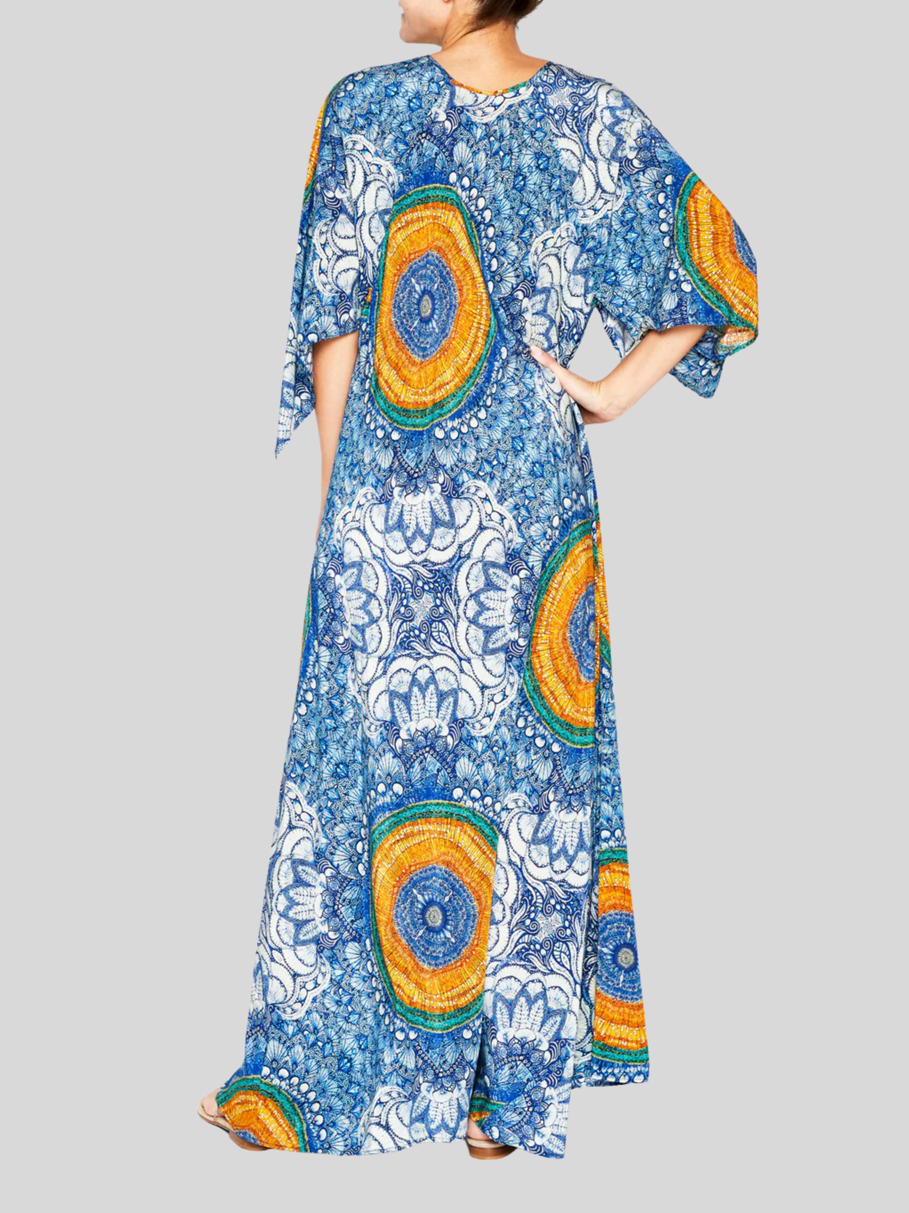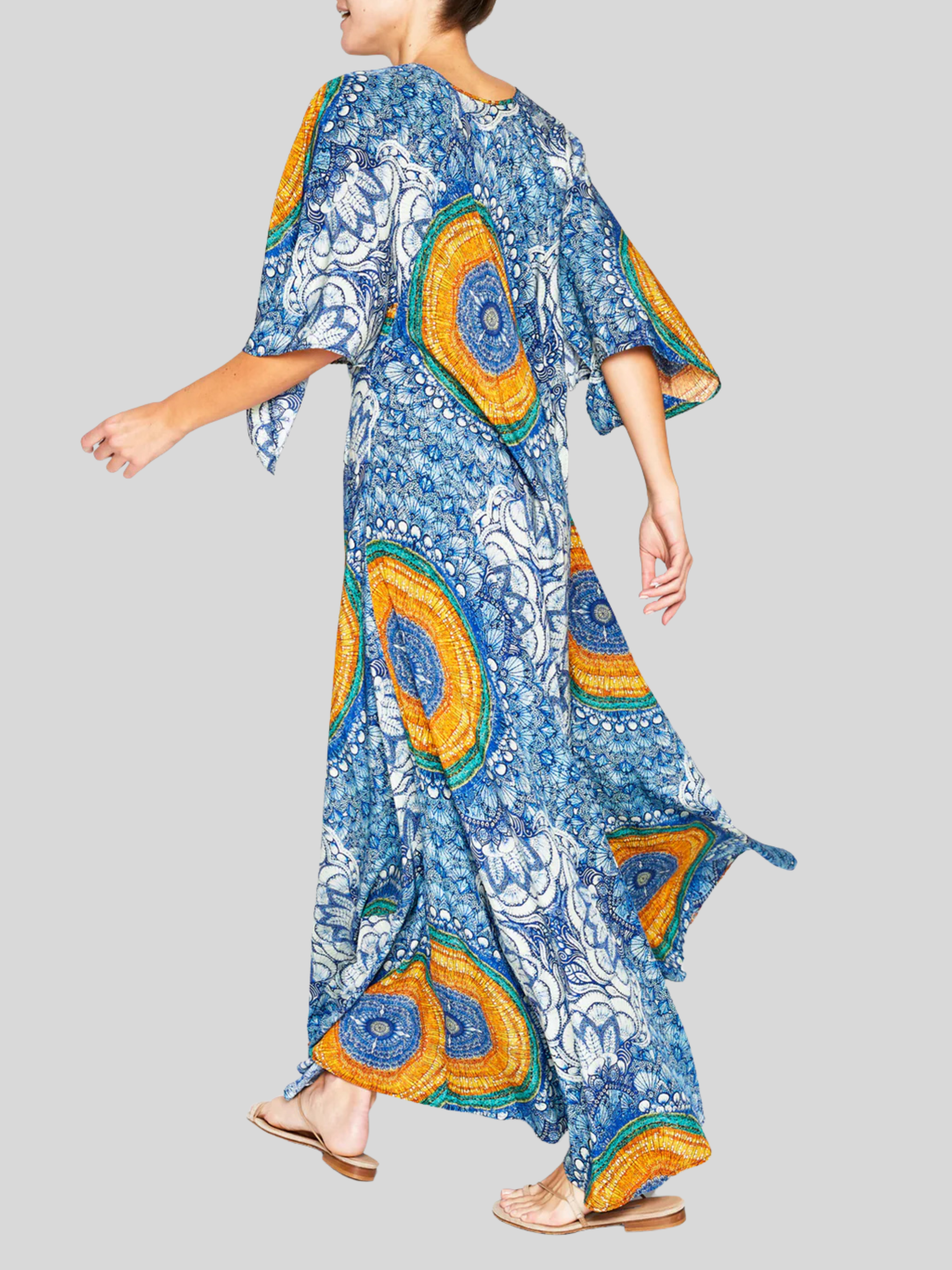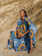 The Penelope is a flowy full-length blue Kaftan dress that features a V neckline, and scarf-shaped sleeves. This simple dress is perfect for any event.