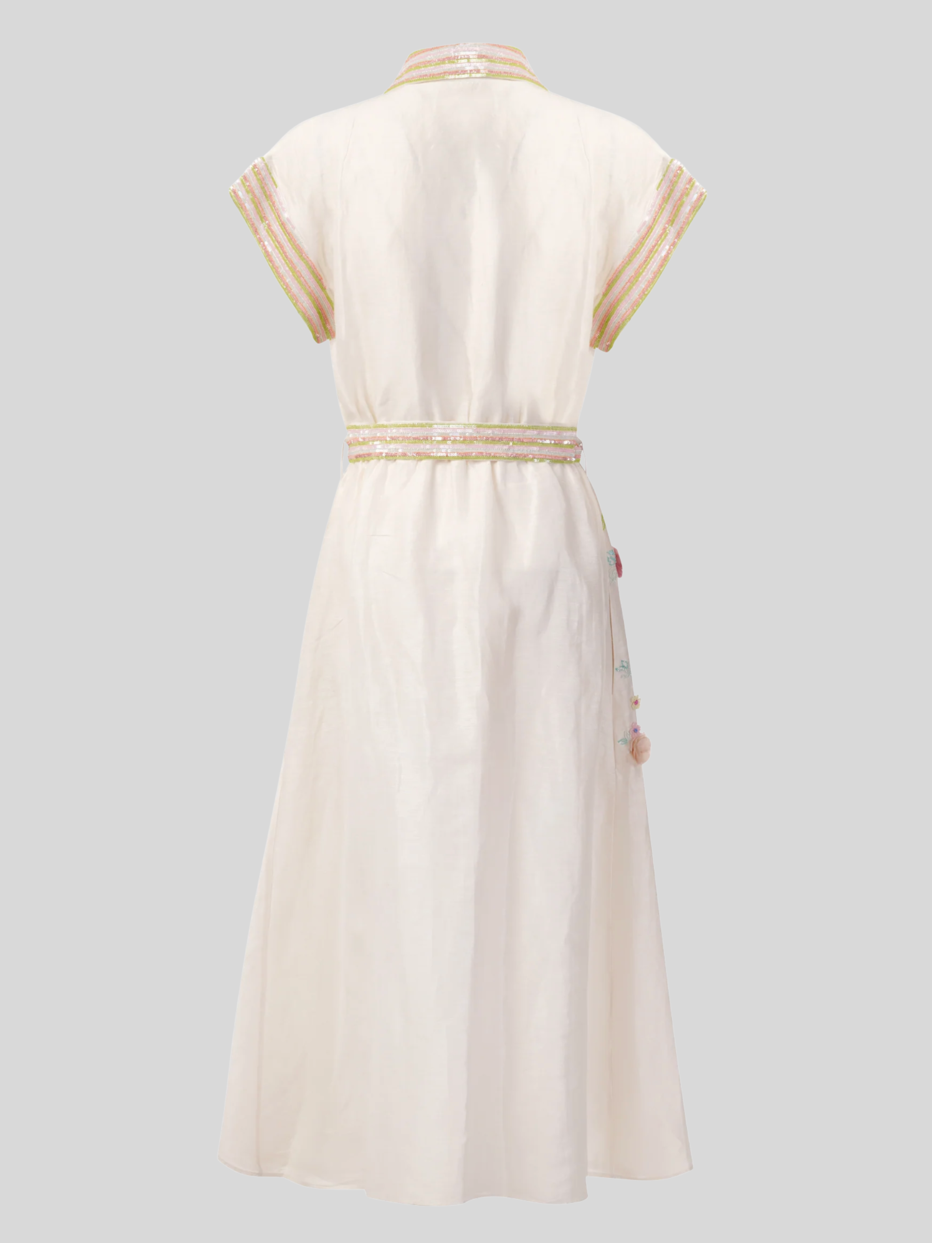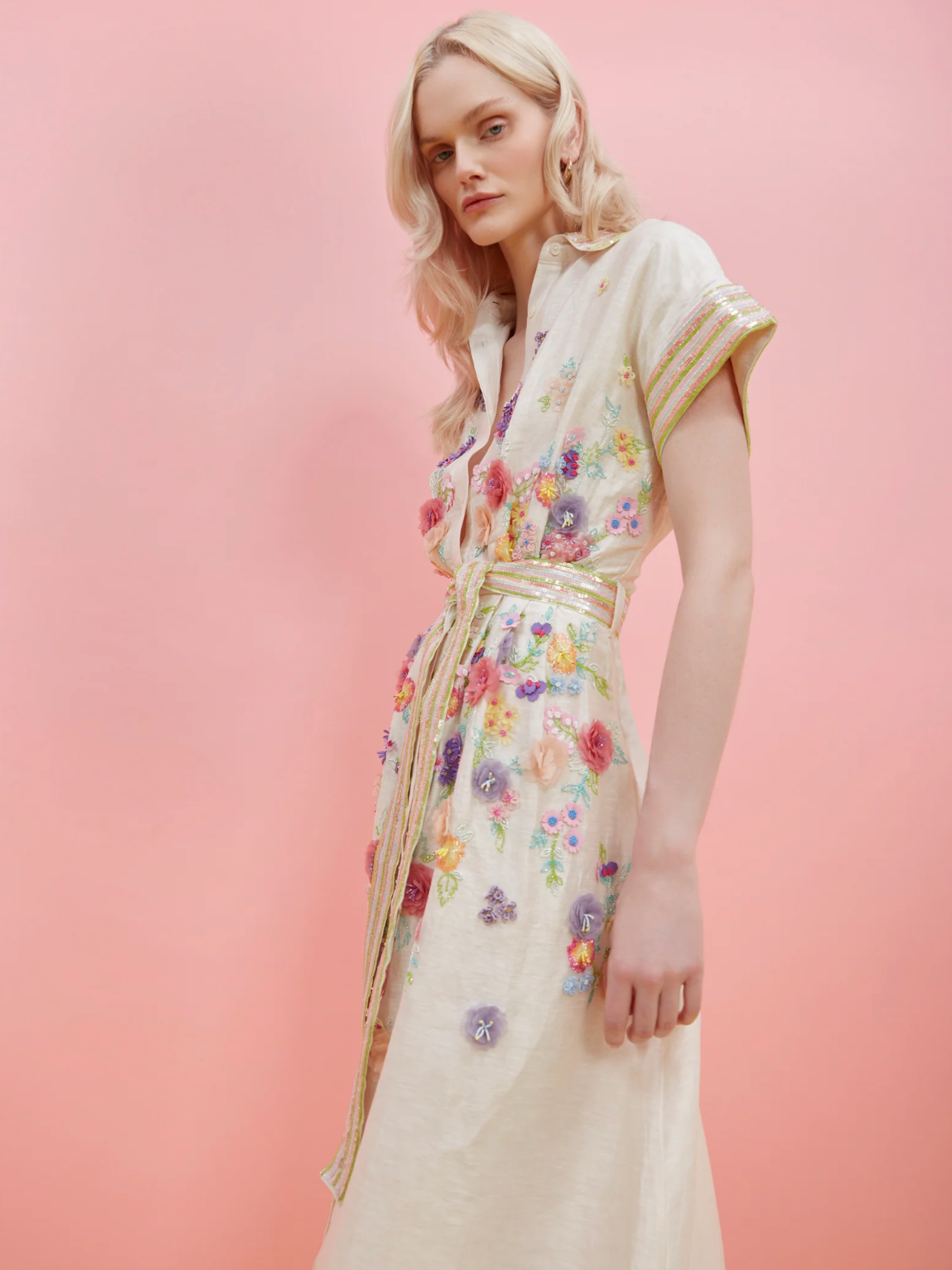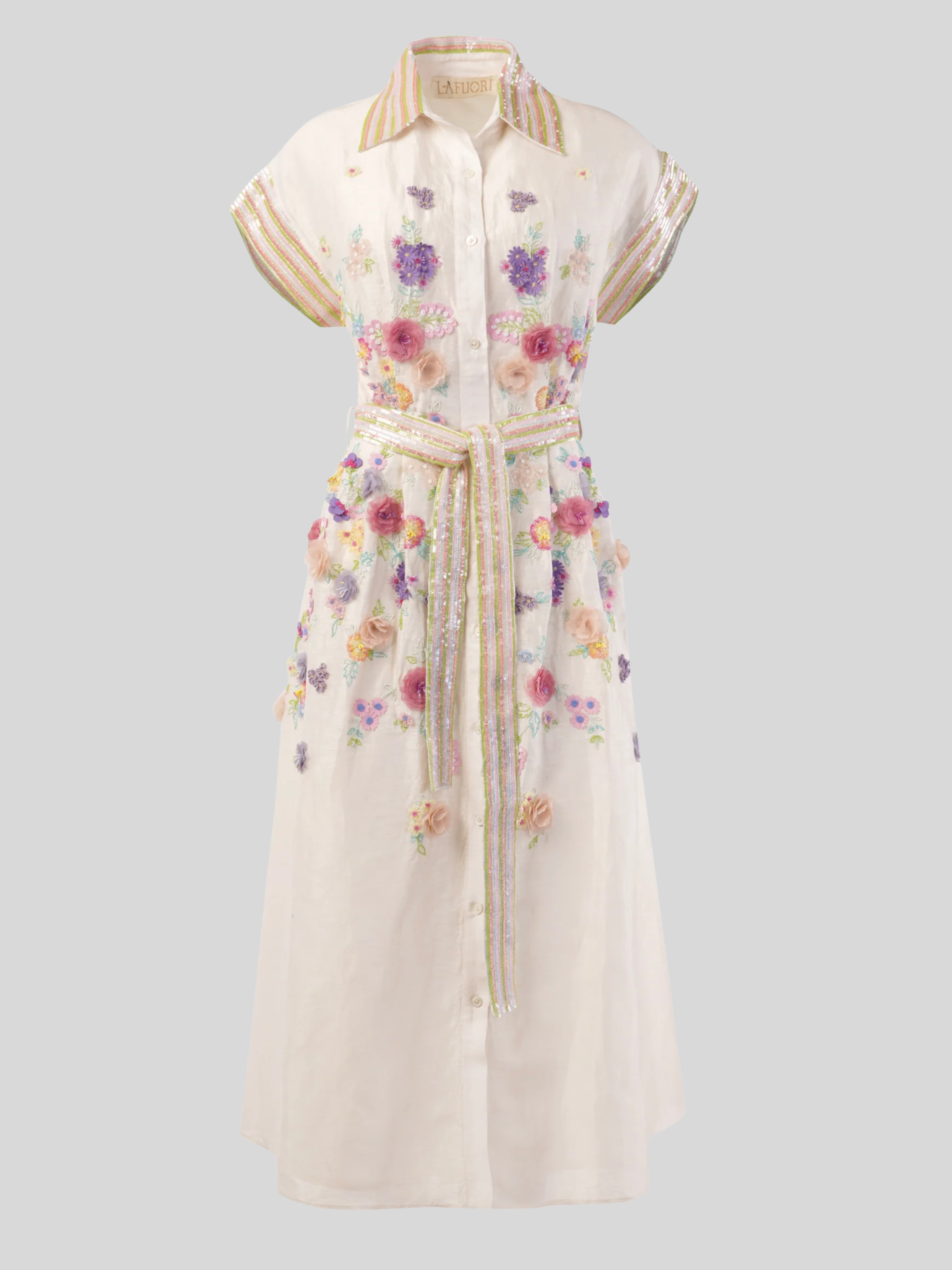 The Garden GALA Glory Ivory Shirtdress exudes airy elegance, crafted in a luxurious silk-linen organza blend. Delicate embroidery is brought to life with 3D fabric-cut florals in soft pastels, accented by subtle cut-bead detailing that adds dimension and sparkle. Light, refined, and romantic, this shirtdress is a perfect balance of sophistication and ethereal charm—ideal for warm-weather occasions and effortless statement dressing.