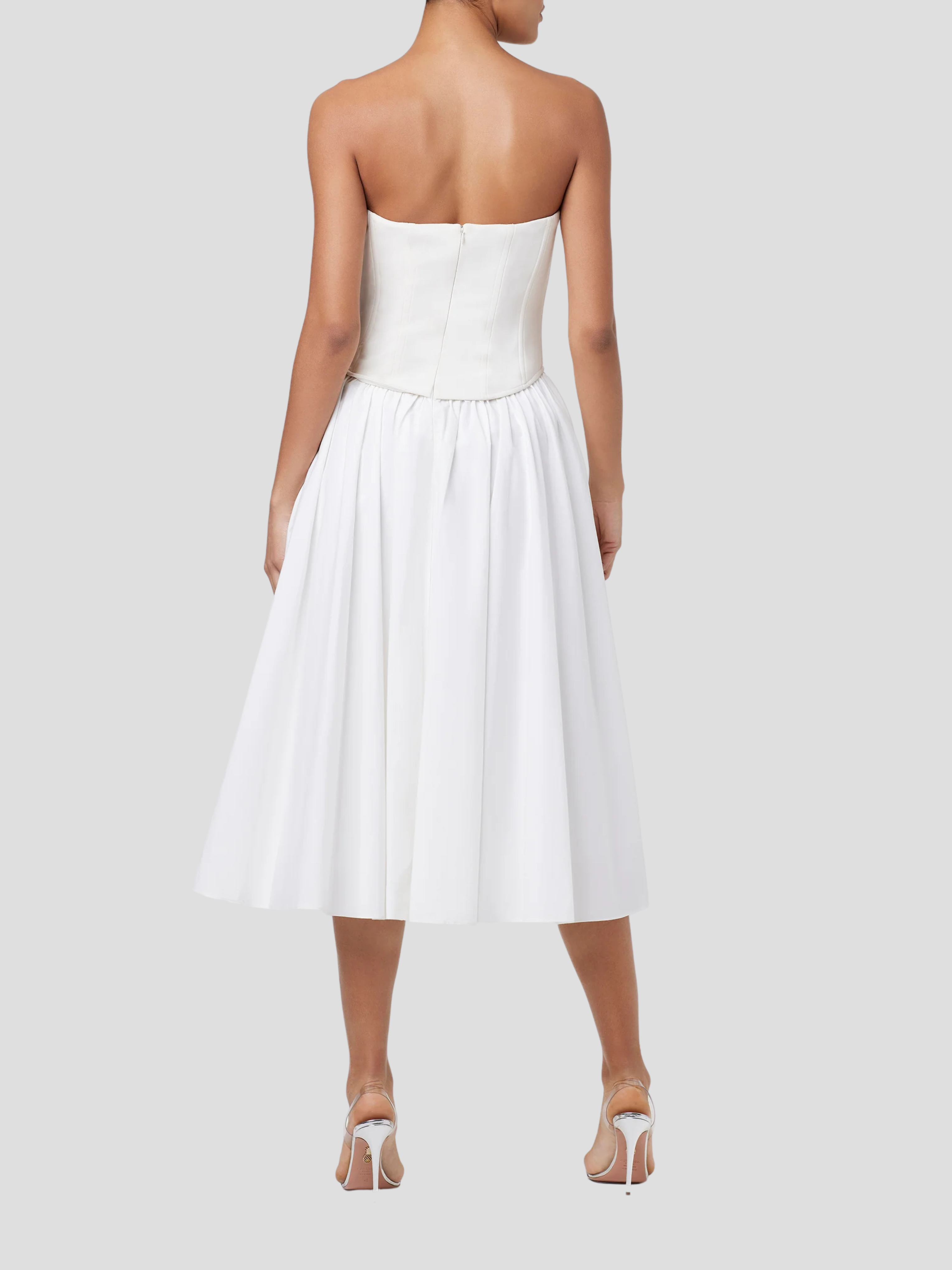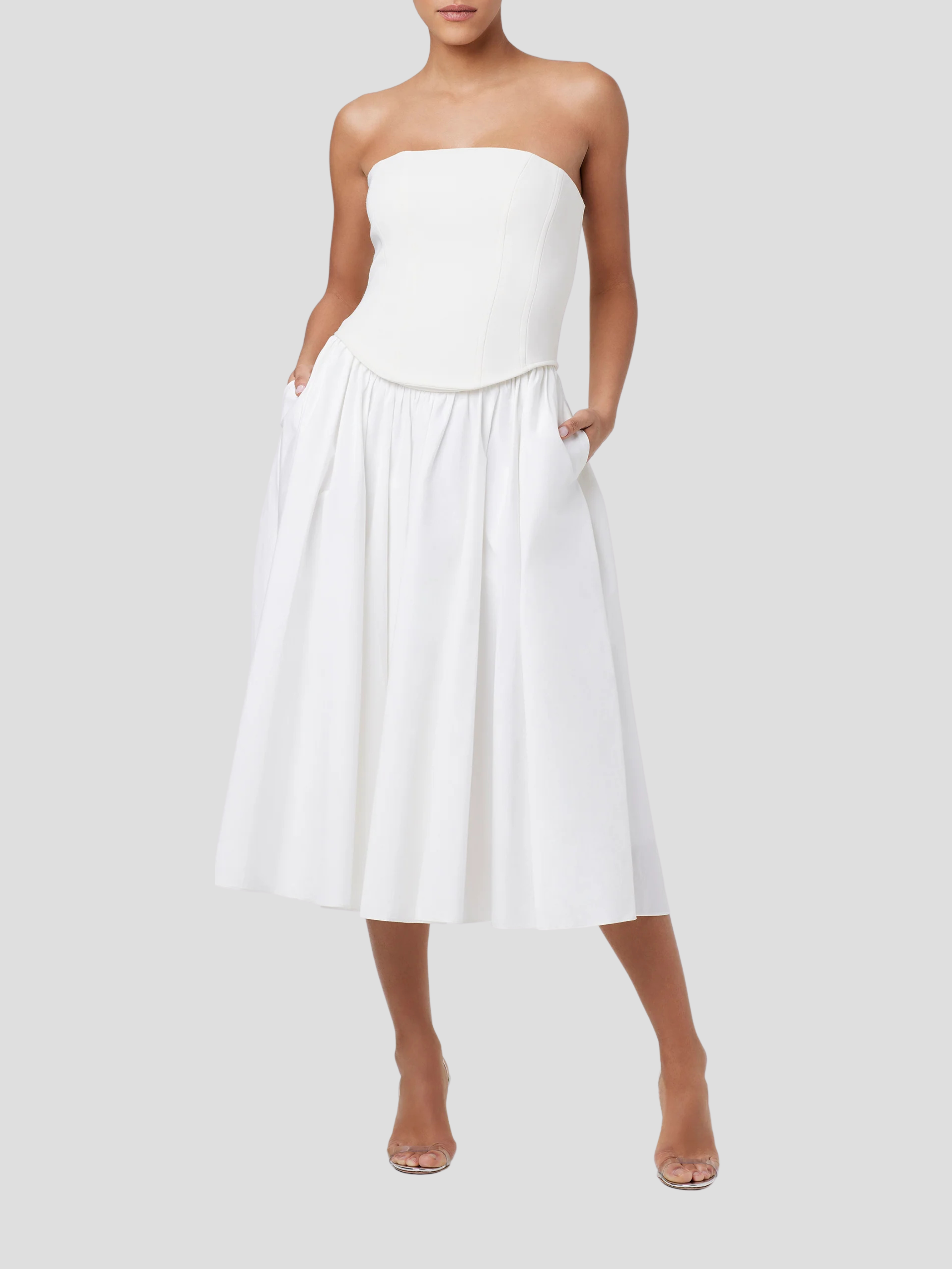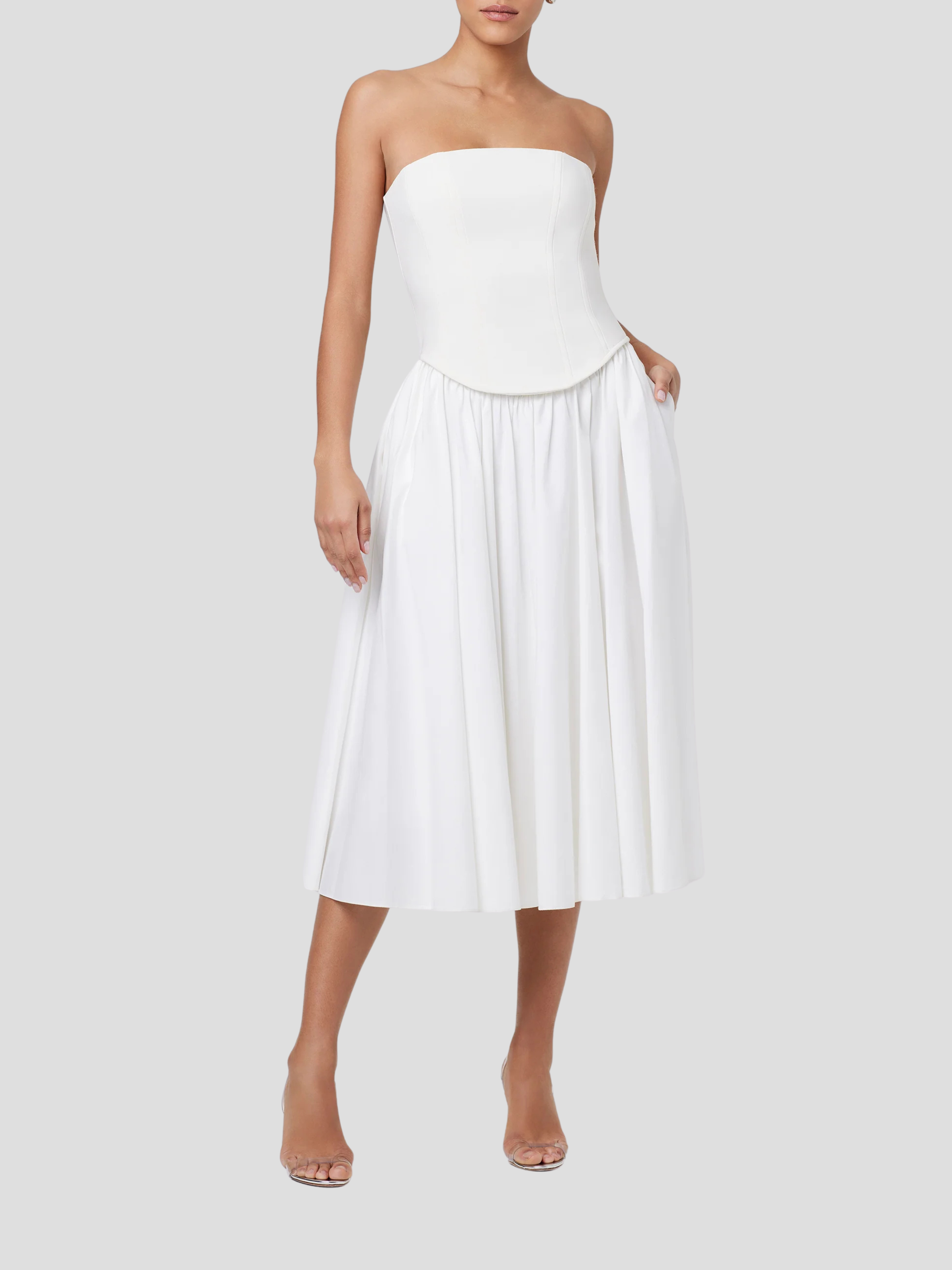 Meet the Melody. A drop waist corset combo midi dress features a strapless ivory sculpting bustier with a midi length botton poplin skirt. Style it to a T with a great necklace or jewelry for dazzling effect. A corset combo dress with a flare skirt.