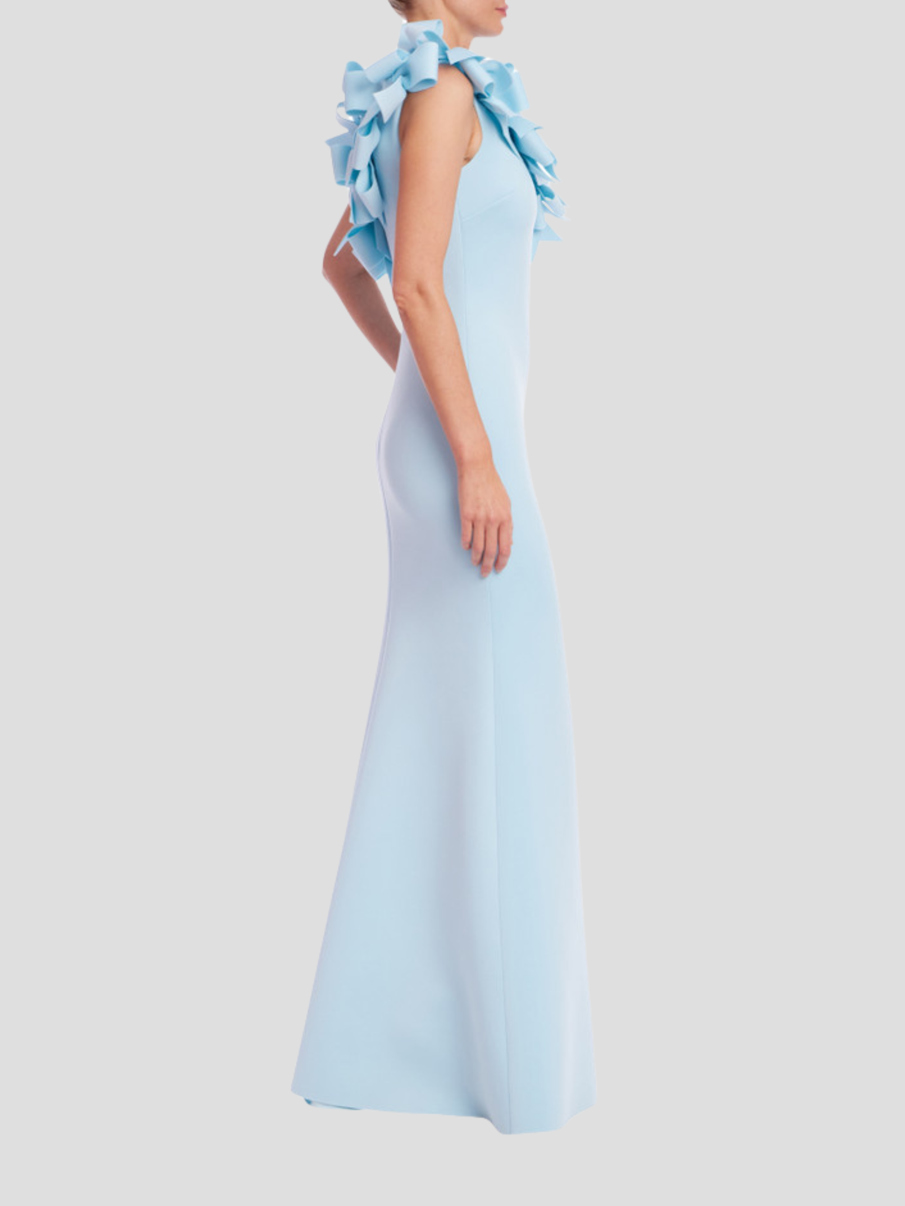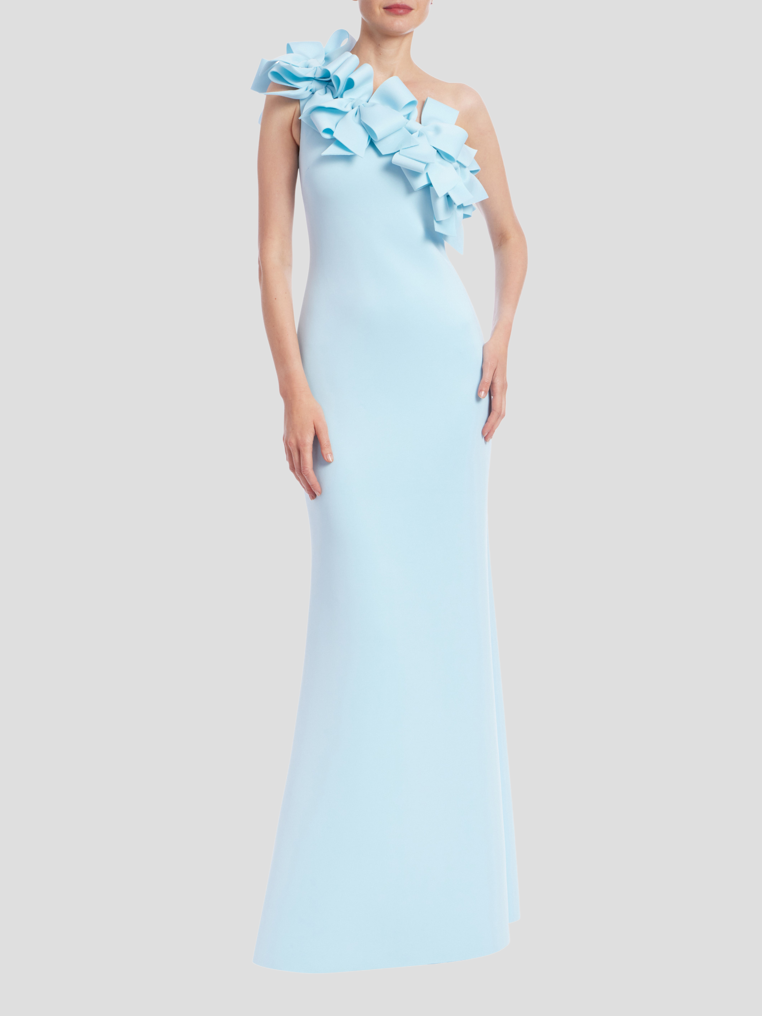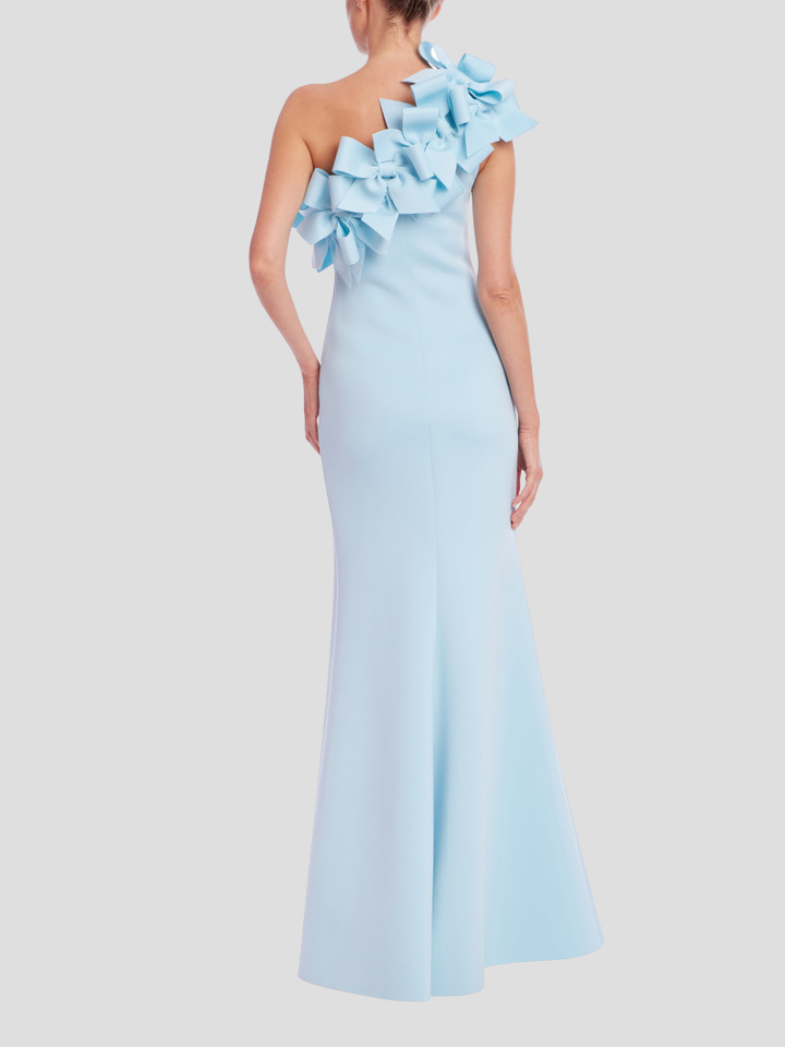 Indulge in luxury with our One Shoulder 3D Bow Gown in Hydra Blue. The delicate bow detail adds a touch of sophistication to the asymmetrical silhouette, making this gown a stand-out piece for any special occasion. Transform into a work of art with our Hydra Blue fabric, elevating your style and confidence.