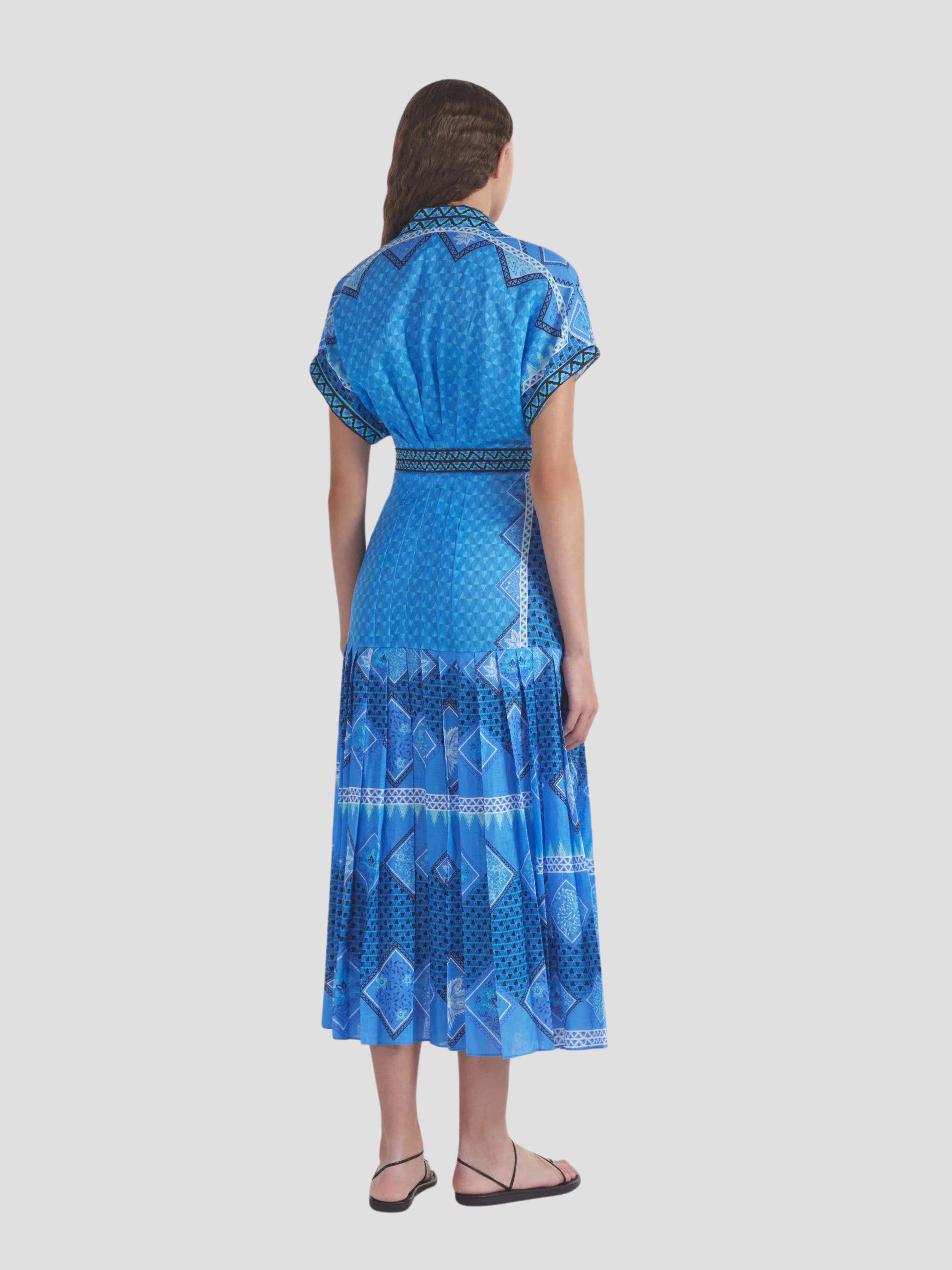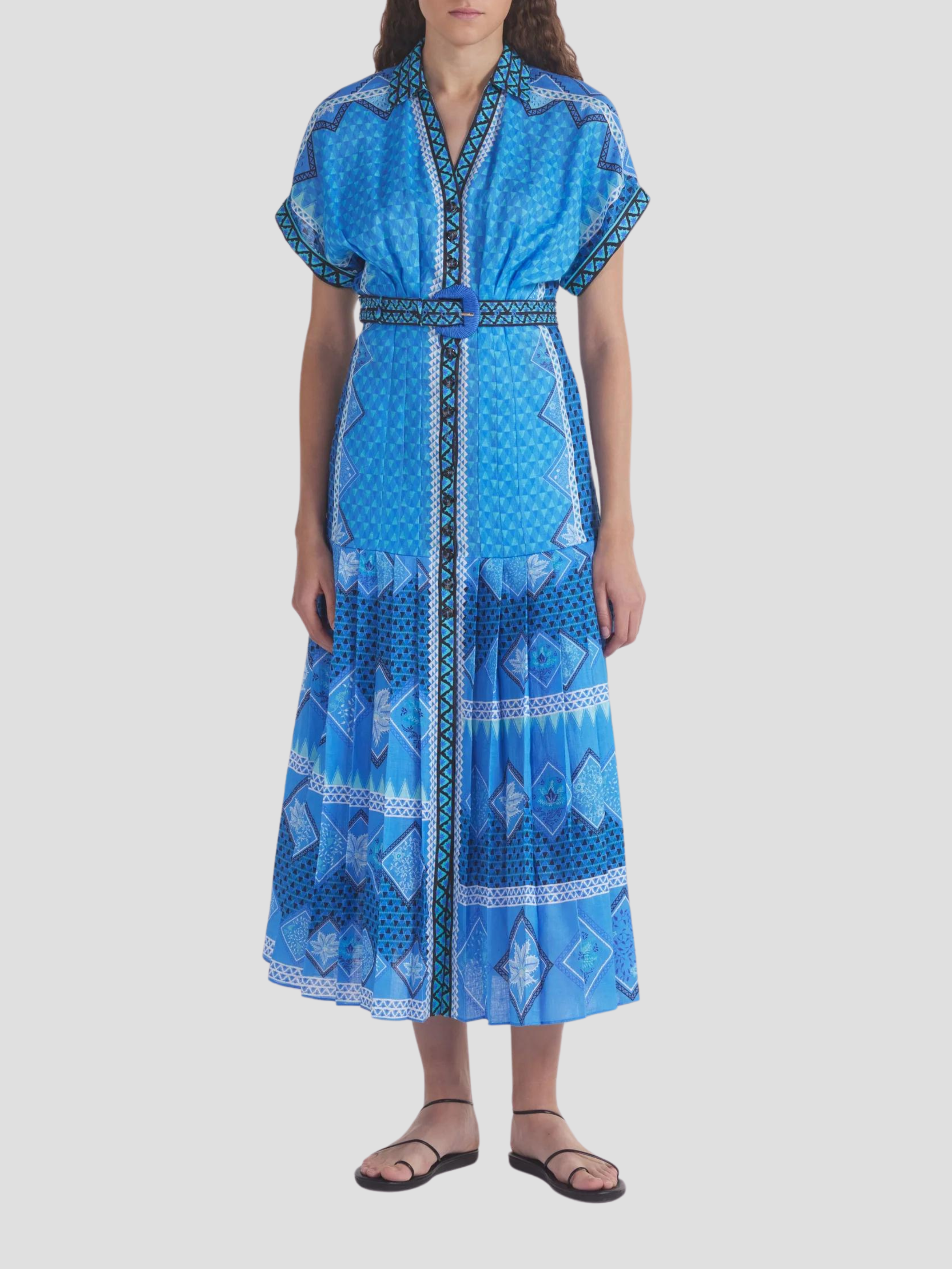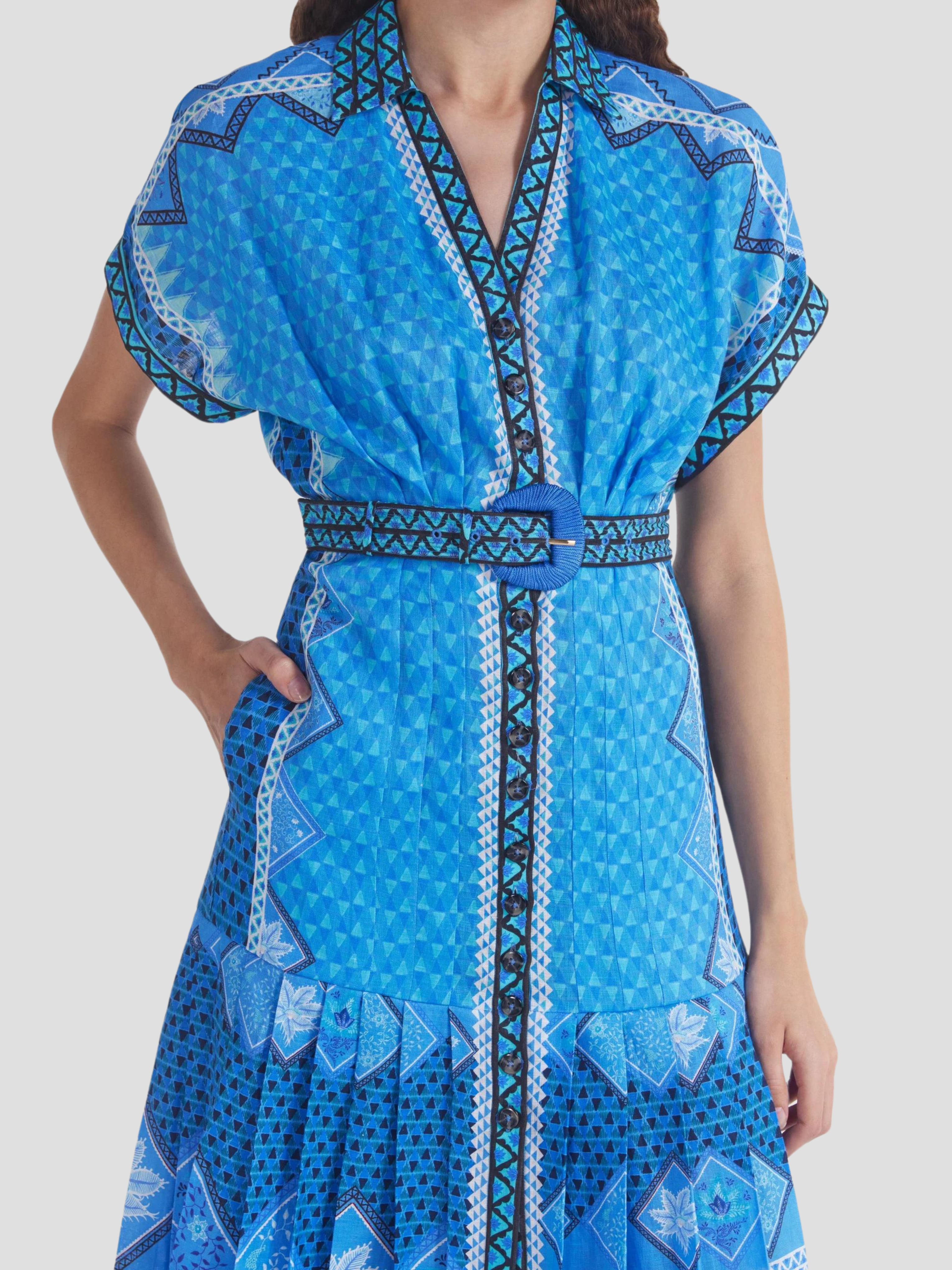 Our Riya-B Dress in Peri Verdant is an elegant shirt dress with a cinched waist and a softly pleated full skirt. Elaborate patchwork diamonds and dainty geometrics adorn the fabric, forming structural borders across the dress. A unique summer piece that effortlessly combines comfort and modern design.