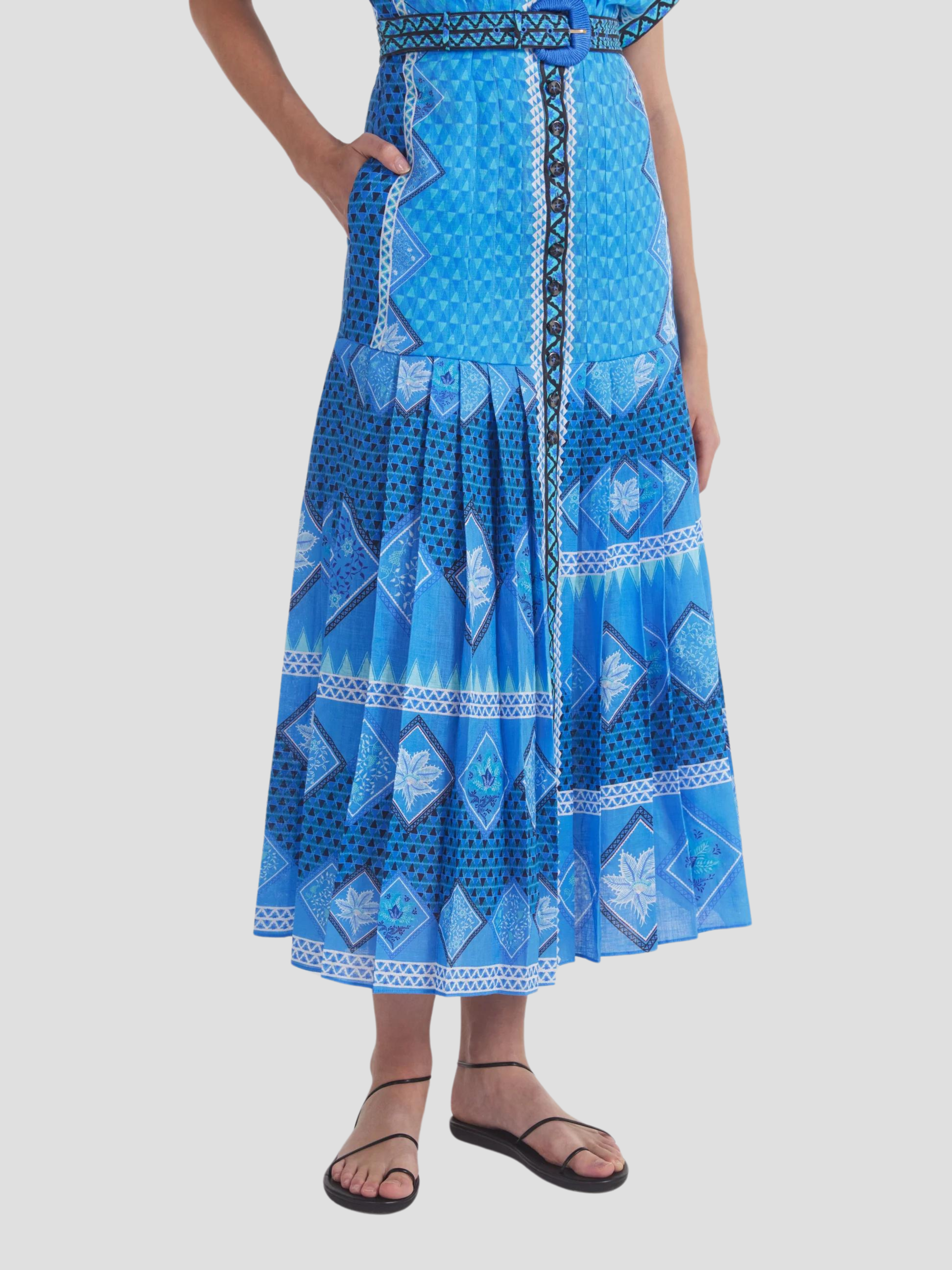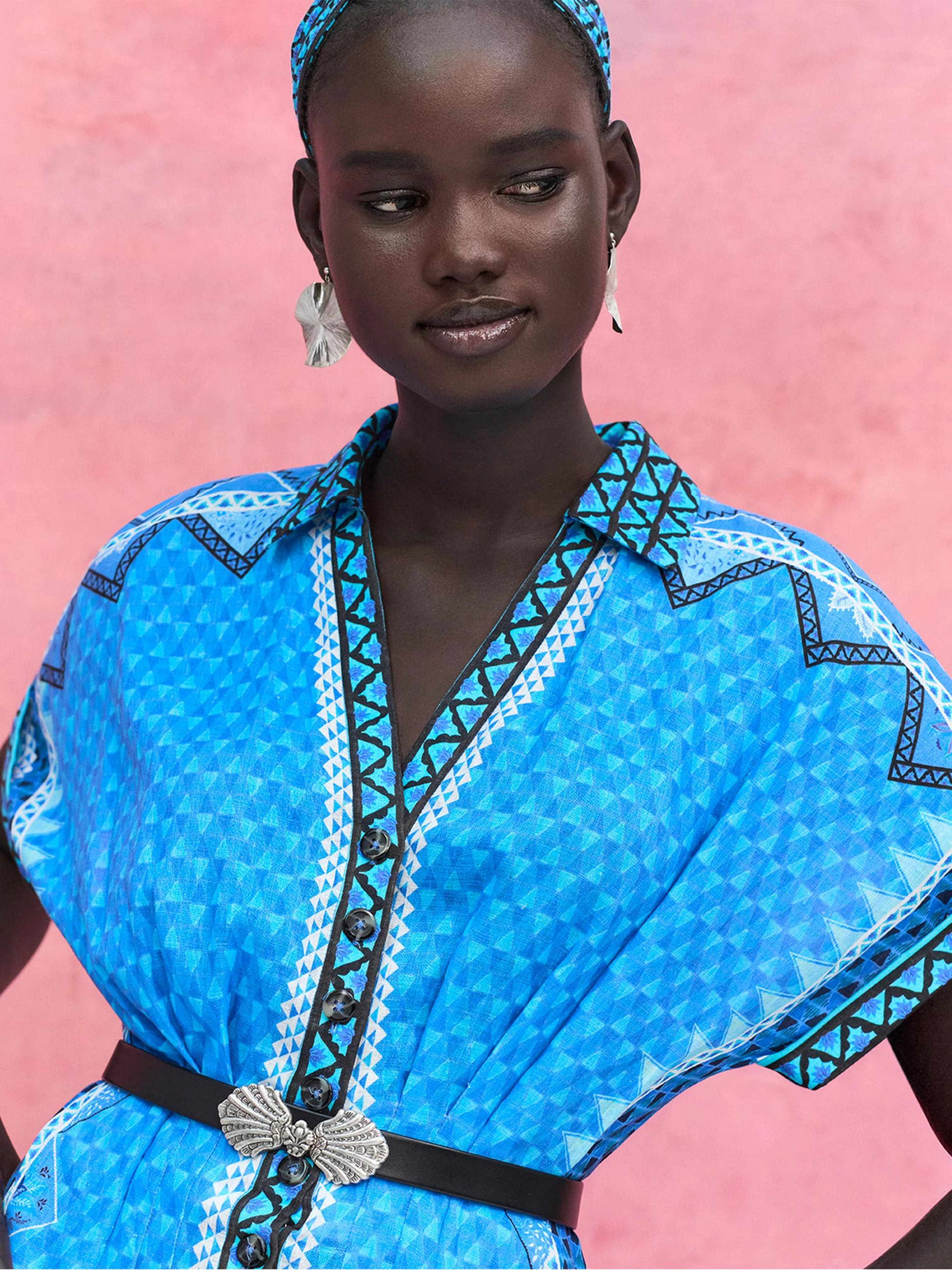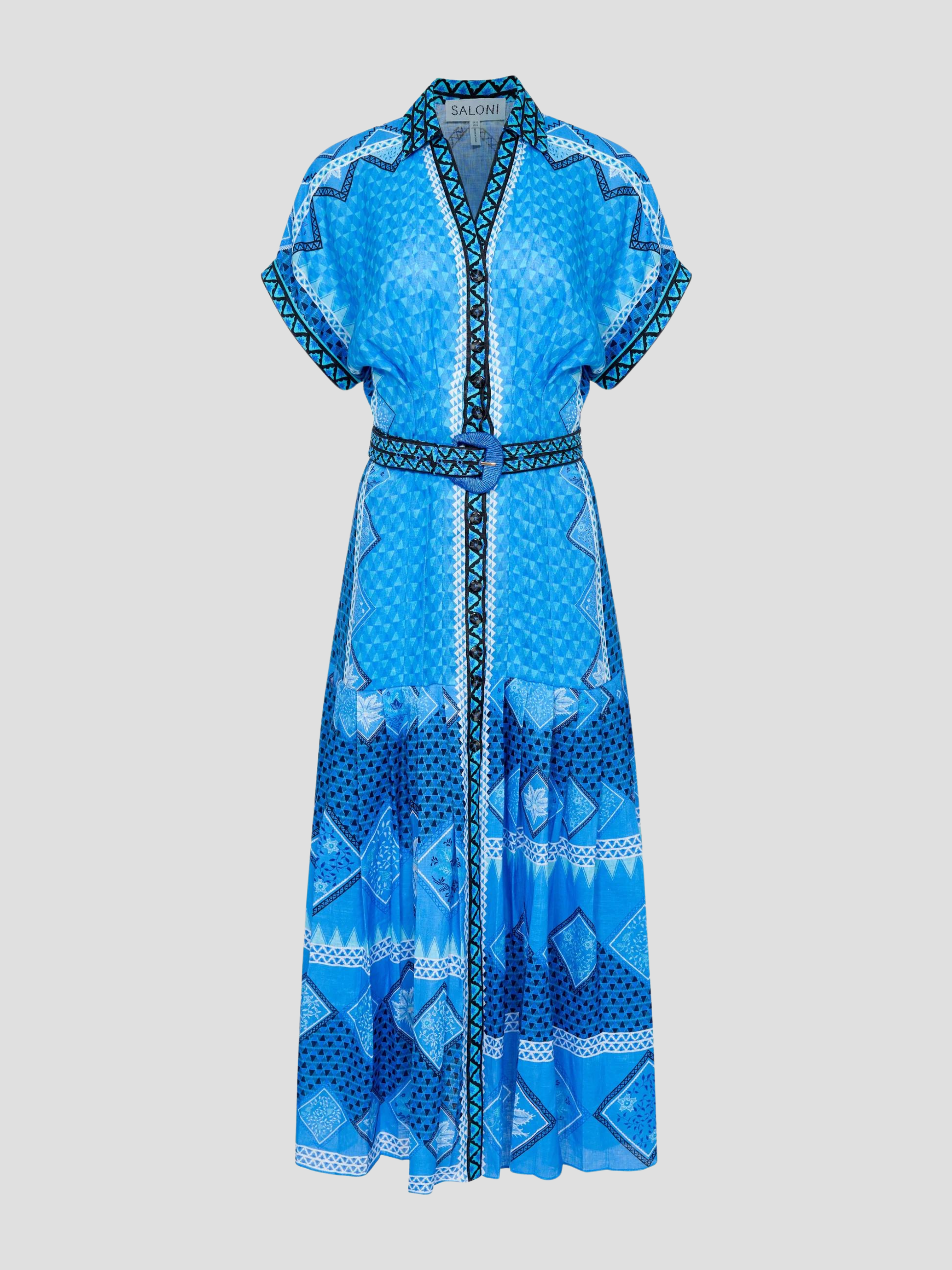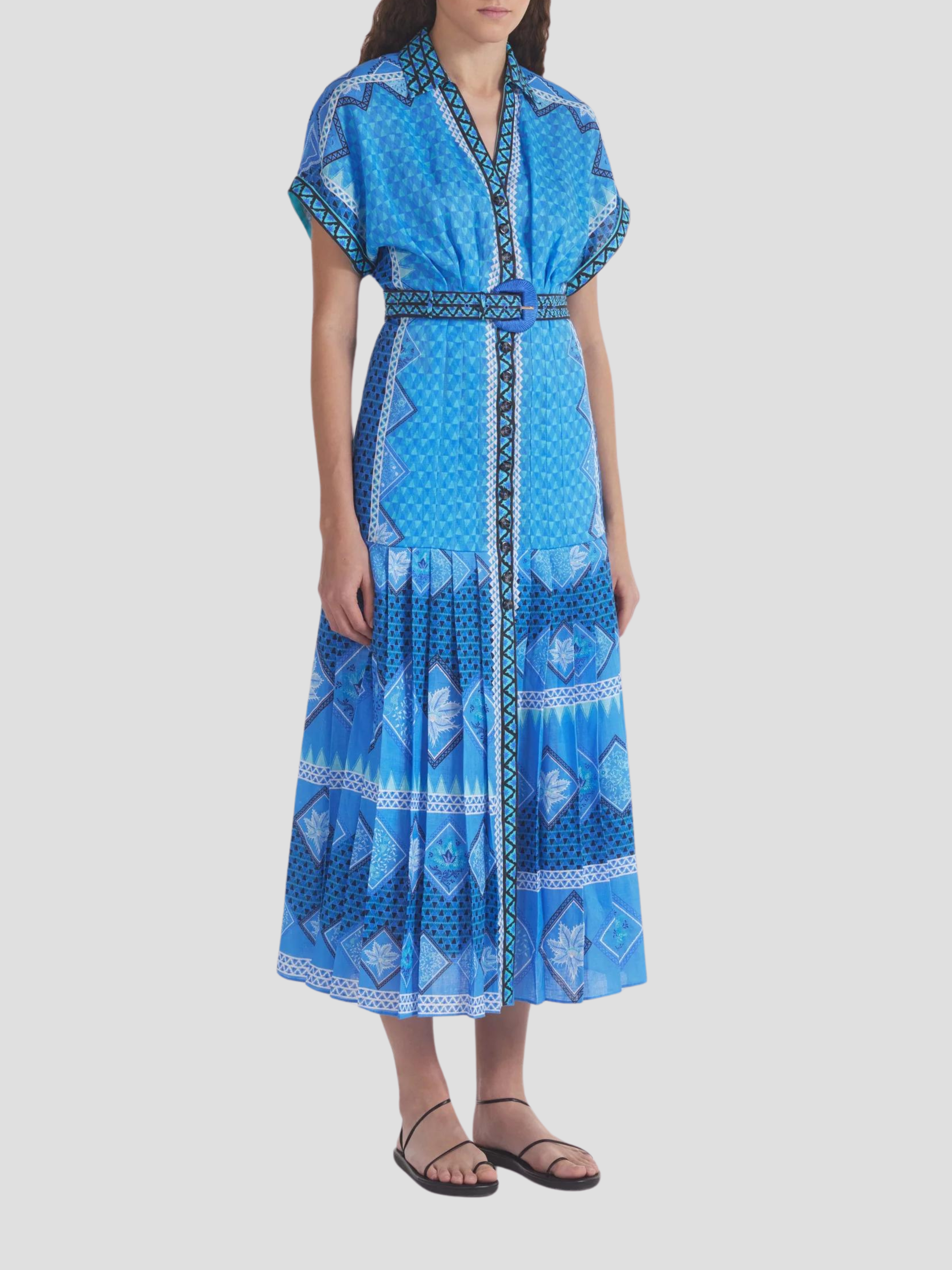 Our Riya-B Dress in Peri Verdant is an elegant shirt dress with a cinched waist and a softly pleated full skirt. Elaborate patchwork diamonds and dainty geometrics adorn the fabric, forming structural borders across the dress. A unique summer piece that effortlessly combines comfort and modern design.