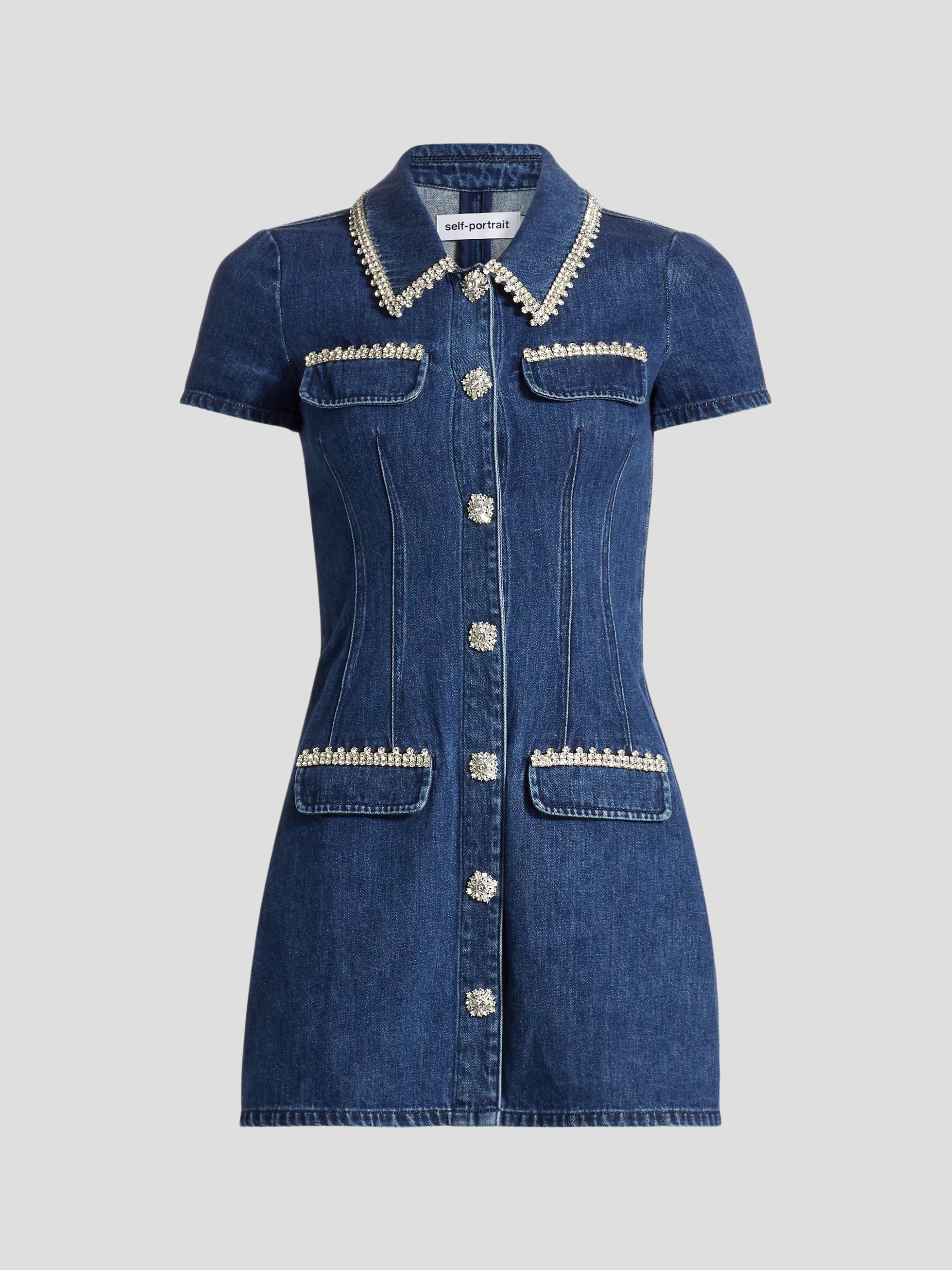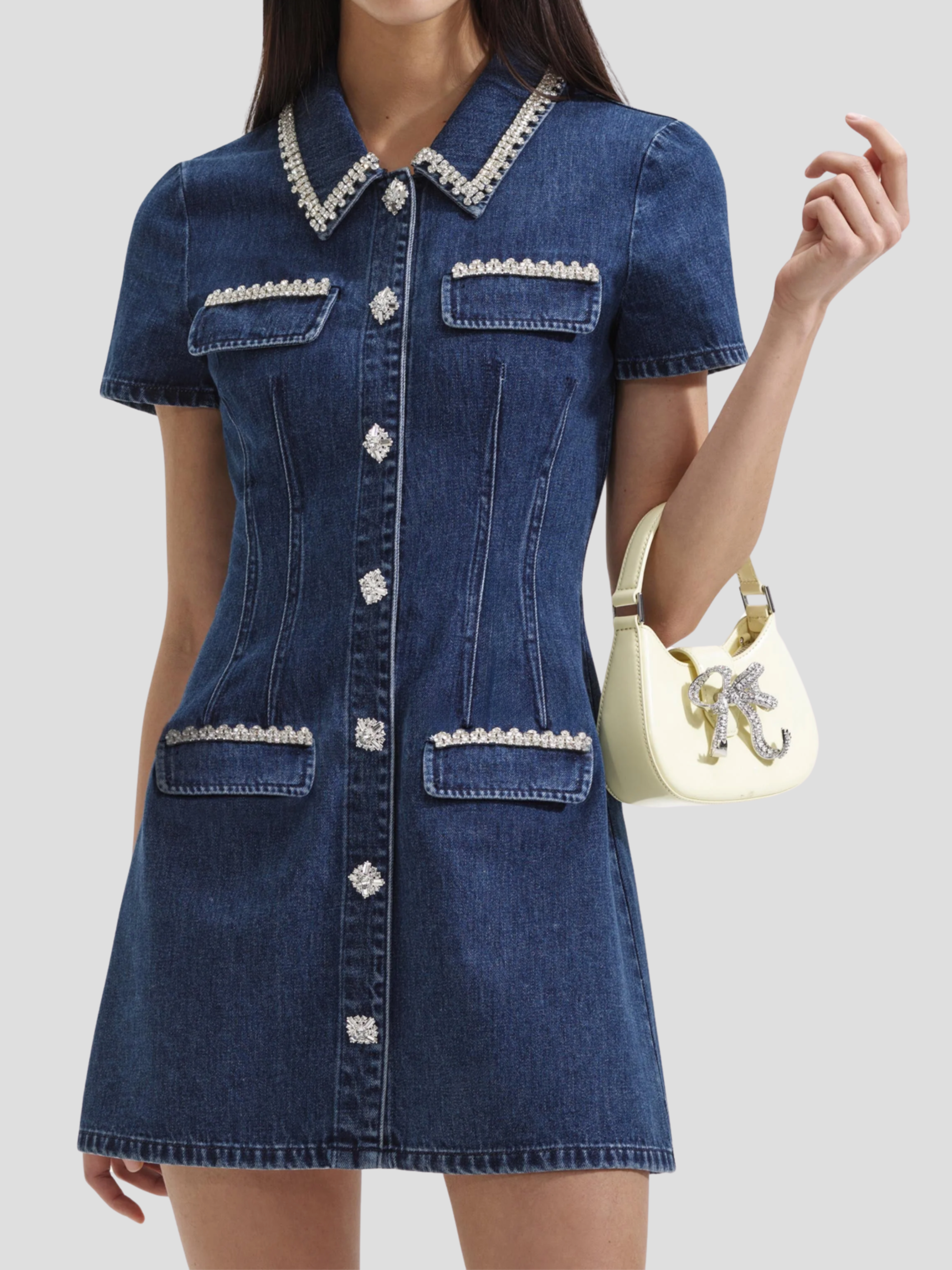 Diamanté accents elevate this fitted denim mini, which can be effortlessly worn from day to night. Style it with Mary Janes or boots for daytime chic and pair with stilettos for date night.
