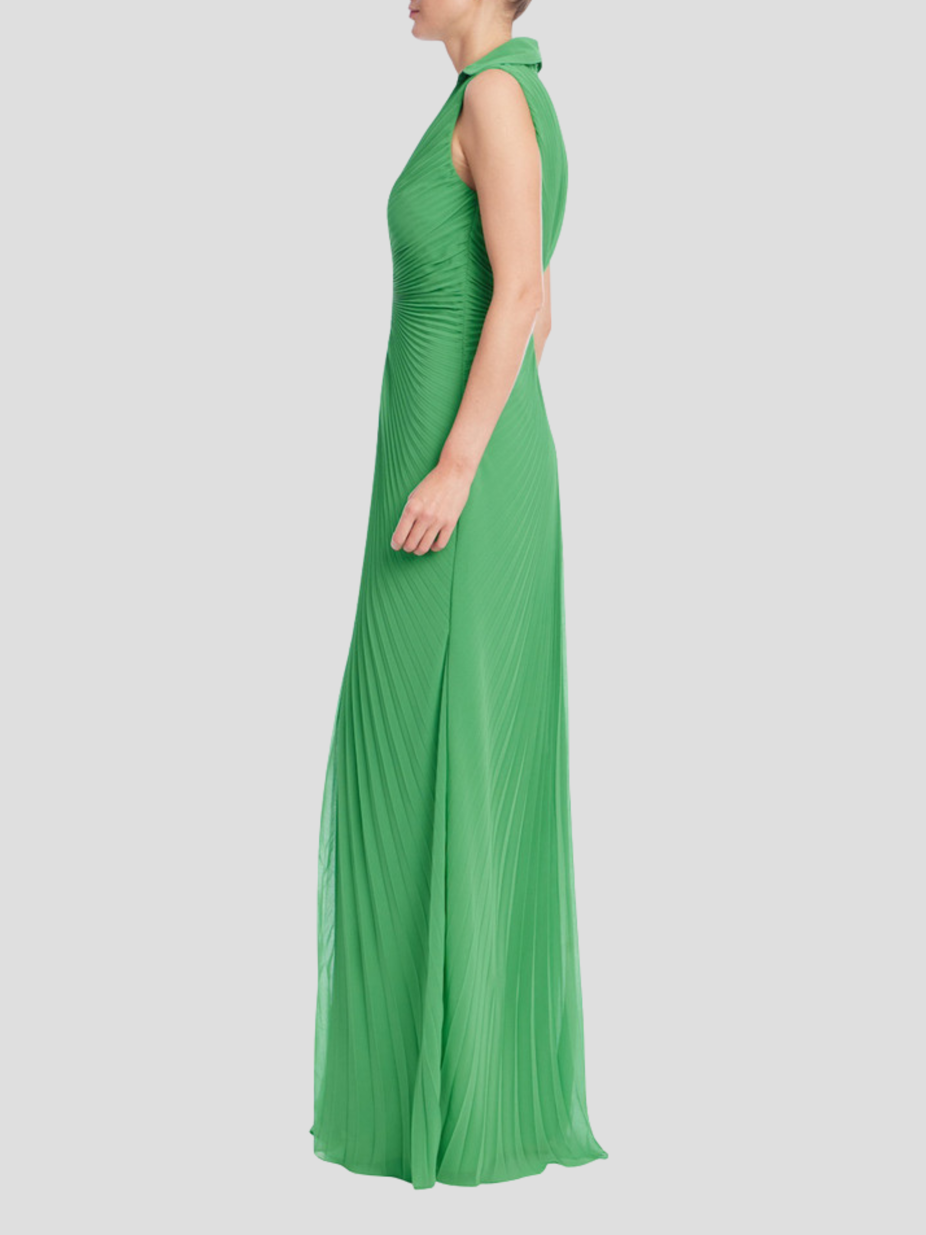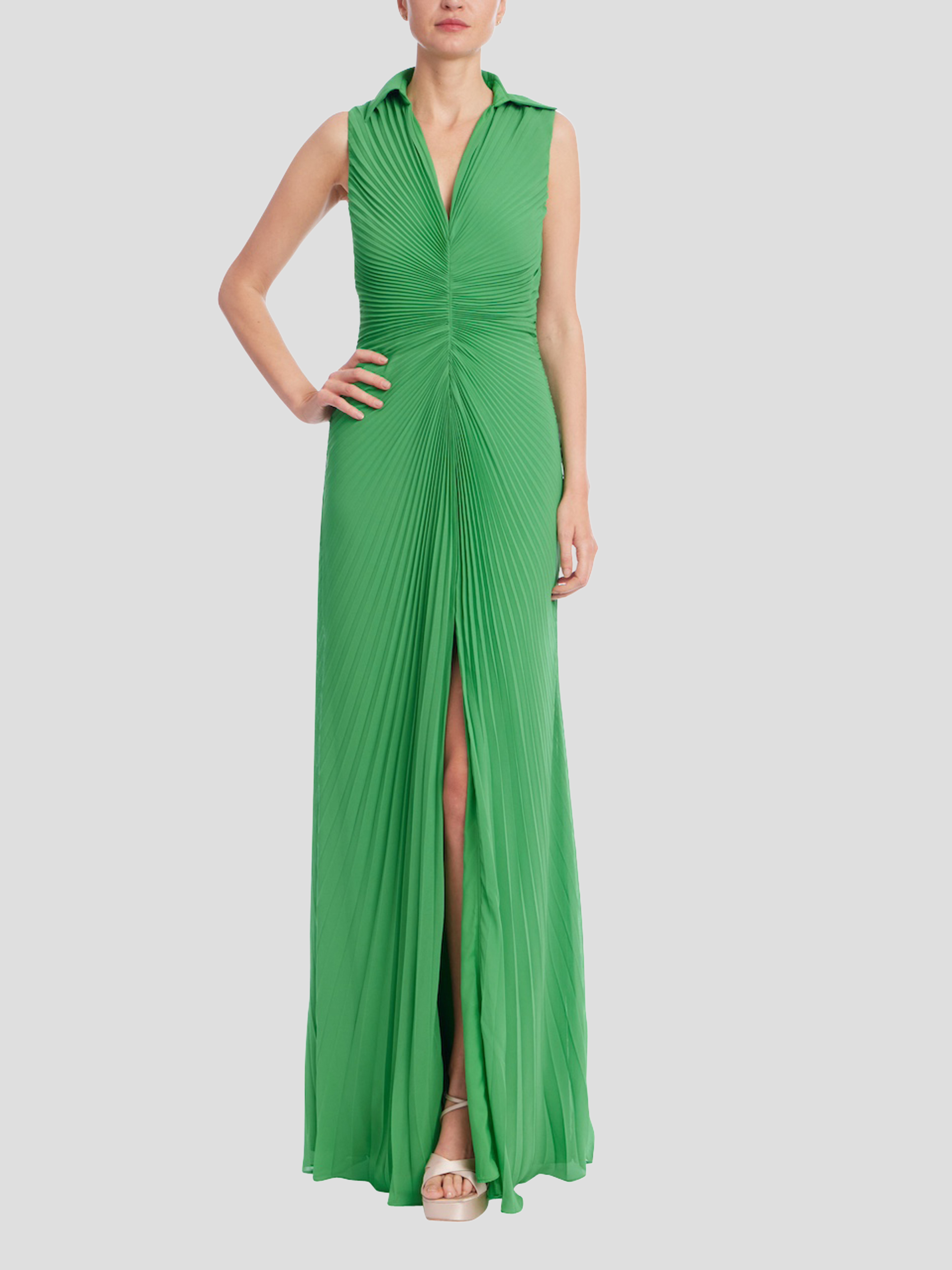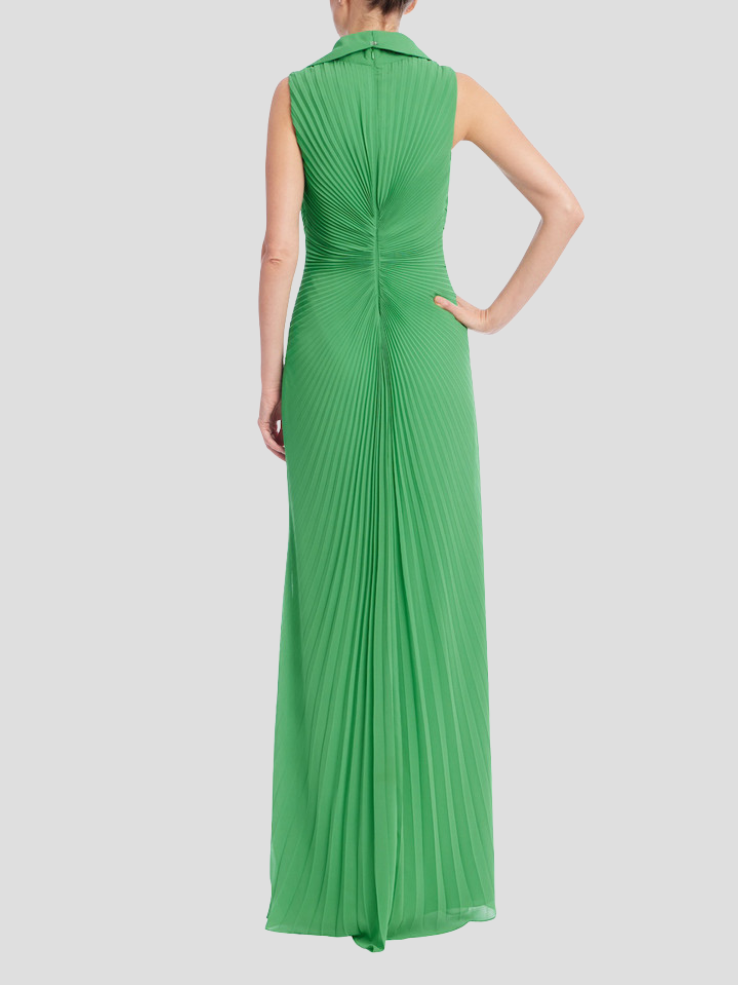 Make a bold entrance in the Emerald Radiance Pleated Gown, a striking fusion of modern edge and timeless elegance. This sleeveless, floor-length dress is sculpted from finely pleated fabric that fans out from the center, creating a dynamic silhouette with effortless movement. The pointed collar and plunging V-neckline add a contemporary twist, while a front slit reveals a hint of leg for a subtly sultry touch. Perfect for evening galas, red carpet moments, or sophisticated soirées, this vivid green gown is designed to turn heads.