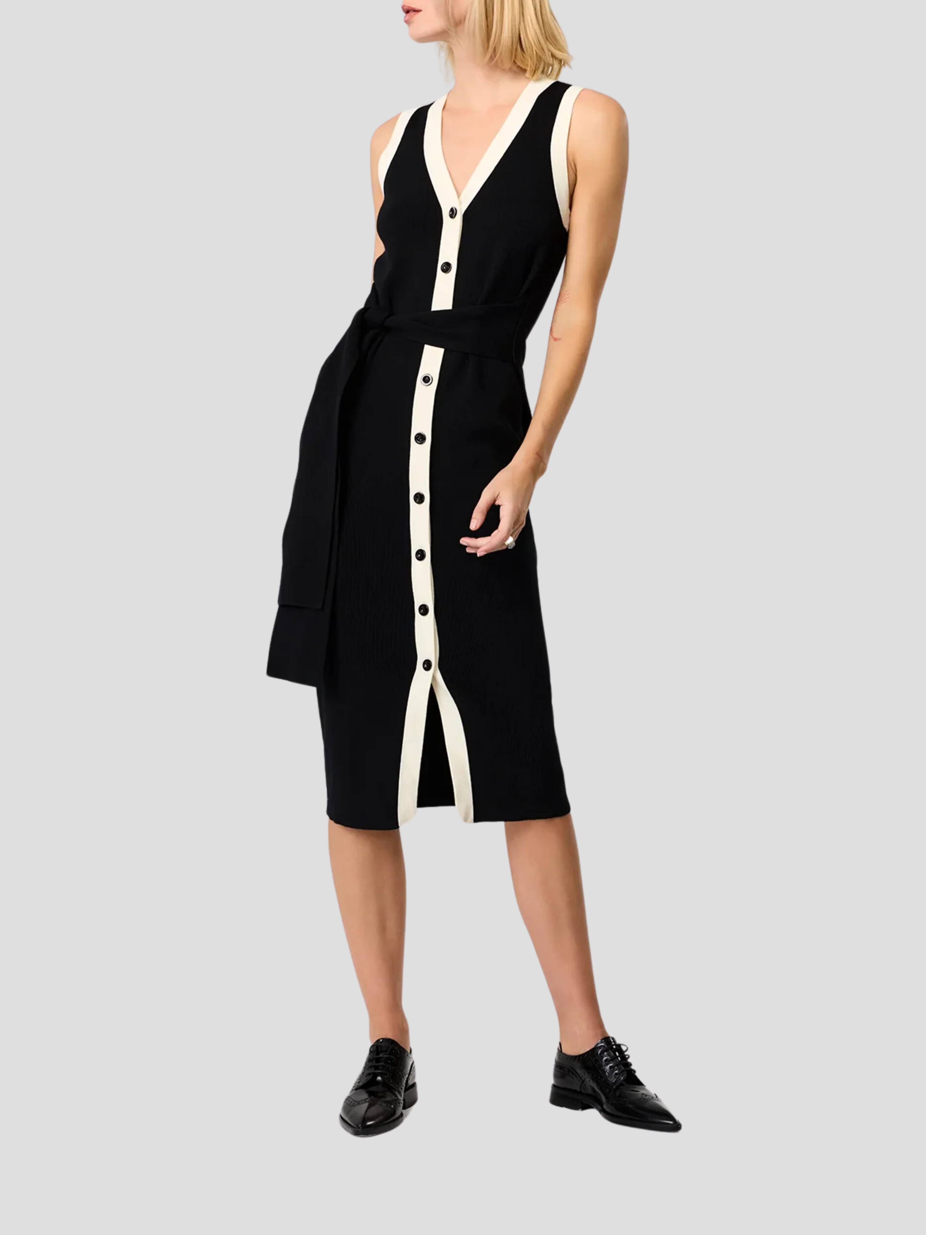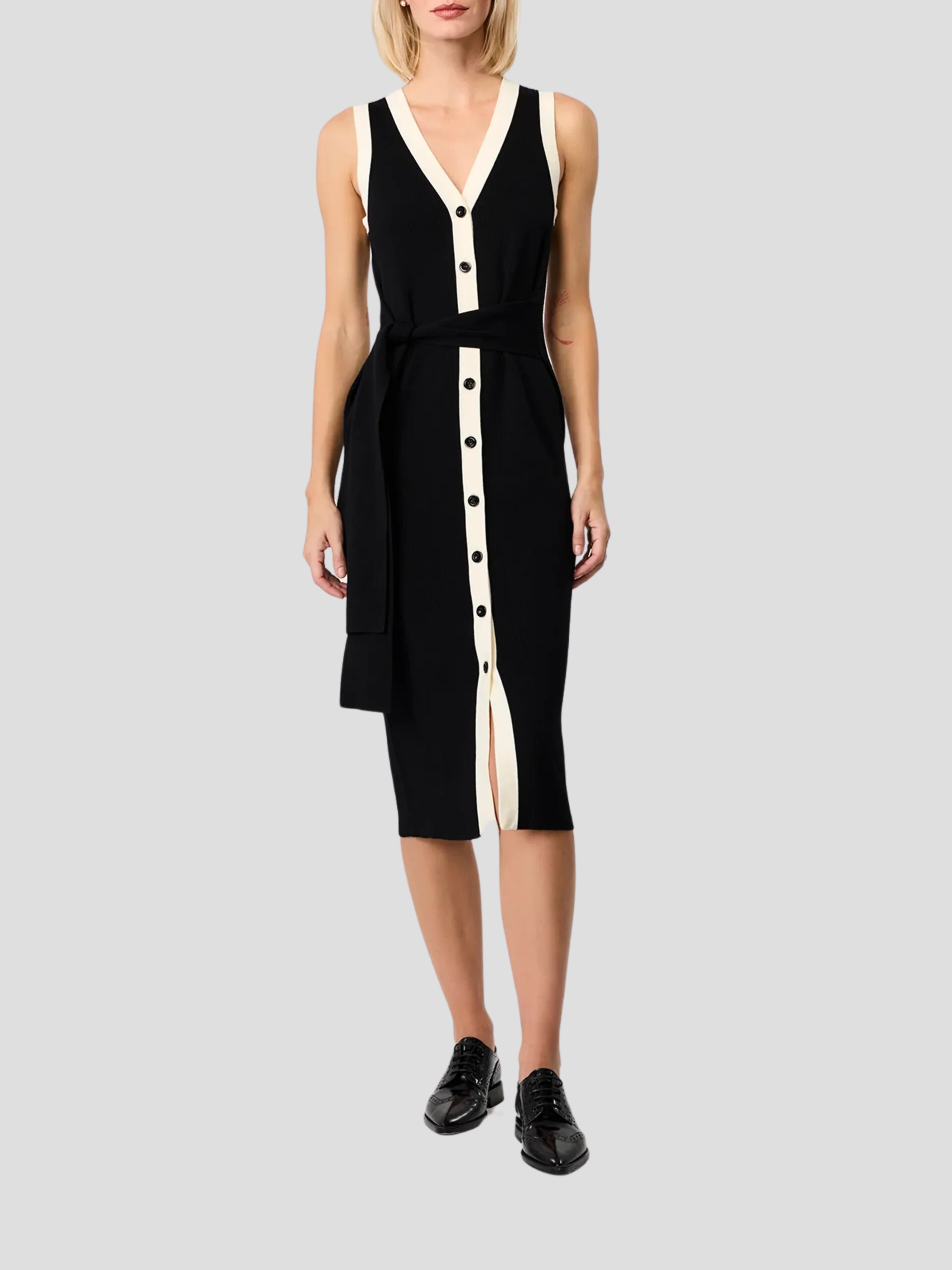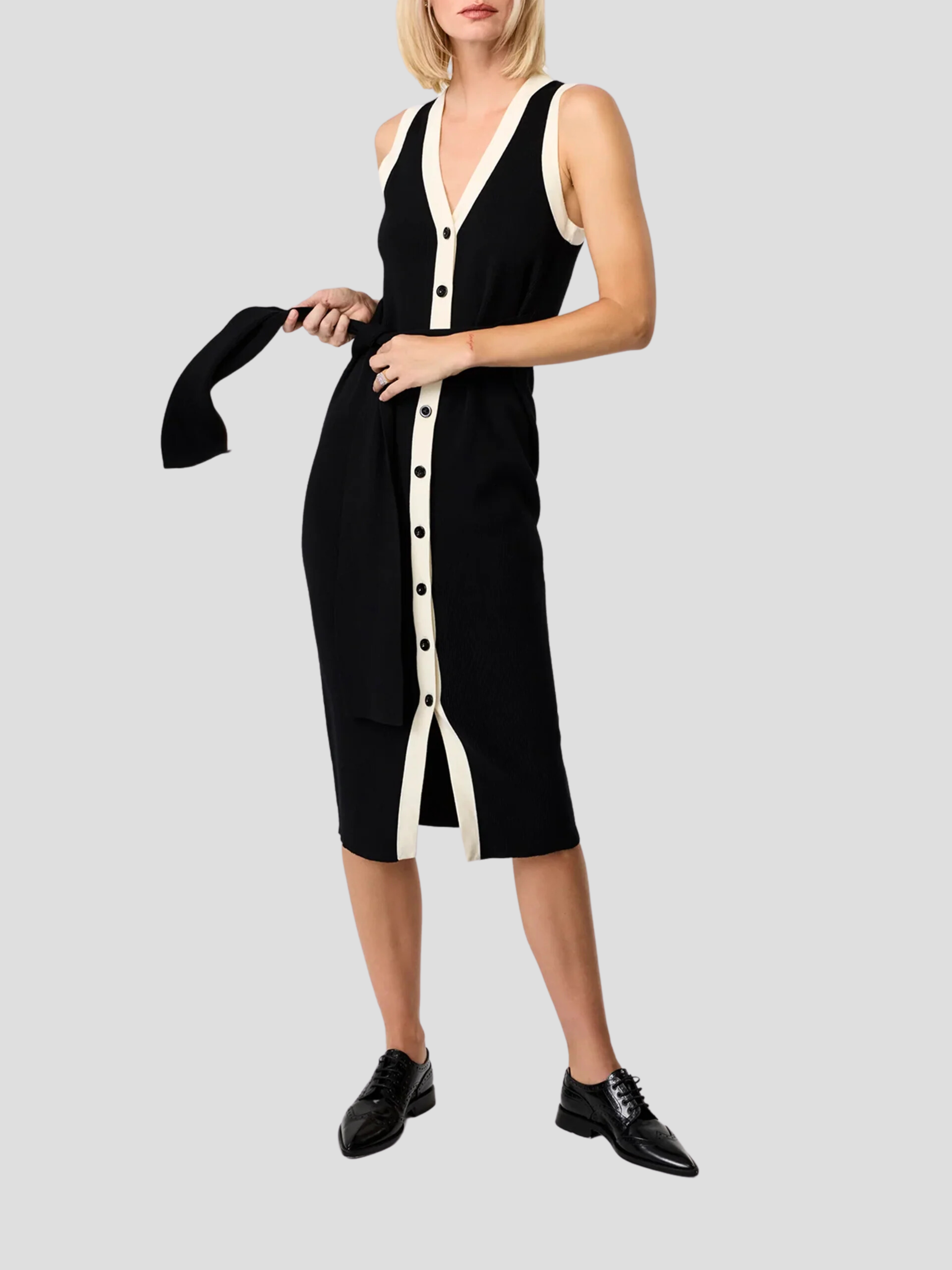 Expertly crafted by Toccin, the Victoria dress features a sophisticated midi-length, sleeveless design, and a V-neck with contrast trims. Its tie-waist detail adds a touch of elegance and shaping. Perfect for any occasion.