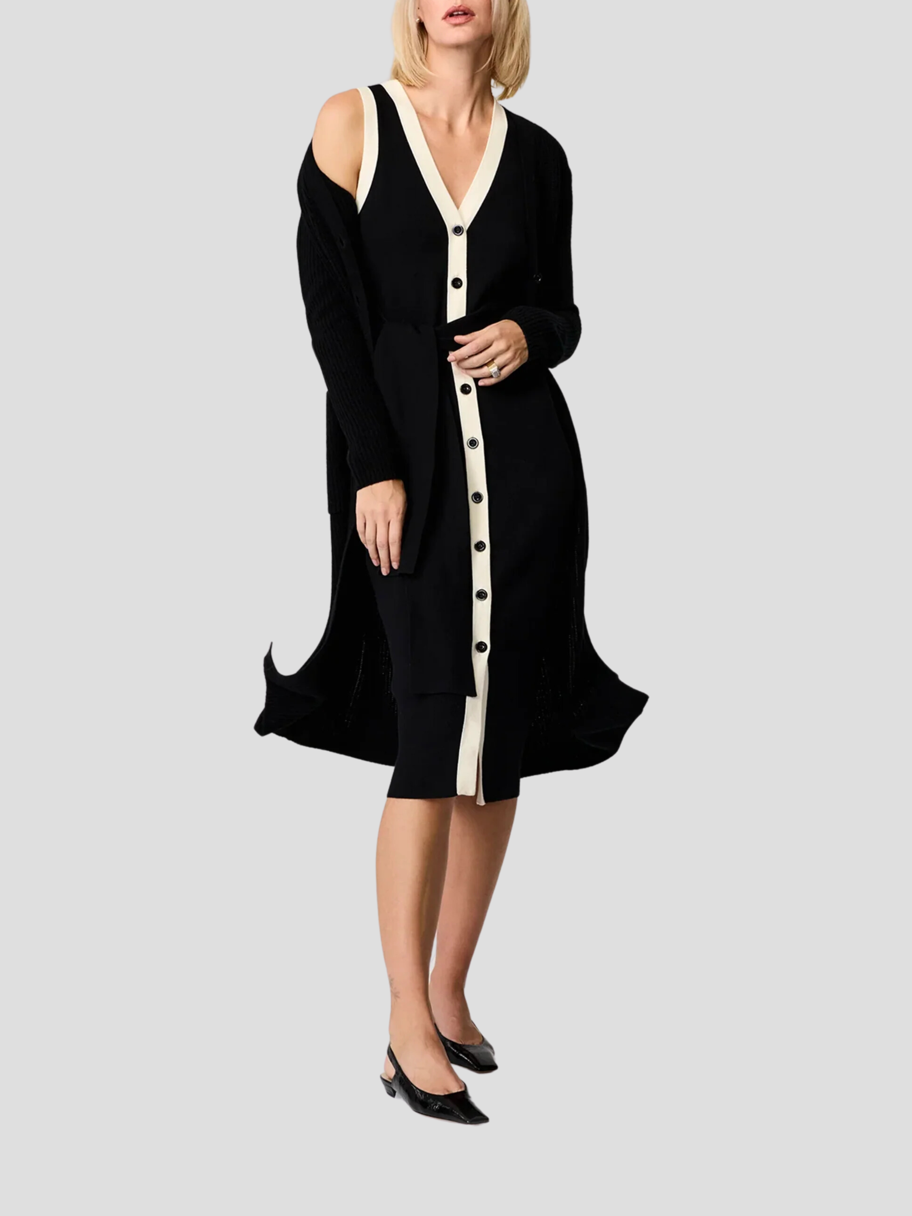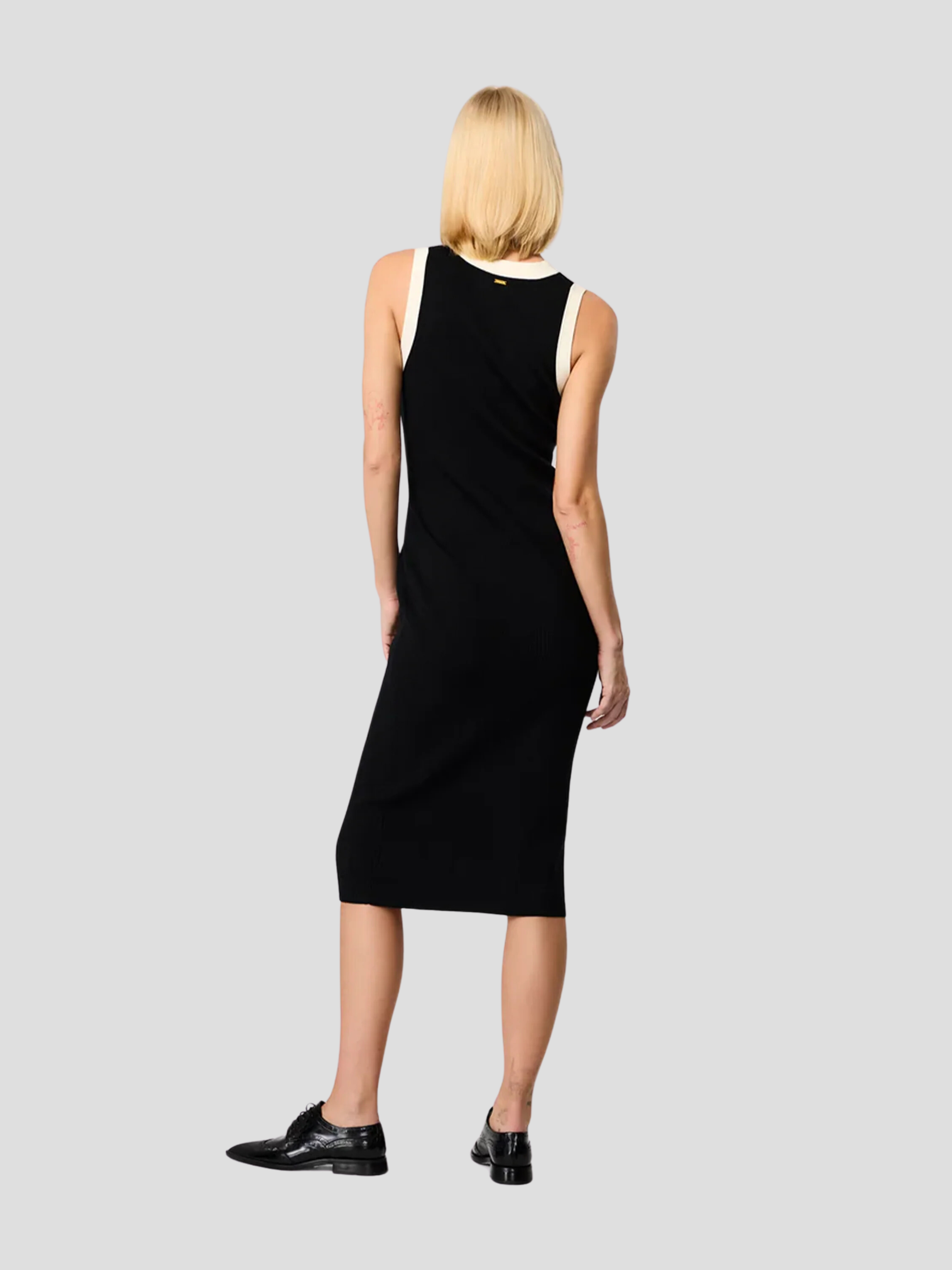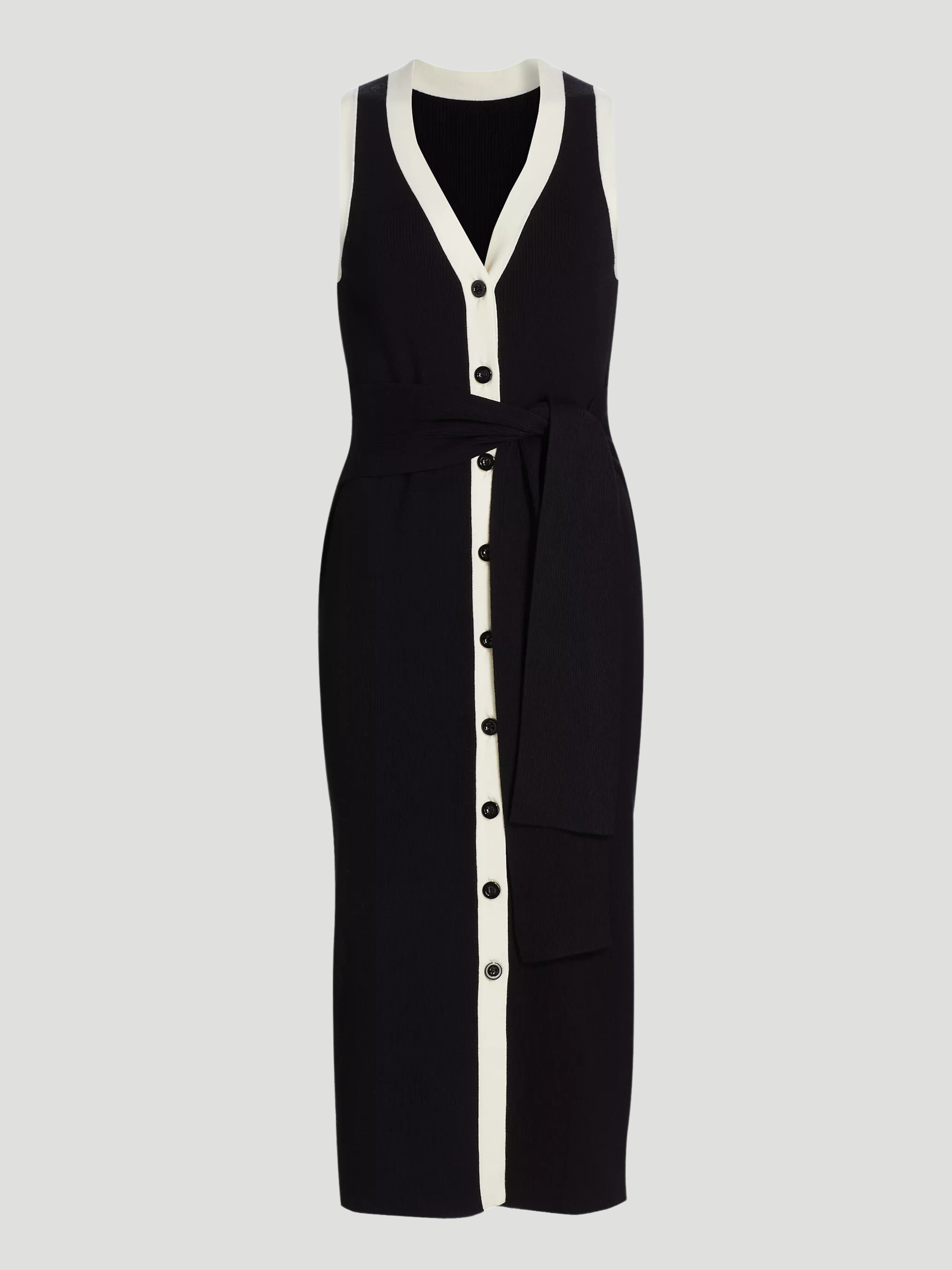 Expertly crafted by Toccin, the Victoria dress features a sophisticated midi-length, sleeveless design, and a V-neck with contrast trims. Its tie-waist detail adds a touch of elegance and shaping. Perfect for any occasion.
