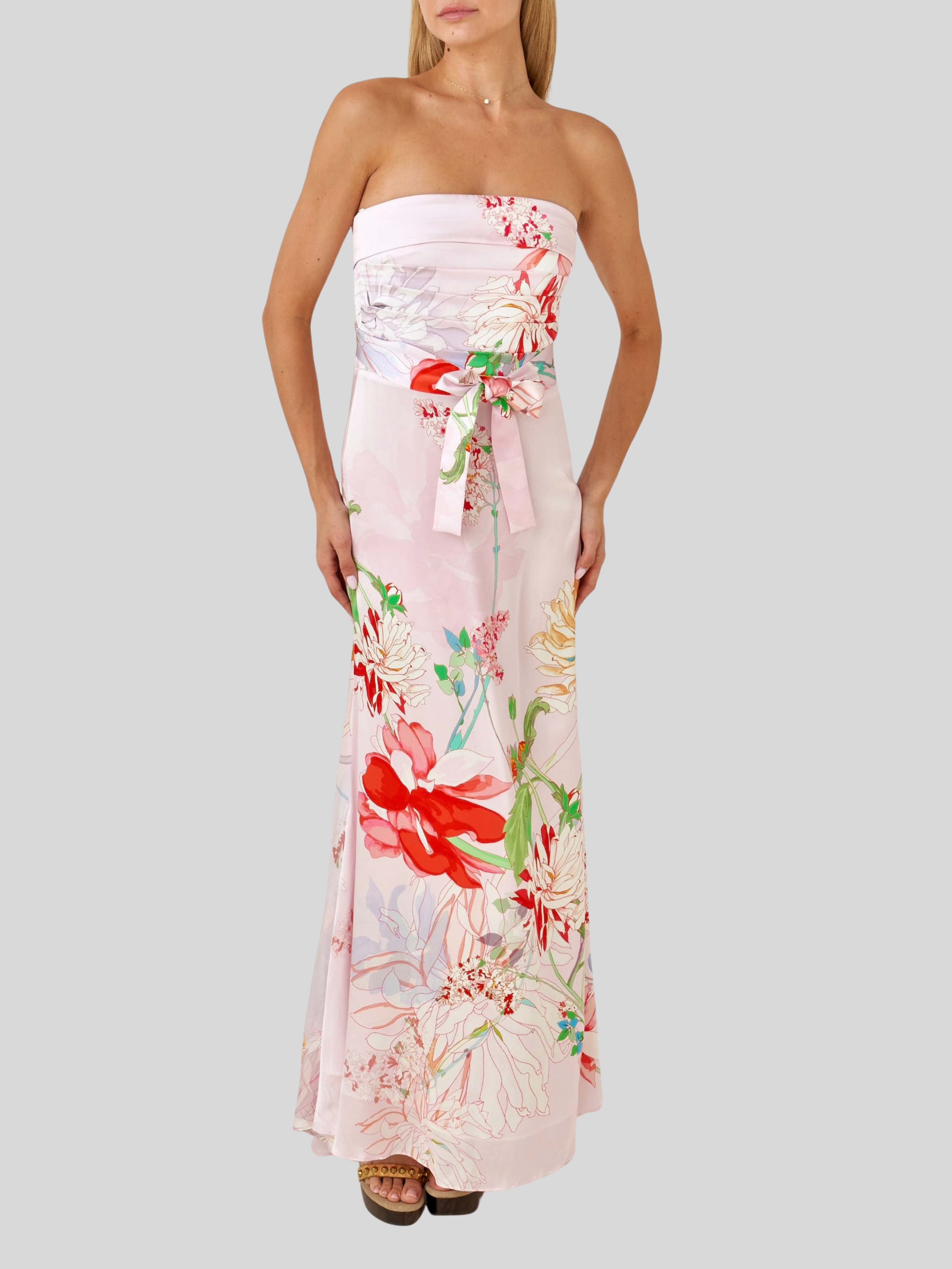 The silk is printed with a romantic floral composition set against a delicate blush ground—petals in soft reds, creams, and gentle greens layered like a painted garden in bloom. A self-tie sash at the waist allows for subtle definition, adding shape while maintaining the dress’s ease and elegance. It can also be tied at the back only
