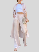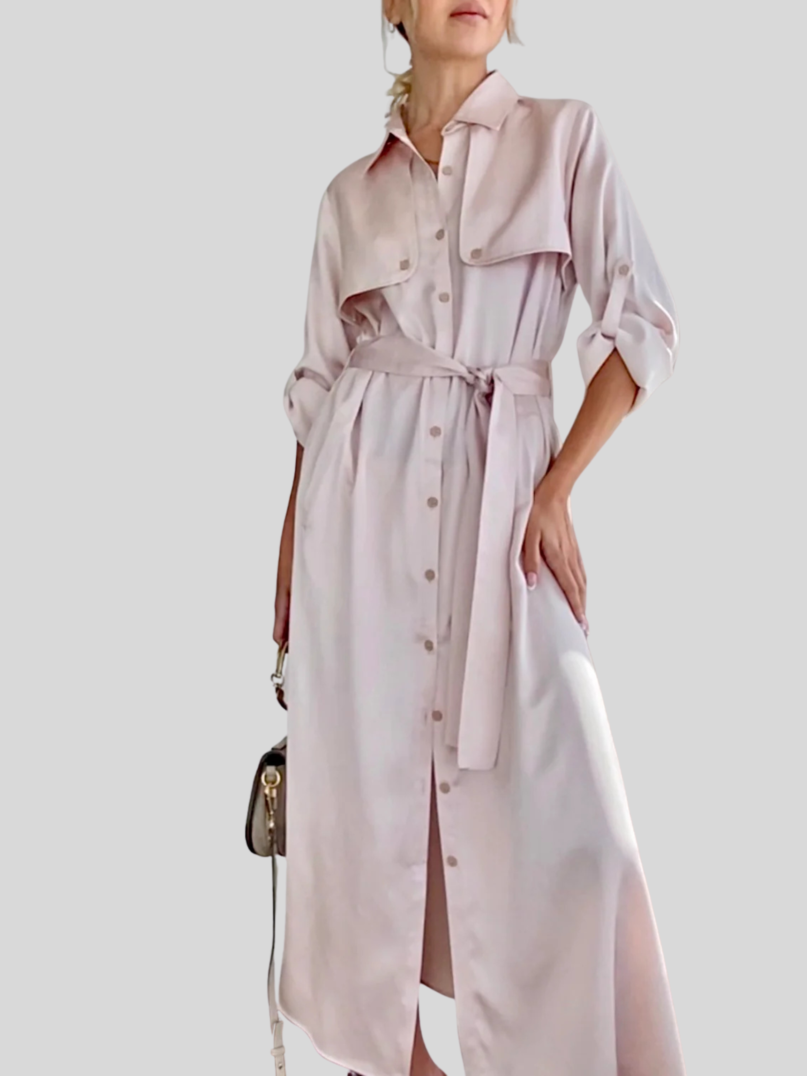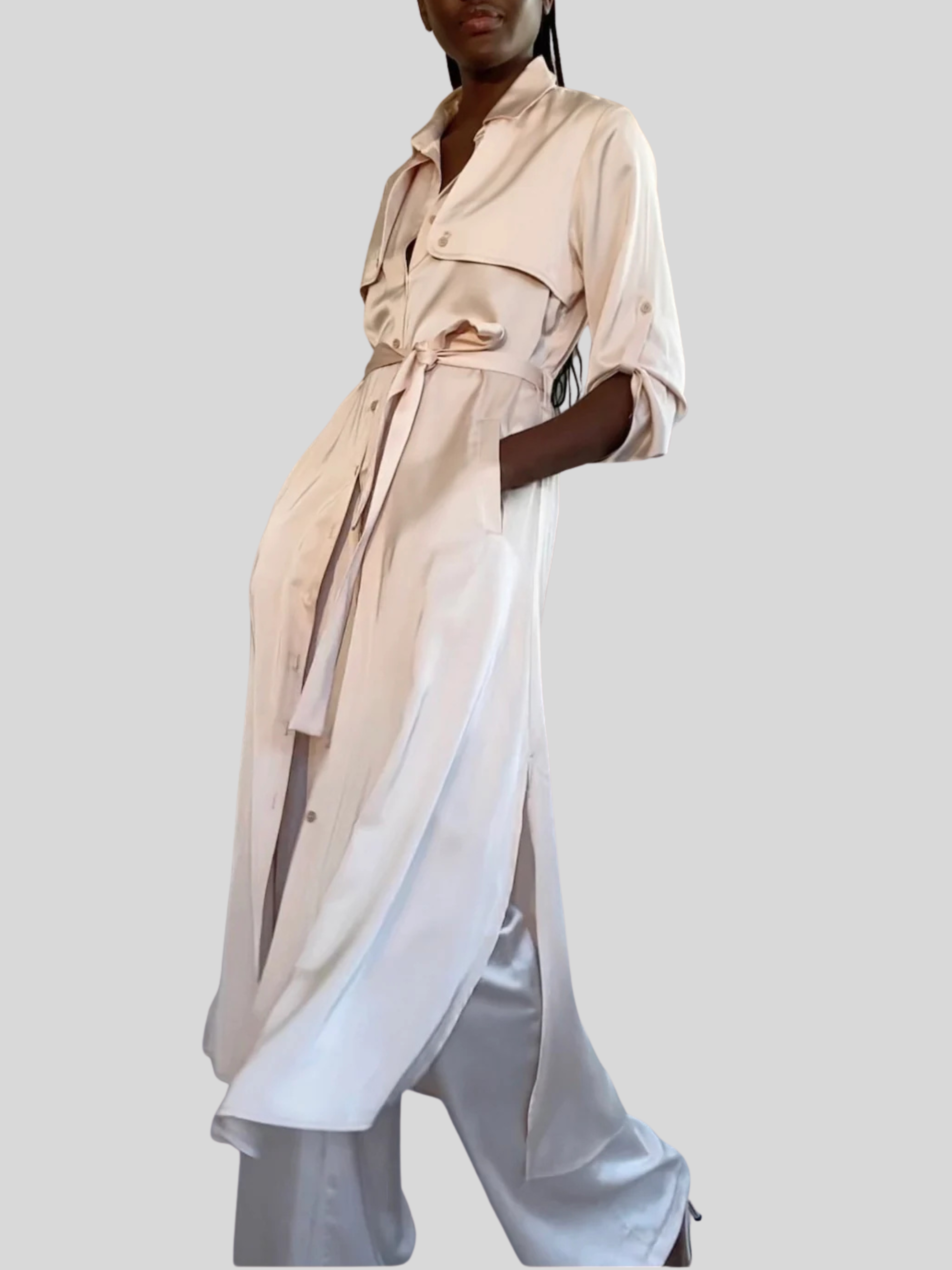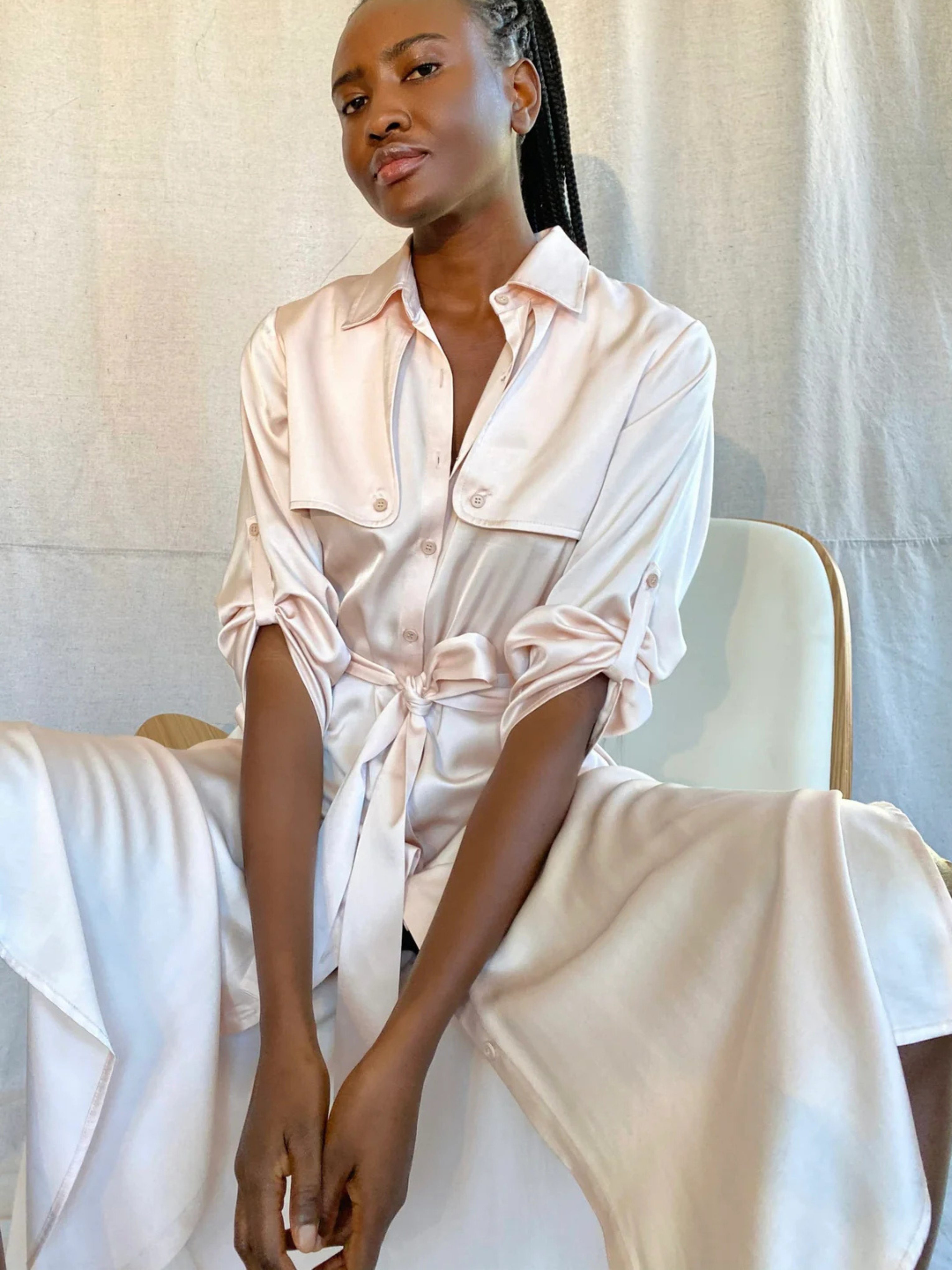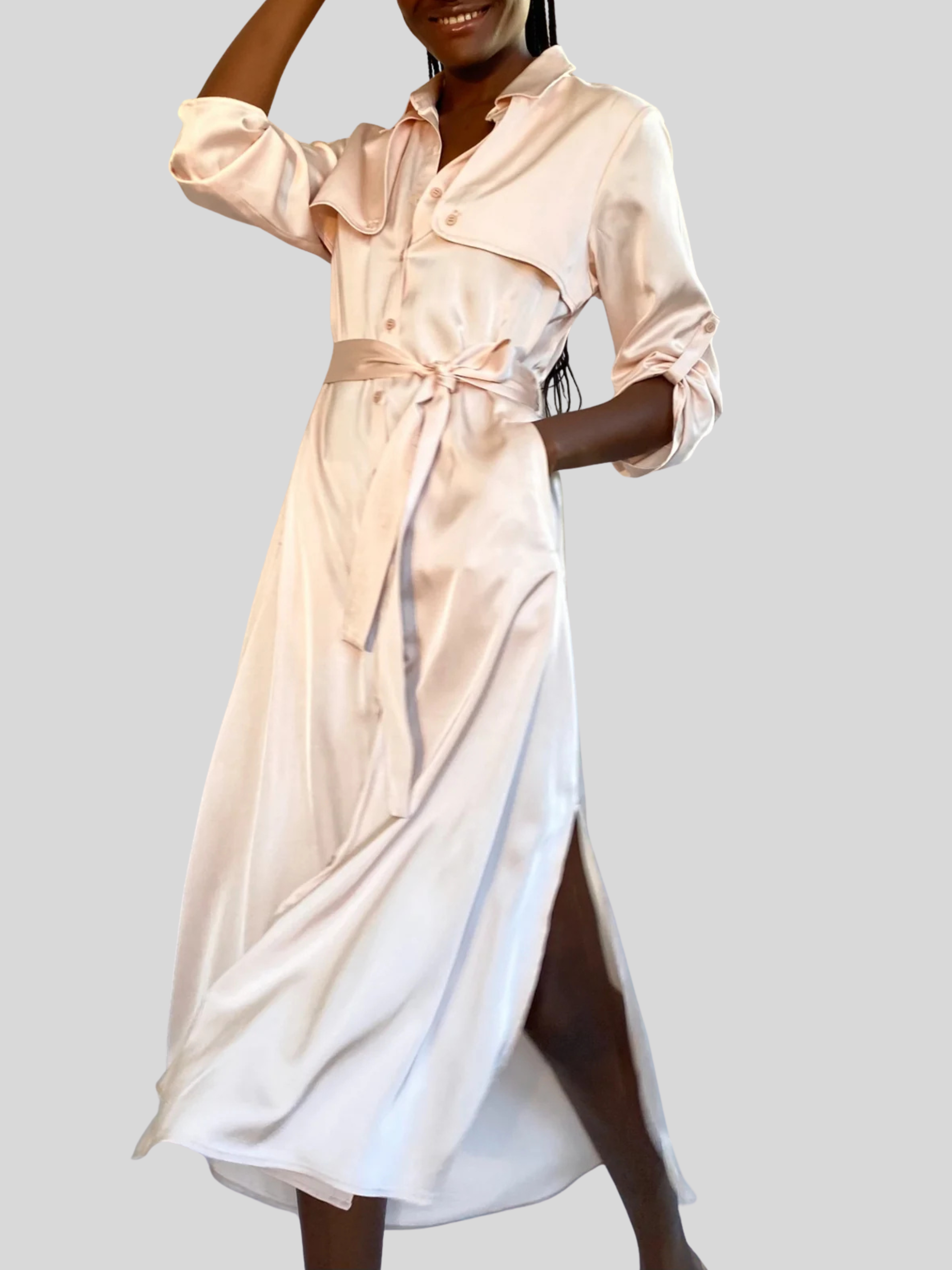 This Trench coat inspired shirt dress is the perfect everyday item, that you can dress up or dress down and wear from day to night. A style that will never get old thru its timeless design. This dress is made from a slightly heavier Charmeuse in blush and can be worn as a dress or over coat. The Dress has an easy cut and looks great on all body types and on our tall and petite customers.