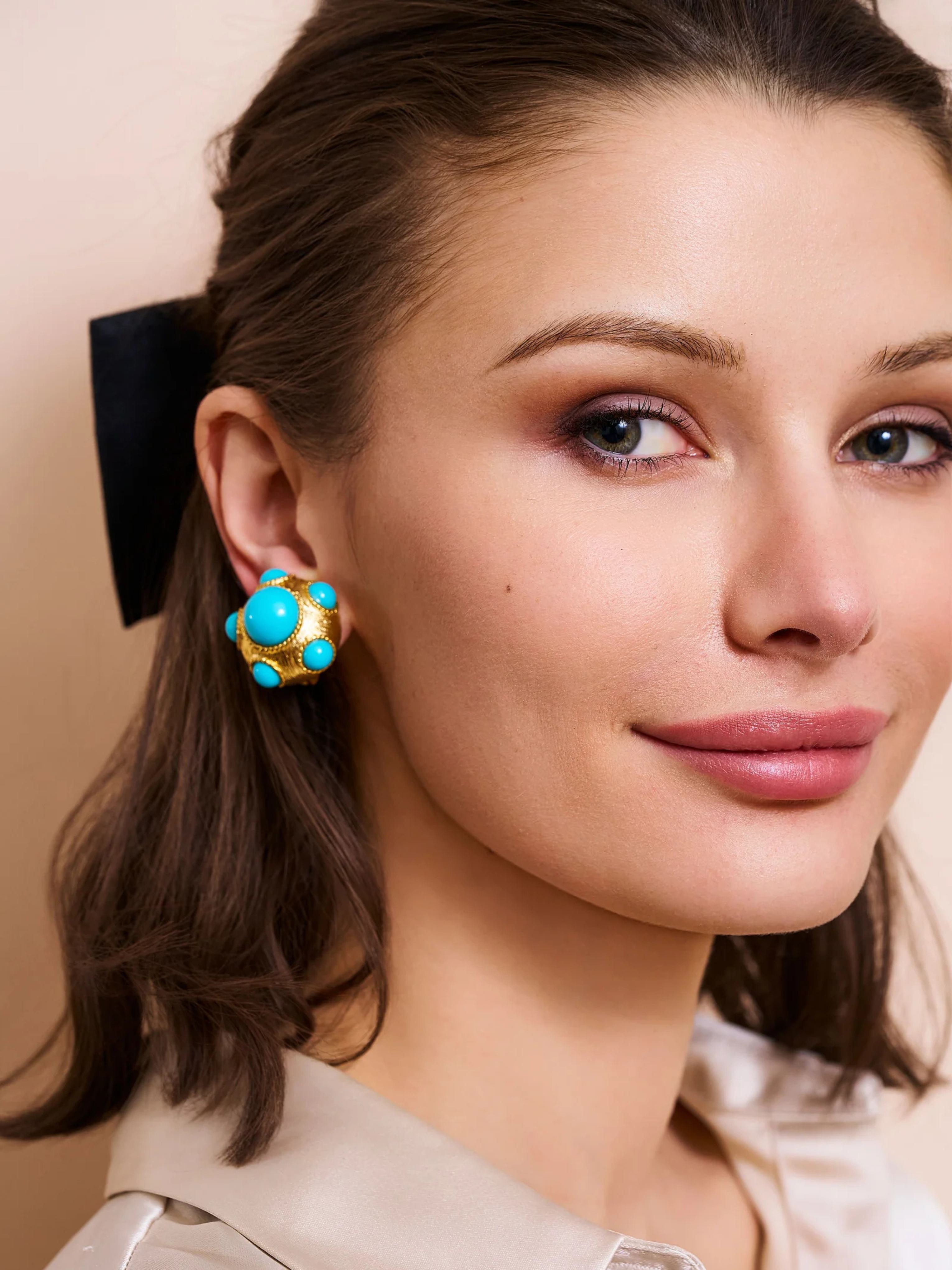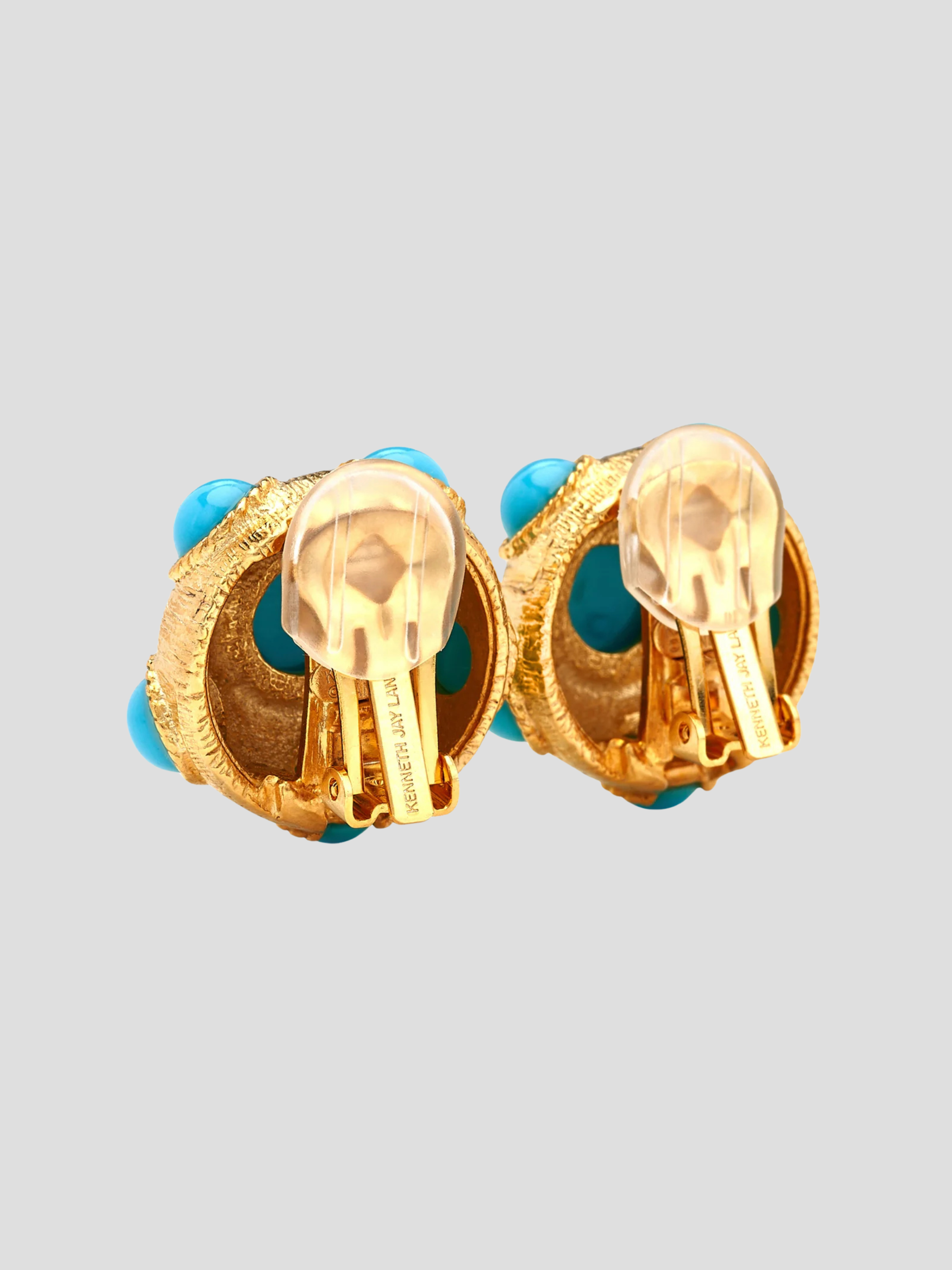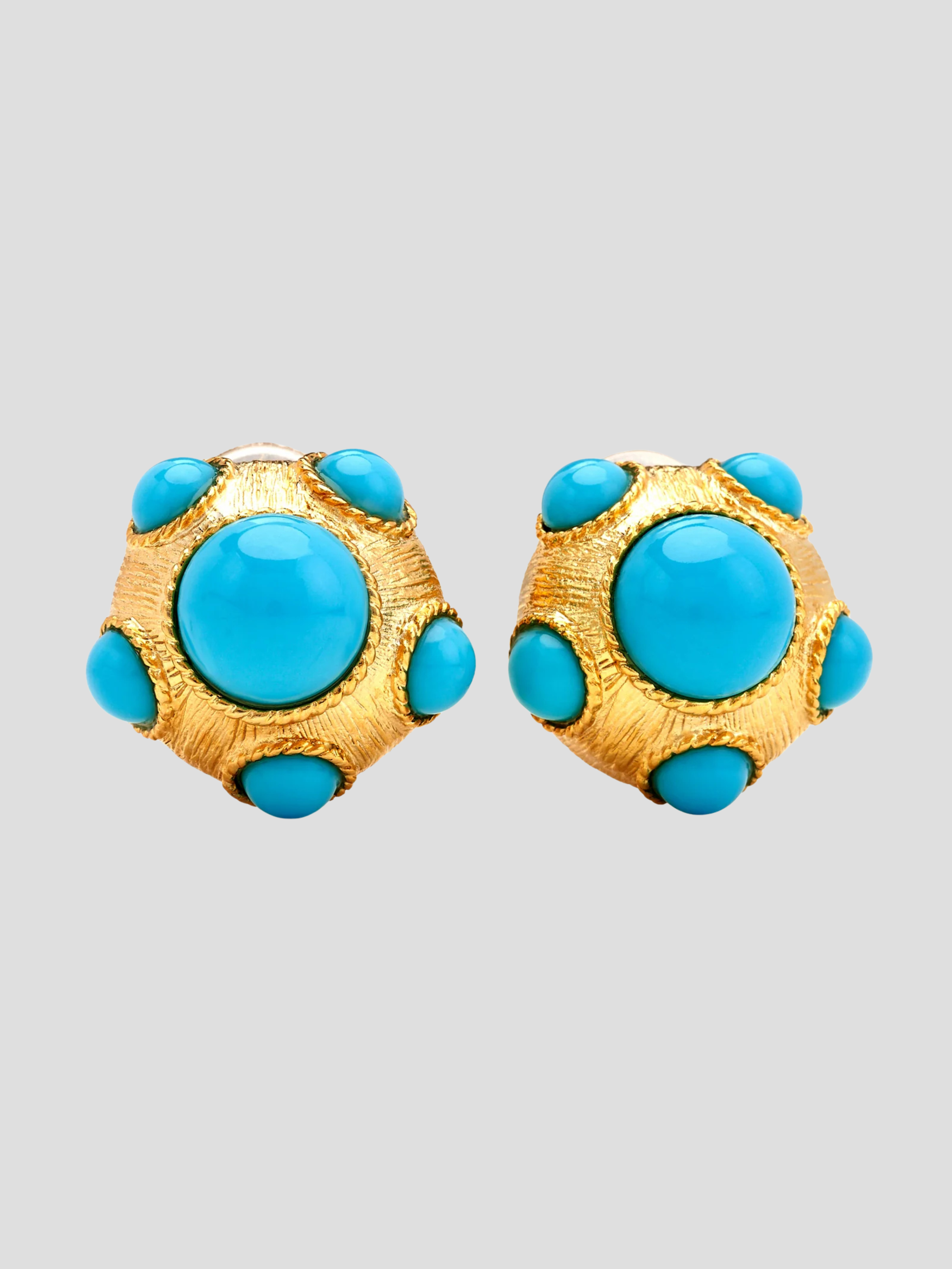 These gold-plated button clip-on earrings feature turquoise cabochons with a turquoise center, offering a vibrant and stylish design.
