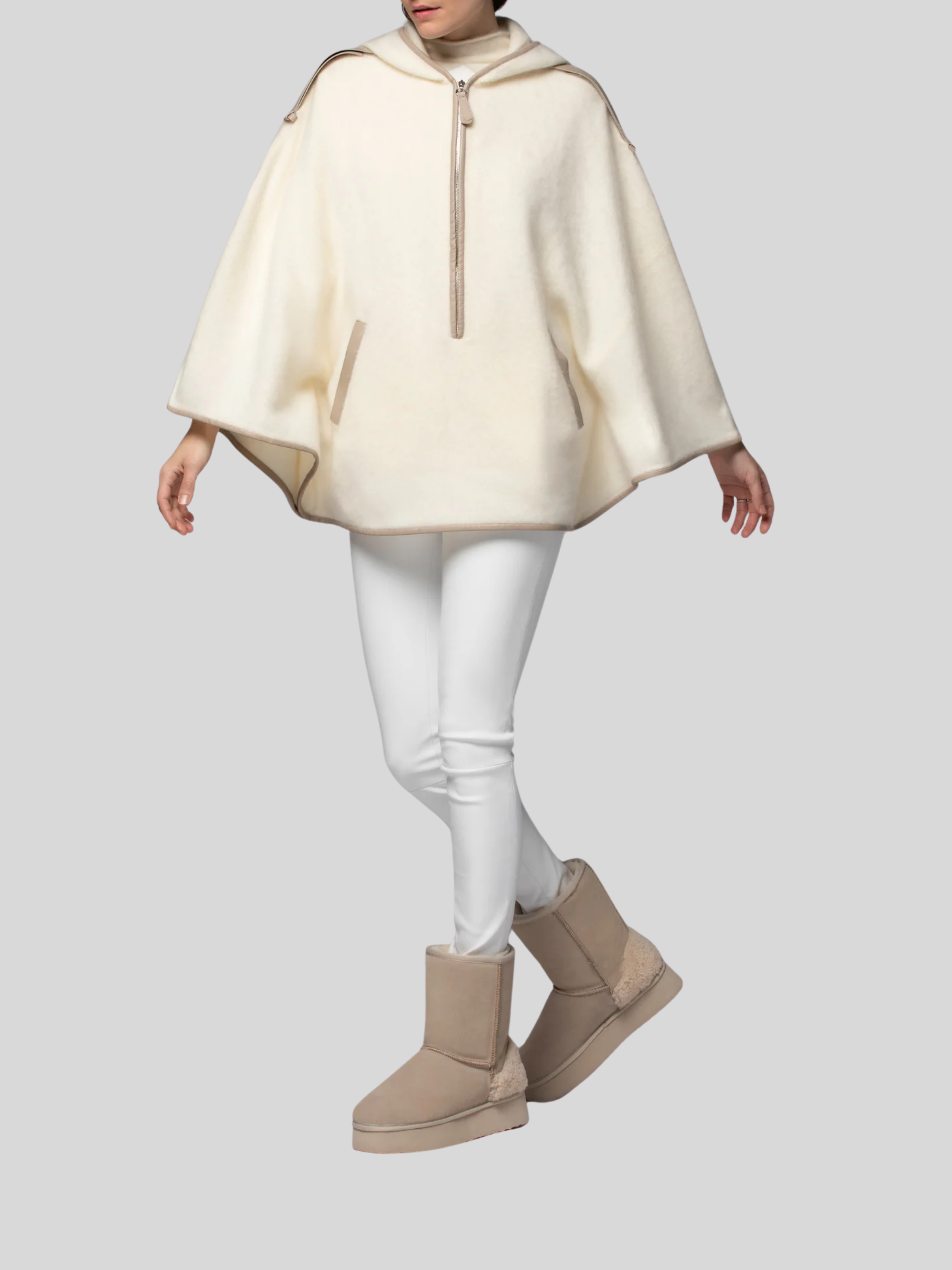 Vanda Poncho with Leather Trim in White