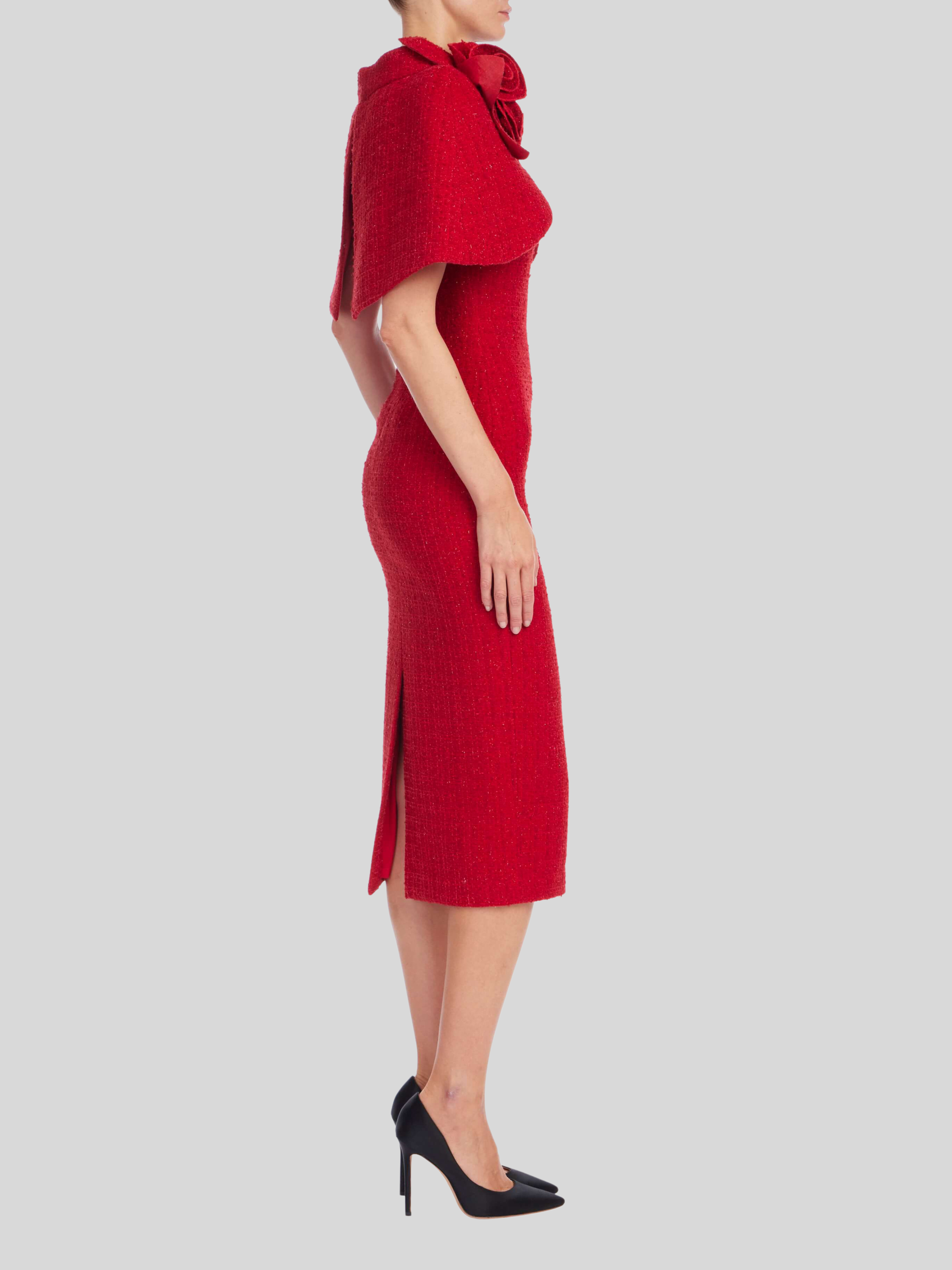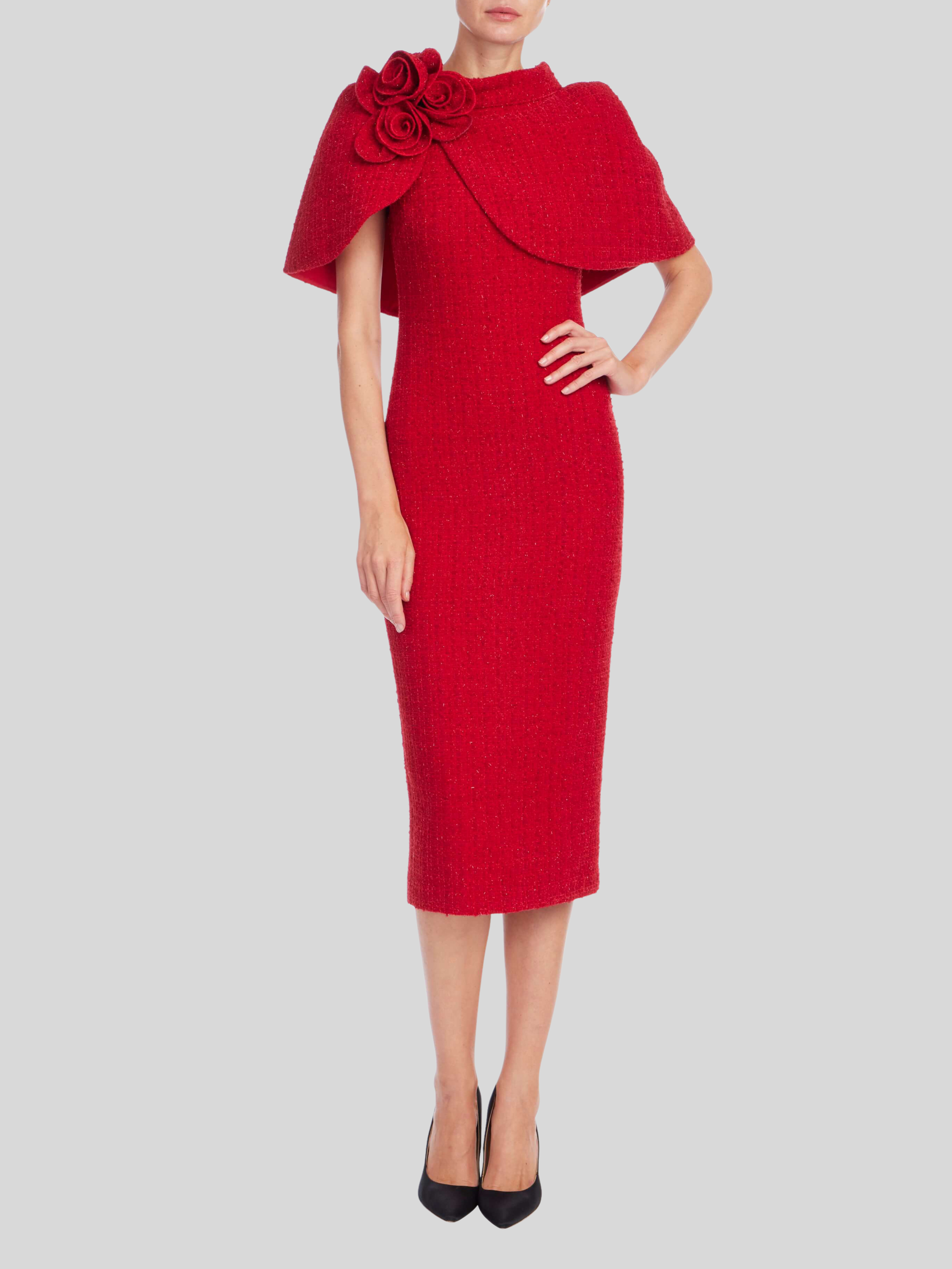 Elevate your wardrobe with this sophisticated Badgley Mischka cocktail dress. Perfect as a work dress or for special occasions, this stunning sheath dress features an elegant attached overlap cape in a luxurious twinkle boucle fabric. The chic mock neck and flattering short sleeve capelet design add a touch of modern flair, while the exquisite rosette shoulder detail provides a feminine accent. Designed in a slim fit and hitting at a sophisticated midi length, this dress is sure to turn heads.