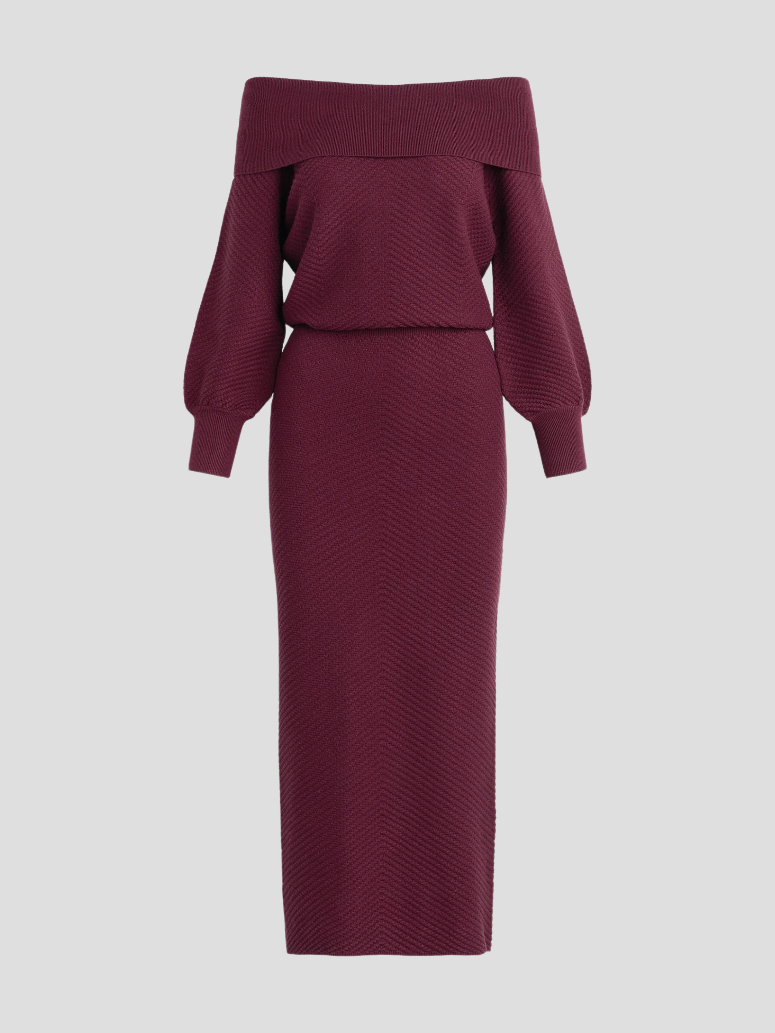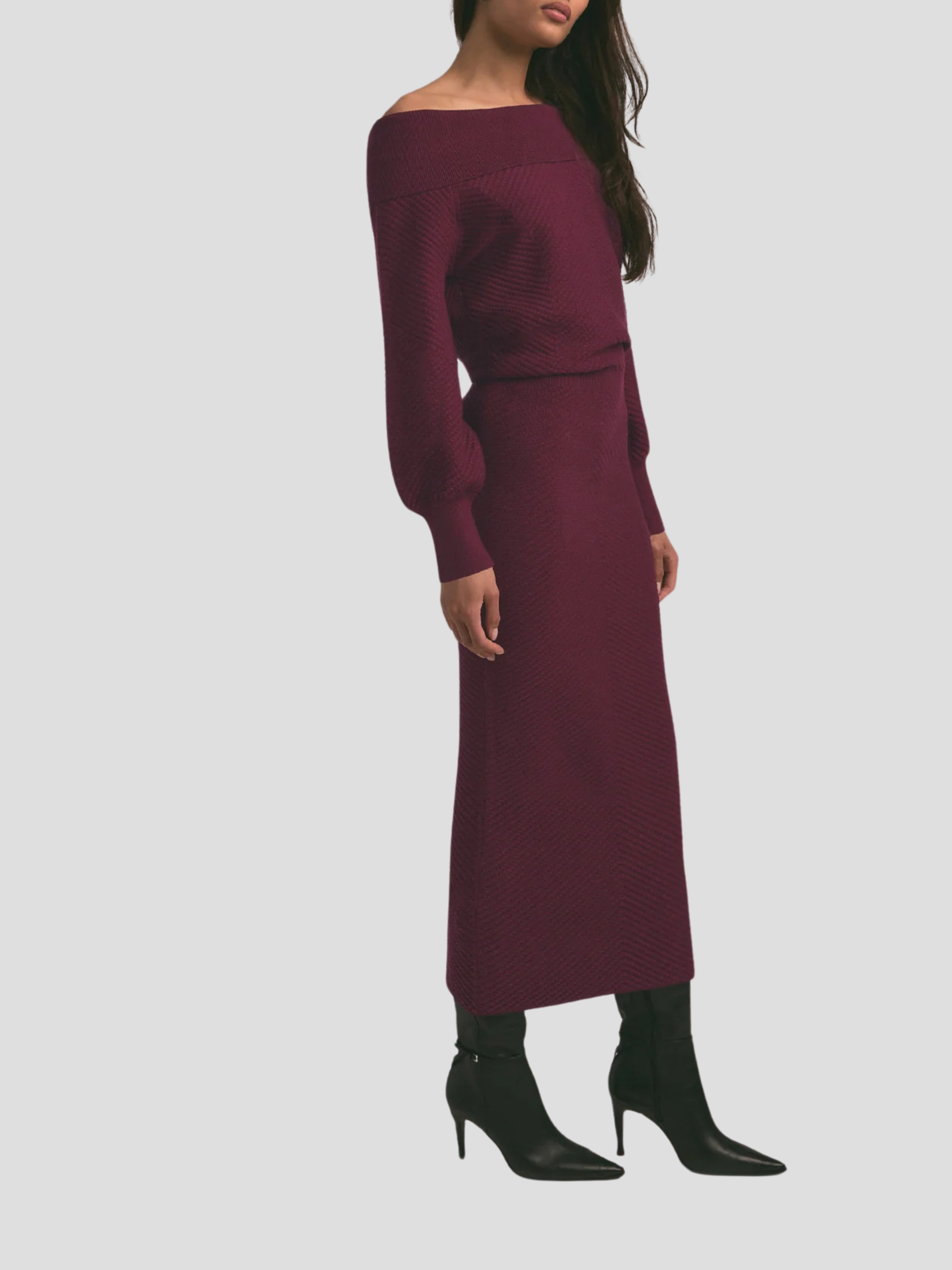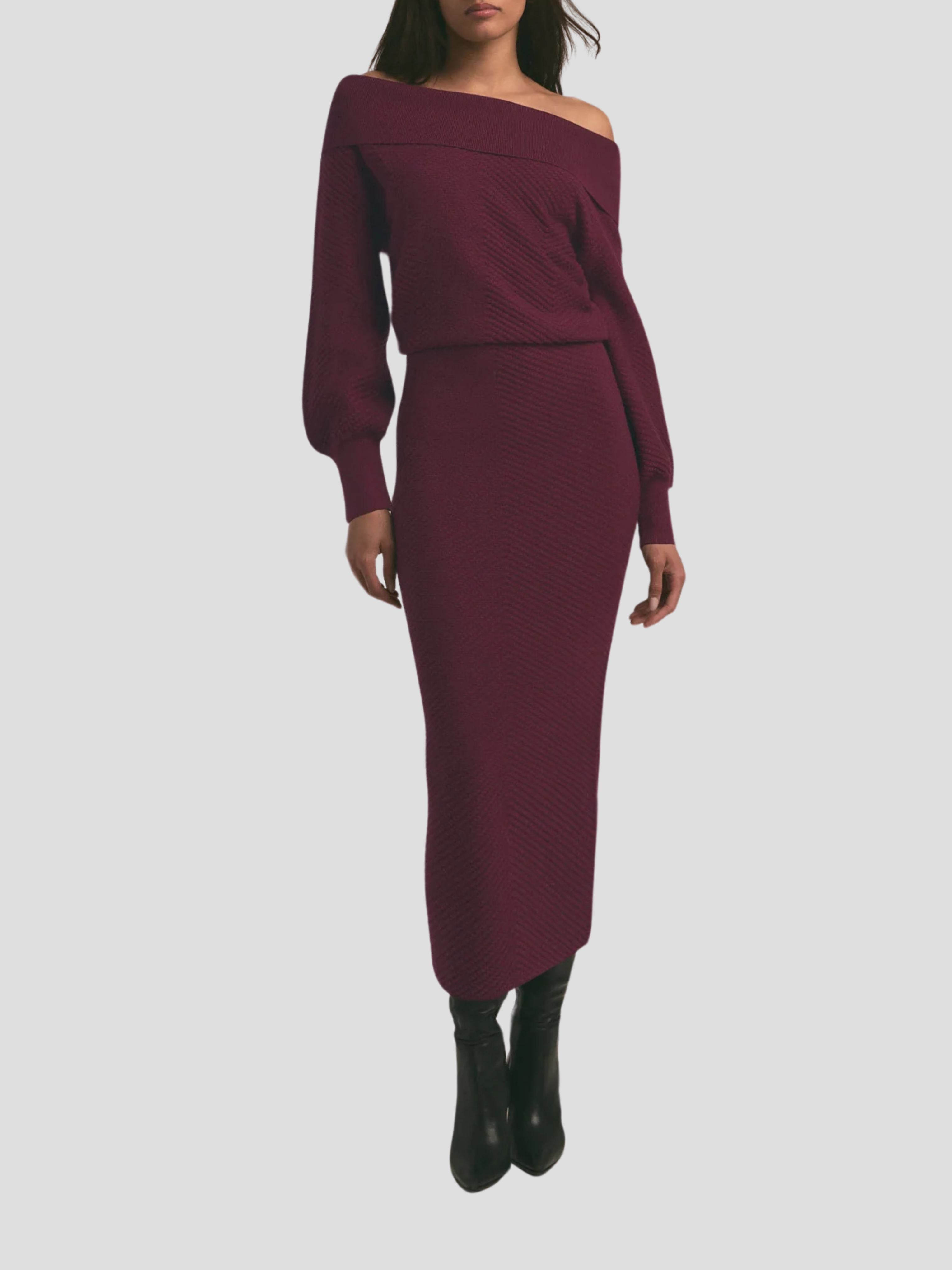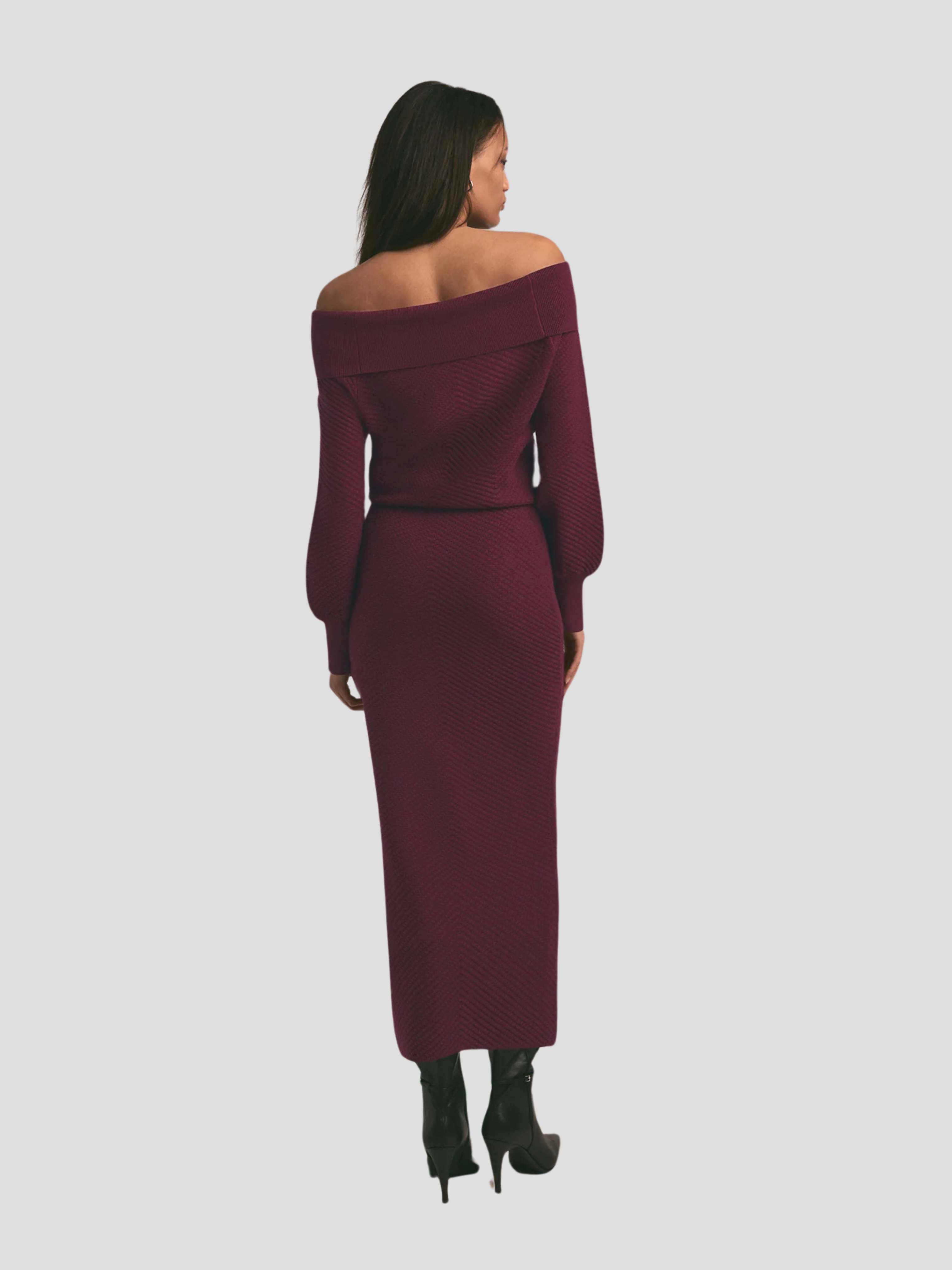A flattering-for-all dress made from knitted, ribbed viscose blend. The Irene Dress is designed with a blousy top and off-the-shoulder styling with a slim skirt. Since it's cast in Sangria Nights, it will be a favorite dress to wear fall, winter and early spring with different accessories.