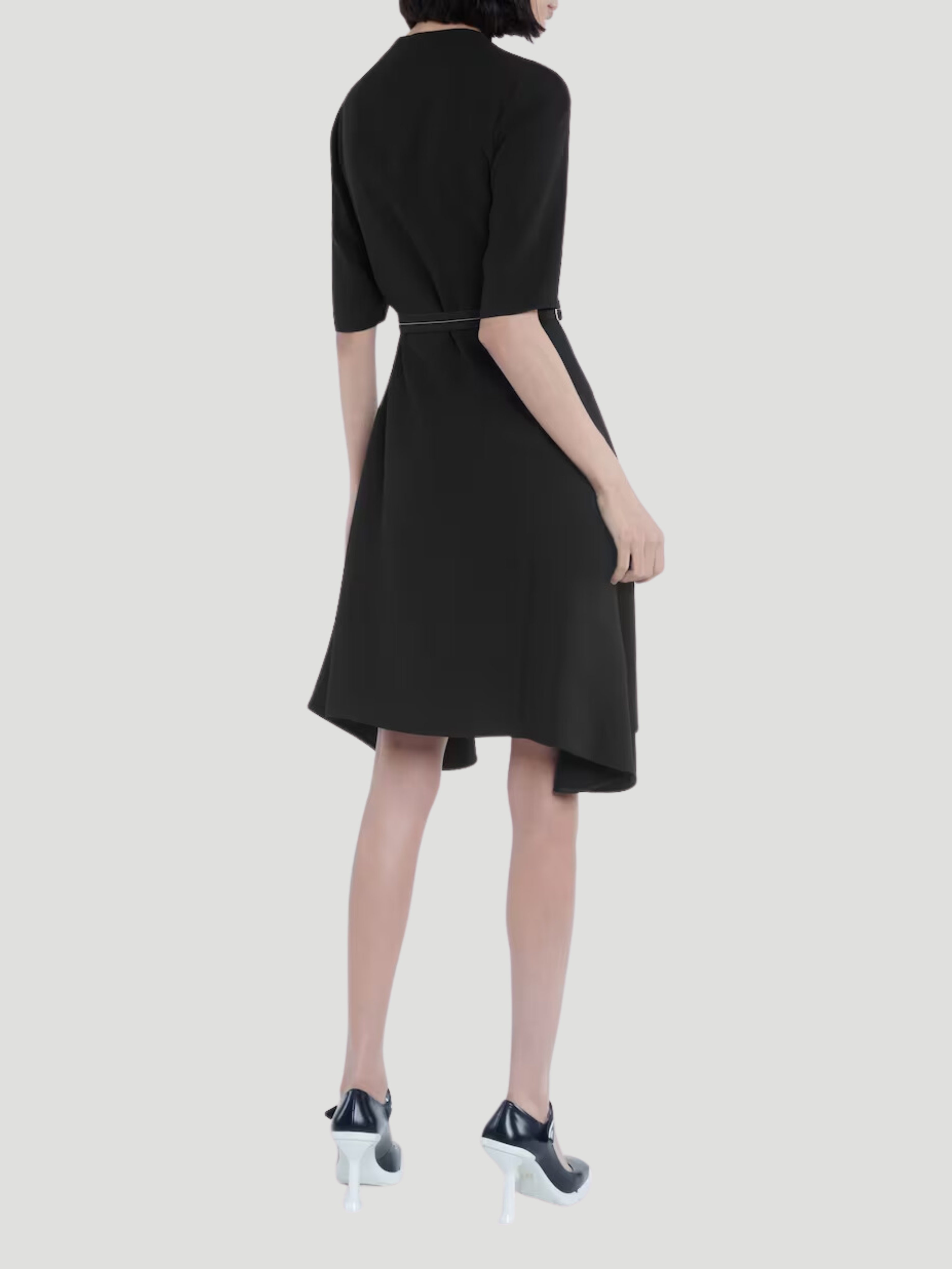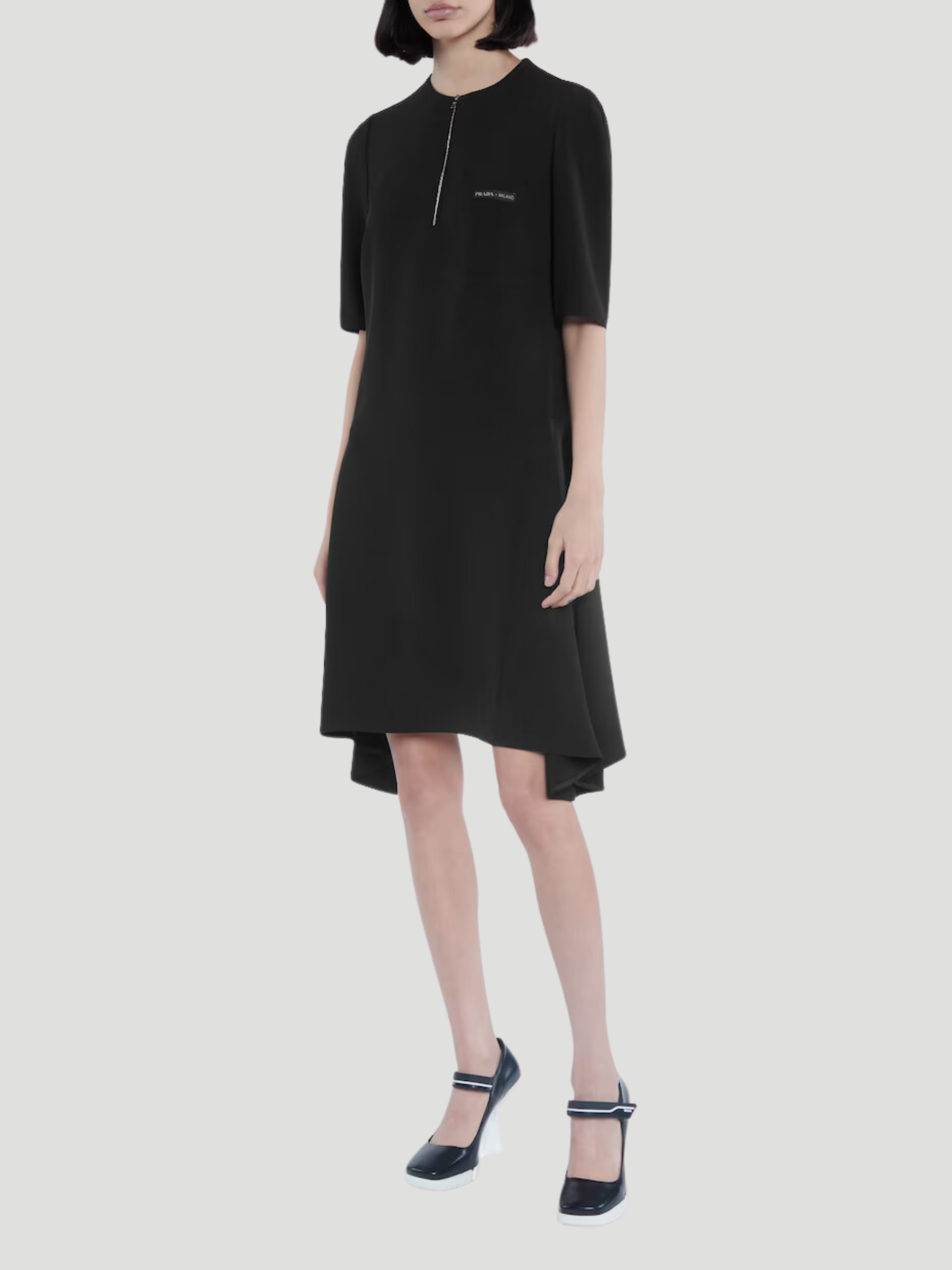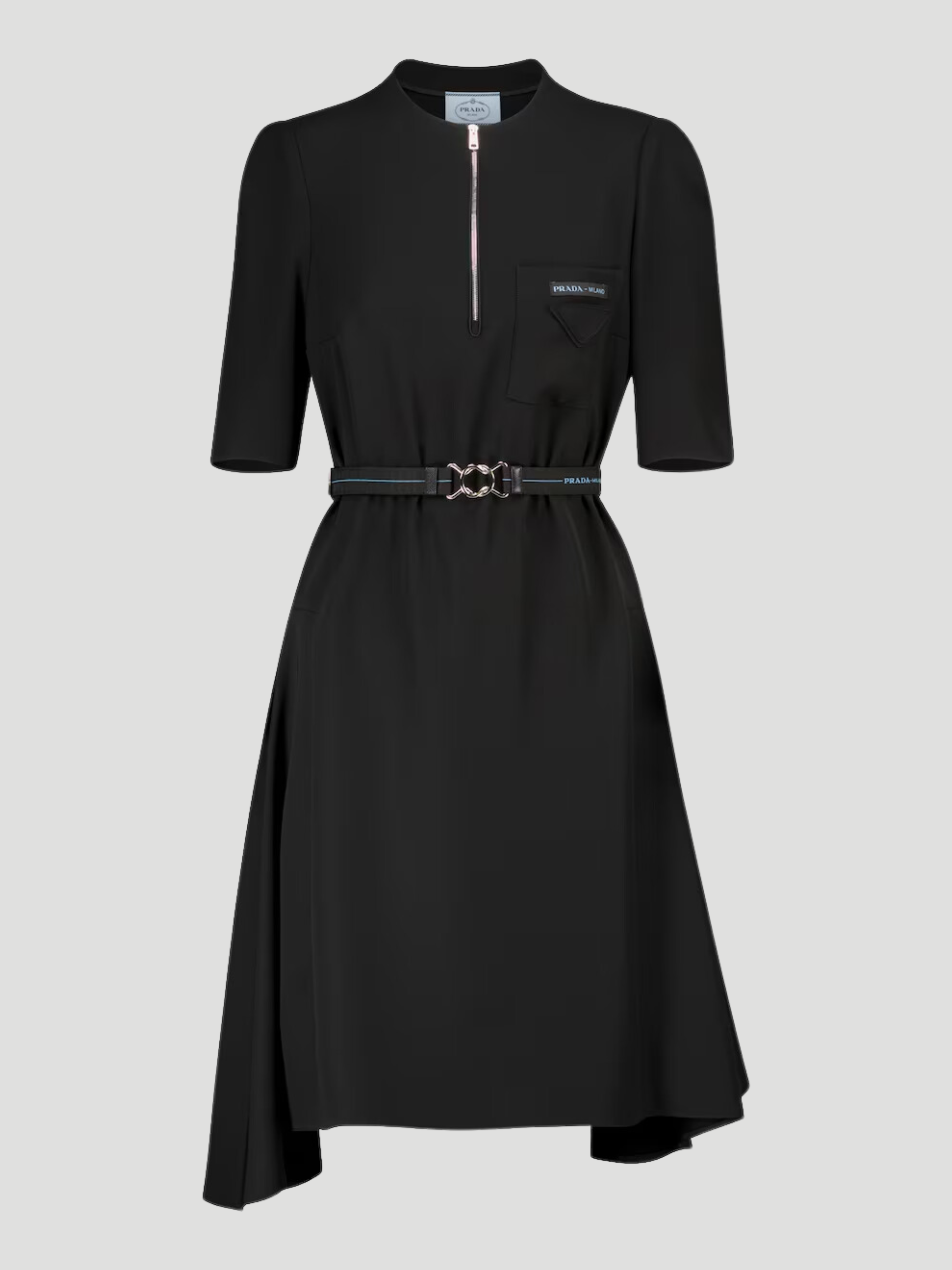 Channel '90s sportswear with Prada's black technical fabric dress. Its slim fit, elasticated waist belt, and zip front deliver a modern aesthetic, while slip pocket and dart detailing add practicality. Pair with futuristic sneakers to complete the look. Expertly crafted for a timeless wardrobe staple.