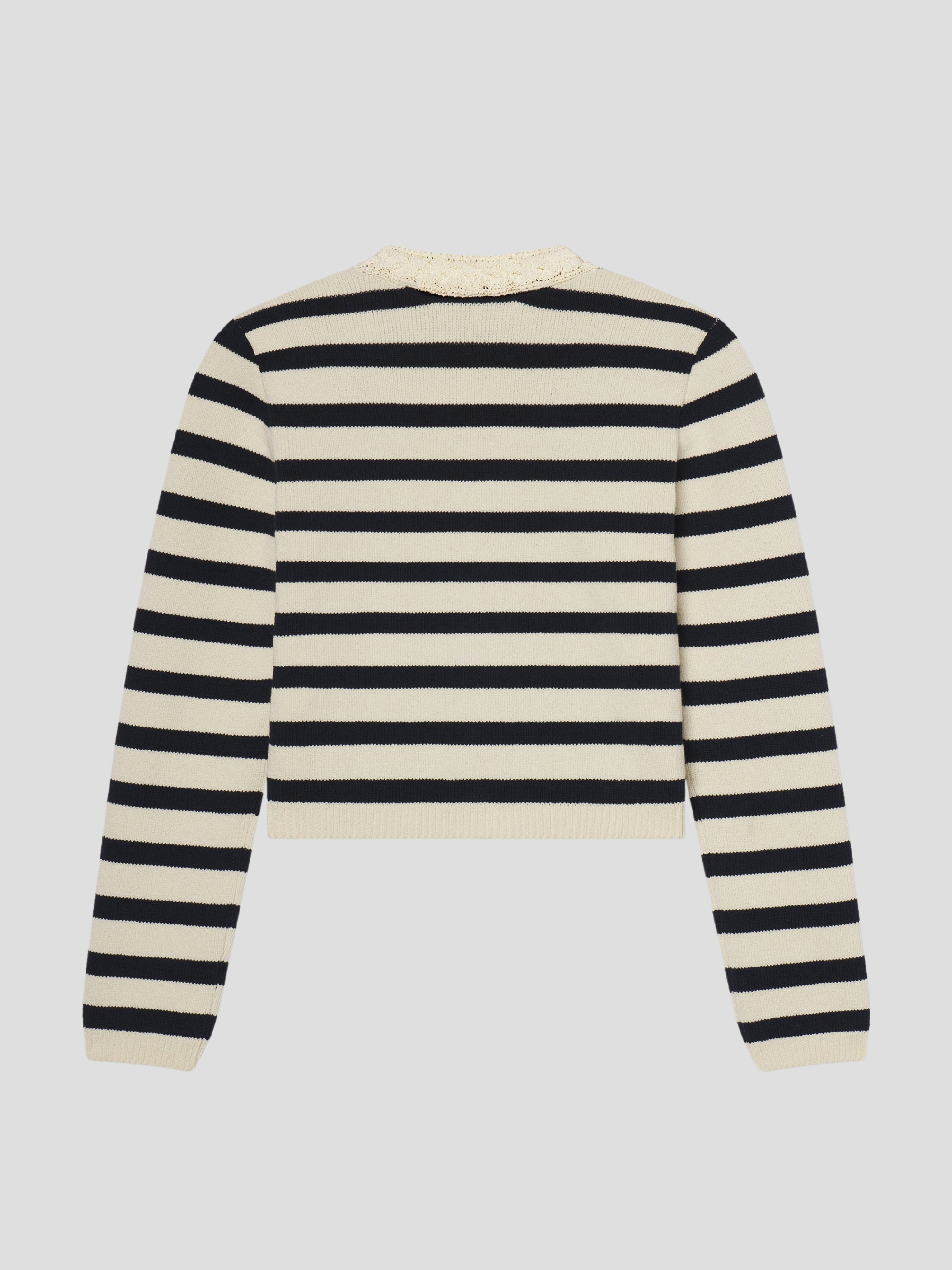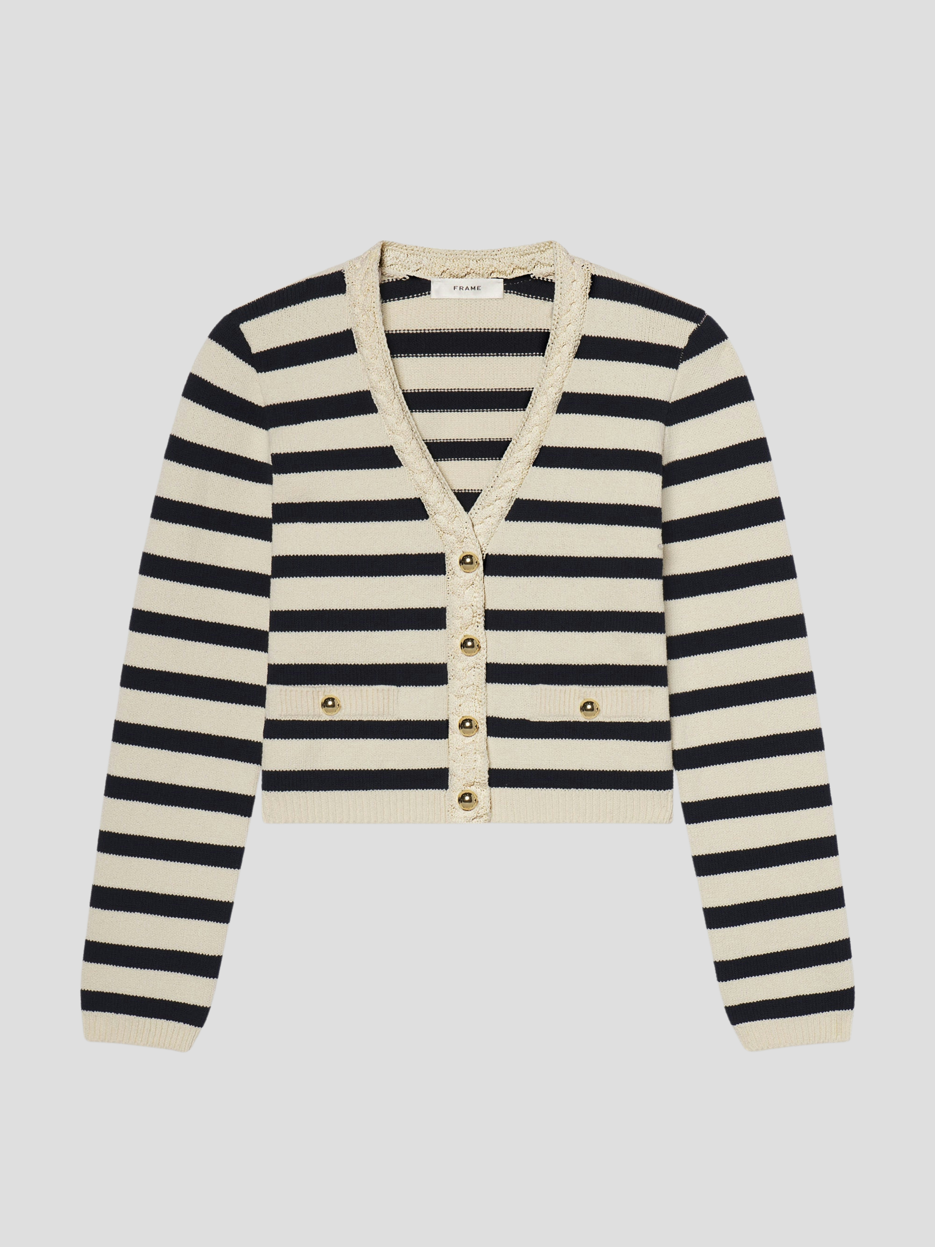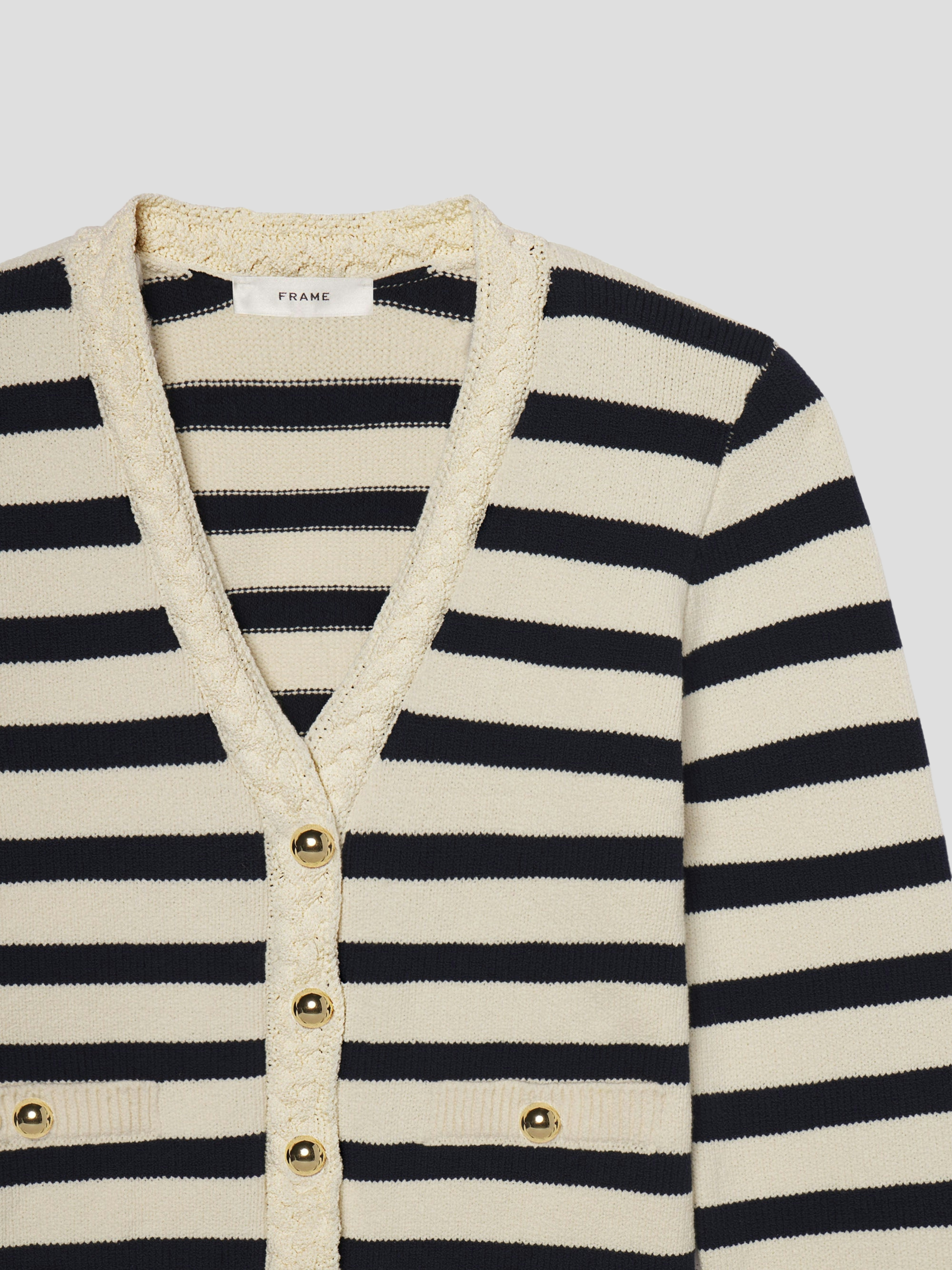 The Harbor Cardigan pairs braided trim and gold buttons with classic navy-and-cream stripes. Slightly cropped at the natural waist, this V-neck knit steers nautical in a new direction—anchored in tradition, finished with charm.