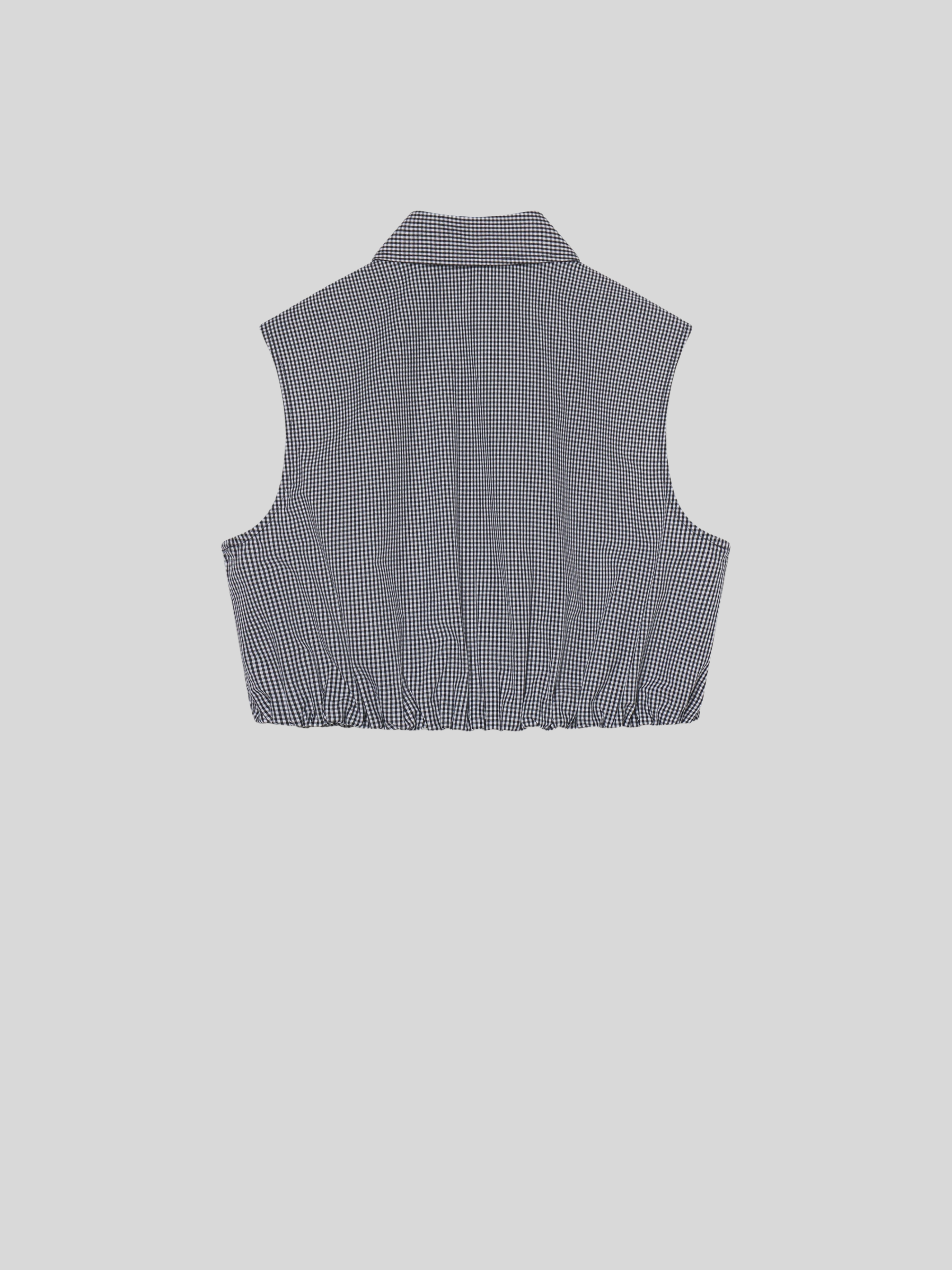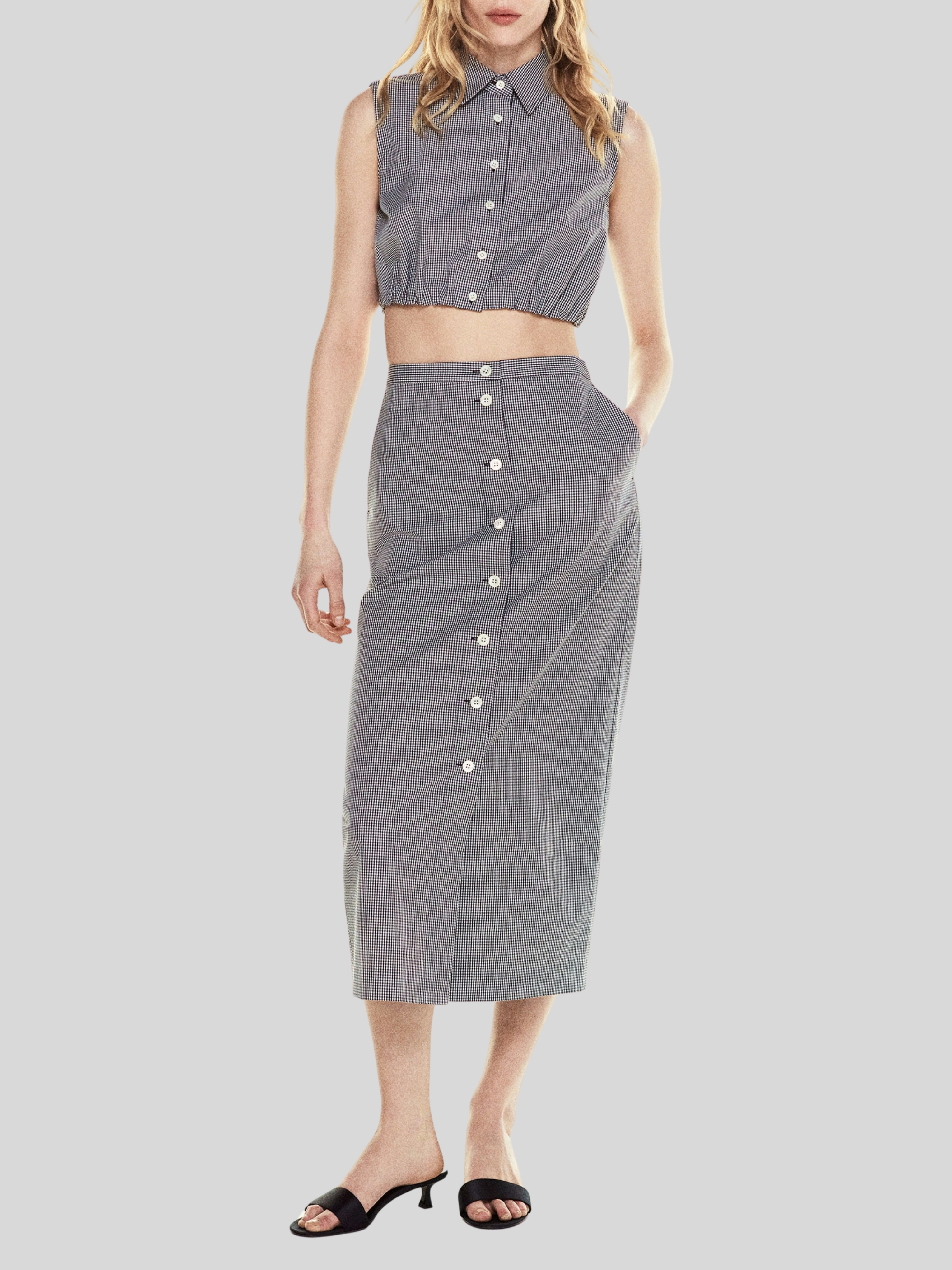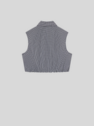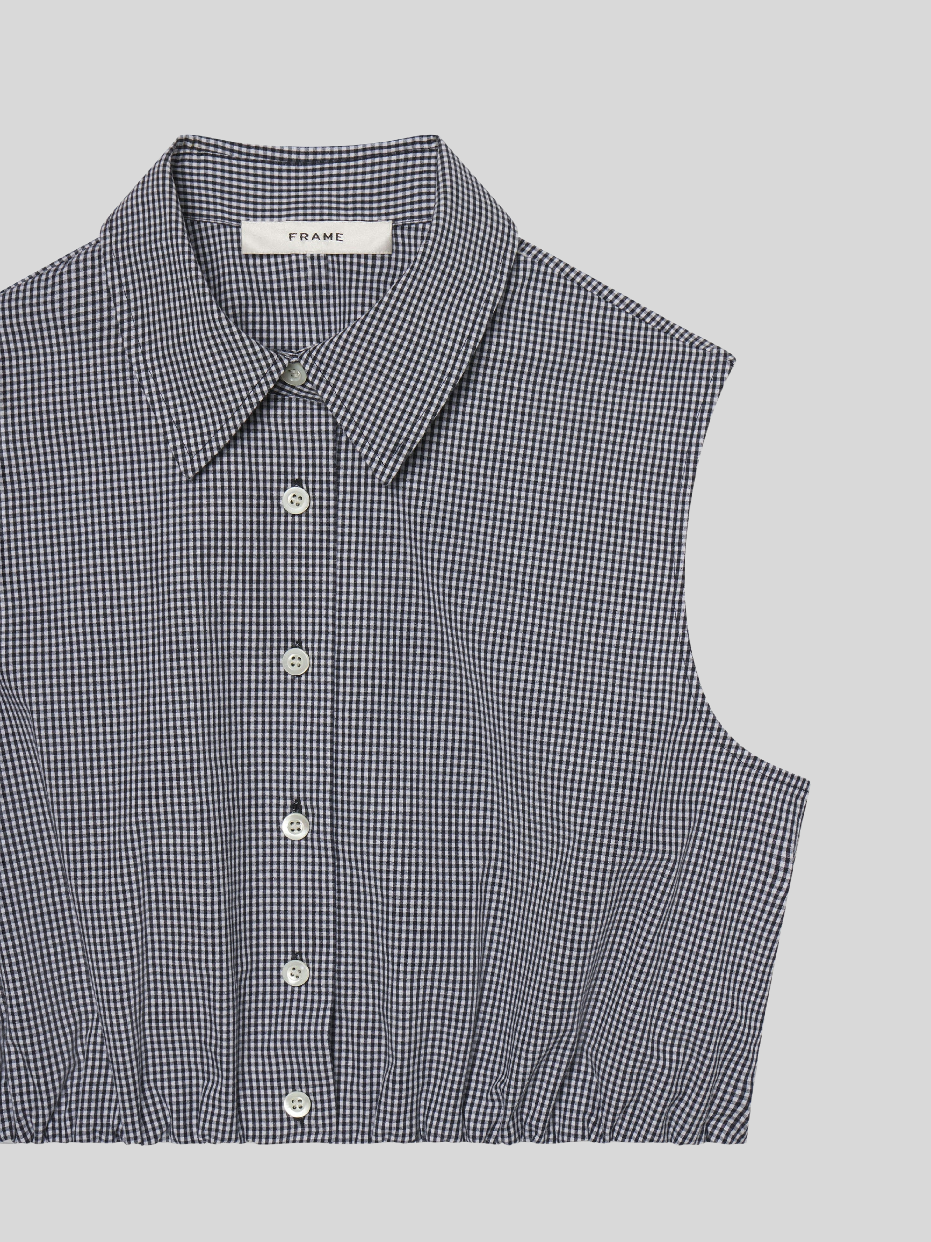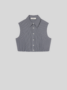 Check, please. This sleeveless, collared top is cropped at the waist with soft gathers at the elastic waist. Lightweight in pure cotton, this navy gingham is made for warm days—and even better with the matching skirt.