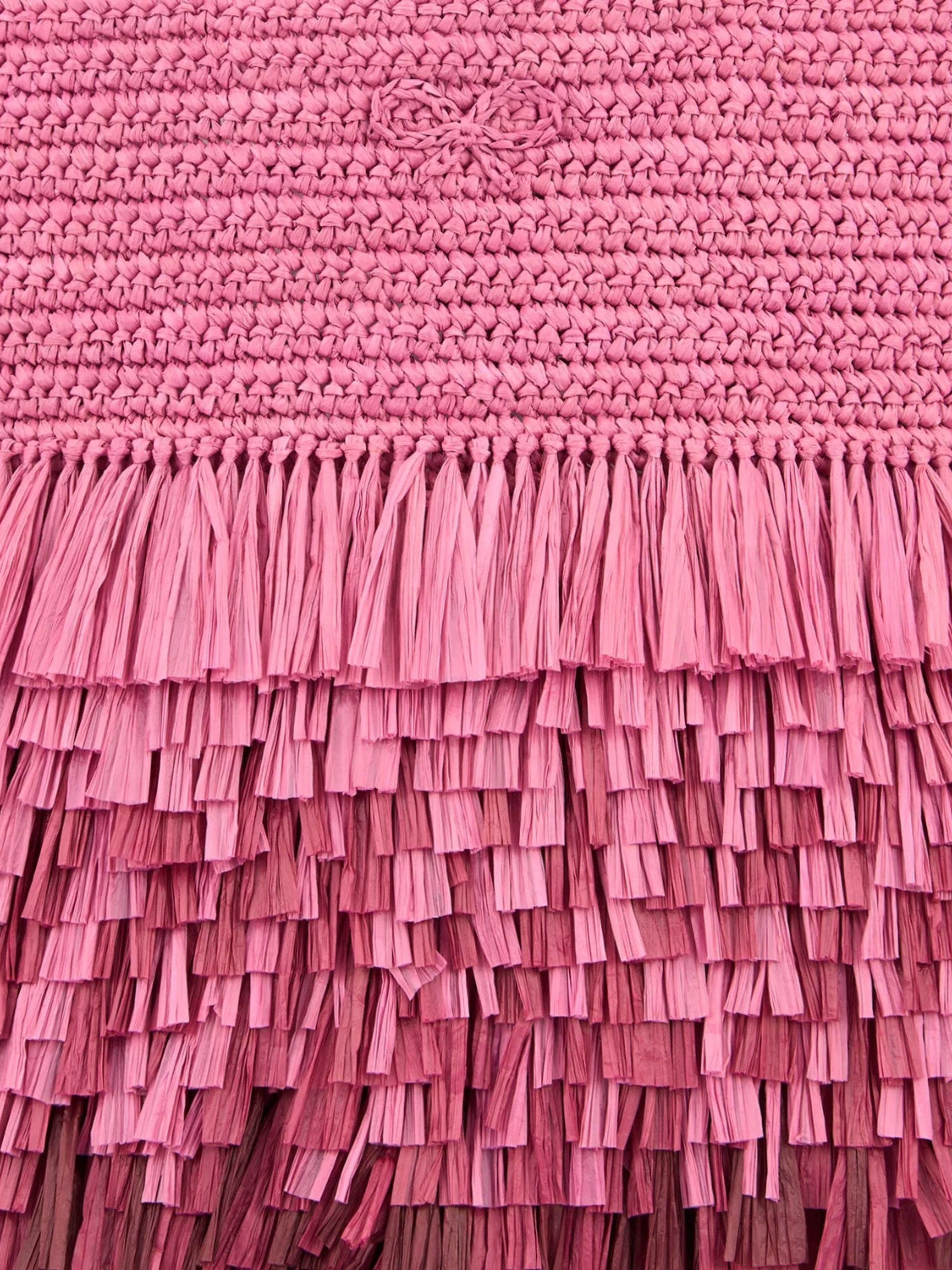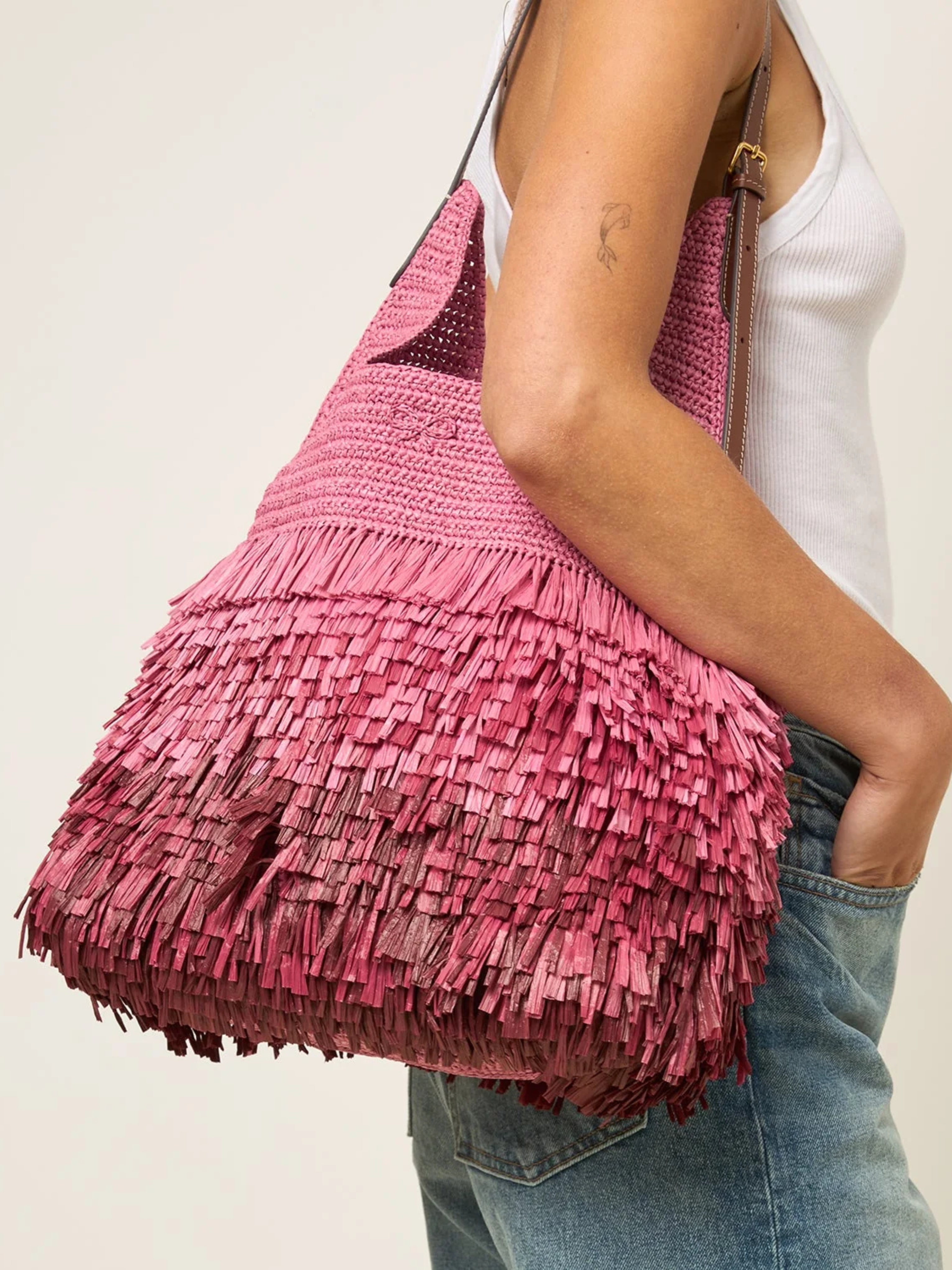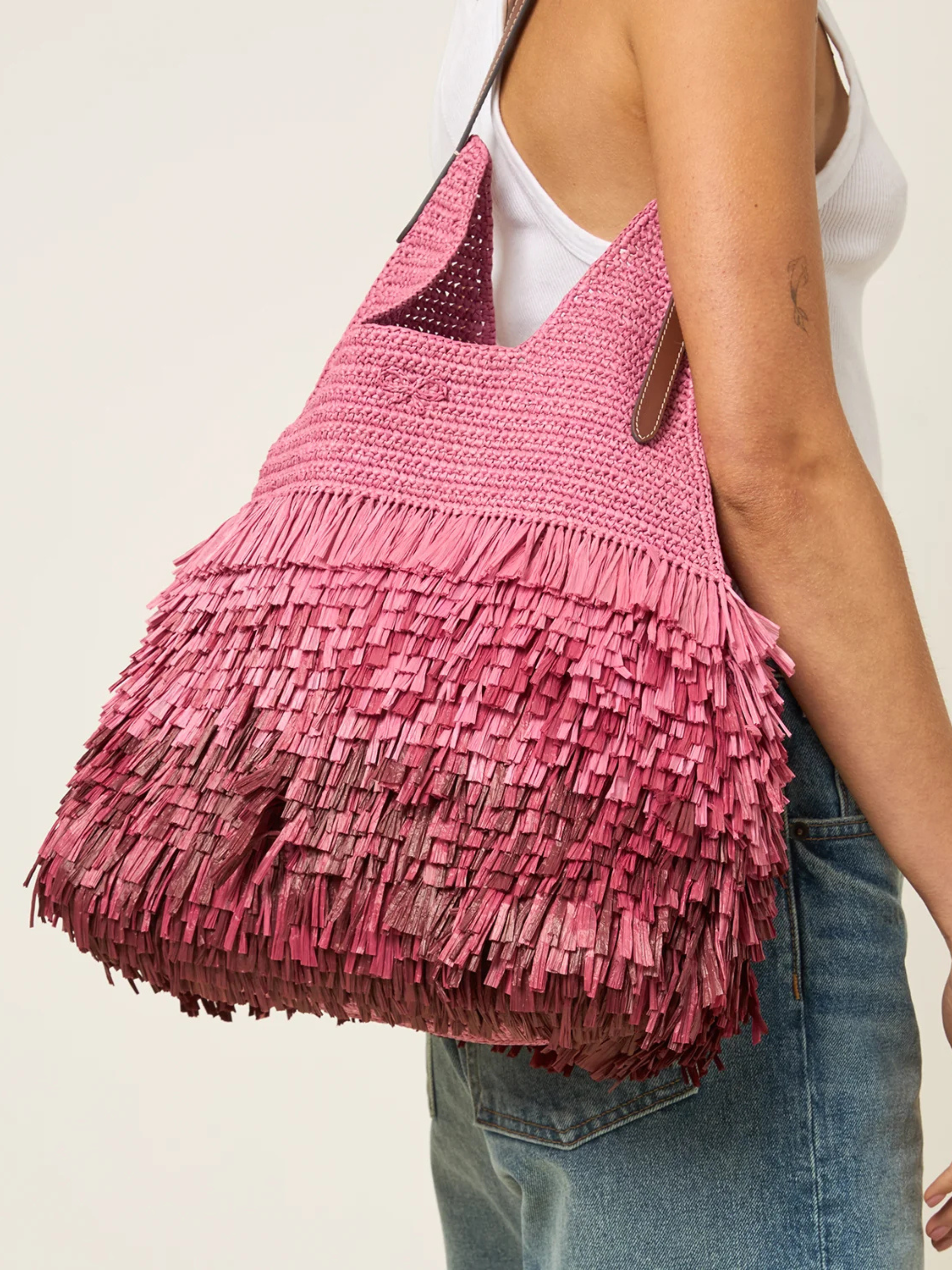 Handwoven from bubblegum-hued raffia, the Bow Hobo Bag is made for summer days. It features fringing in graduating shades of pink, with our bow motif woven into the design. The adjustable shoulder strap and interior are both made from eco leather, and it is roomy enough for everything you may need while on holiday or at home.