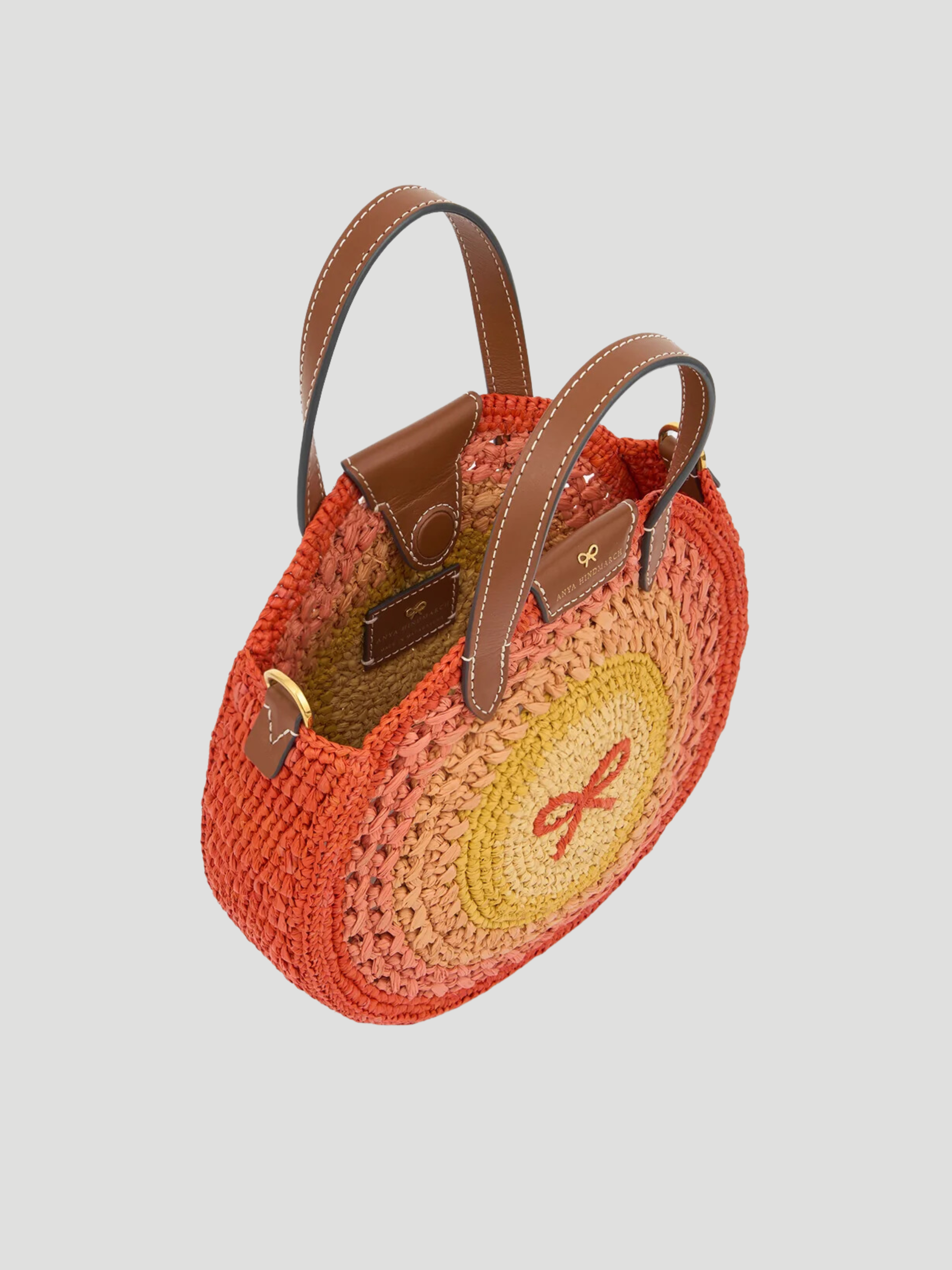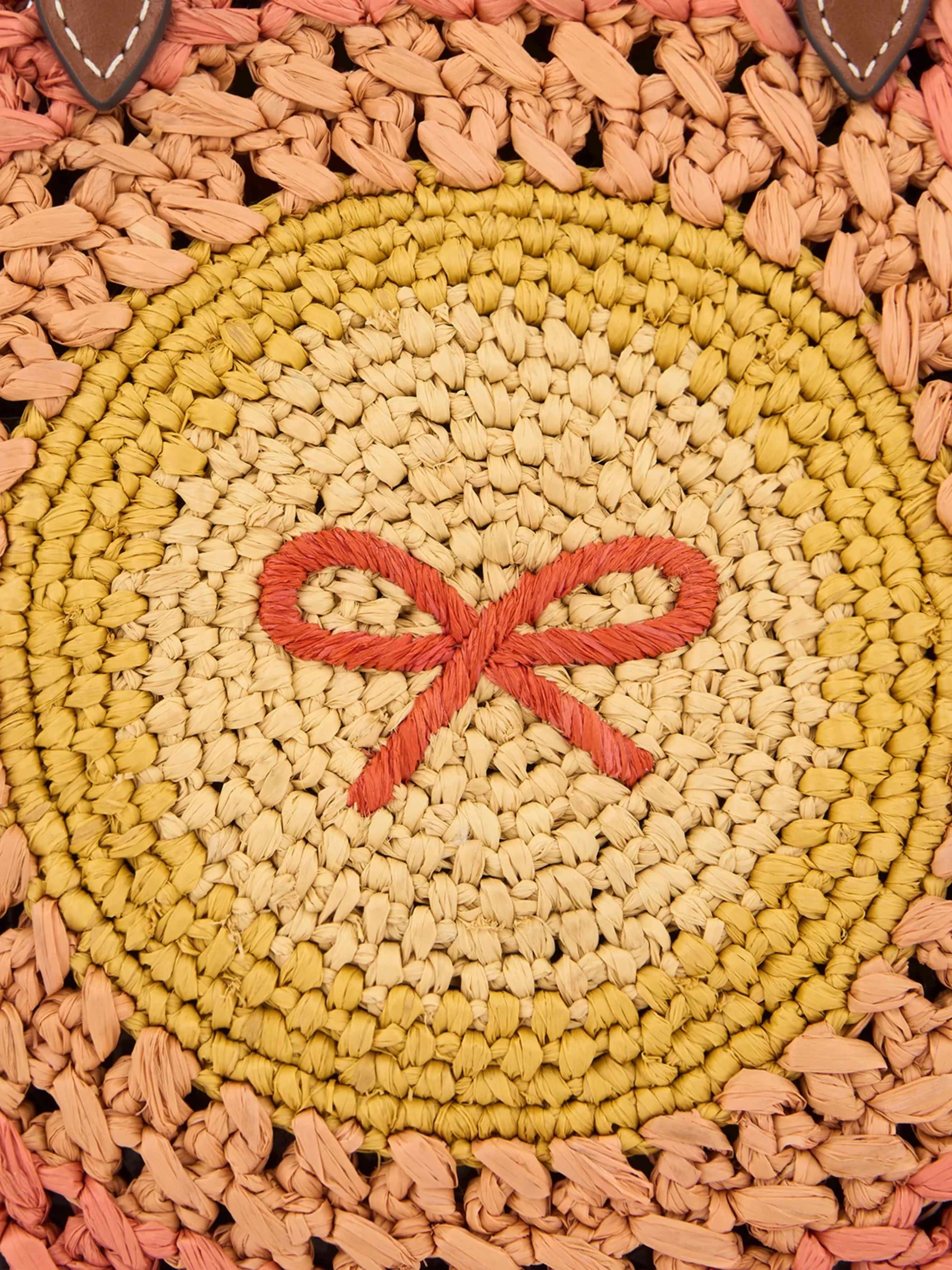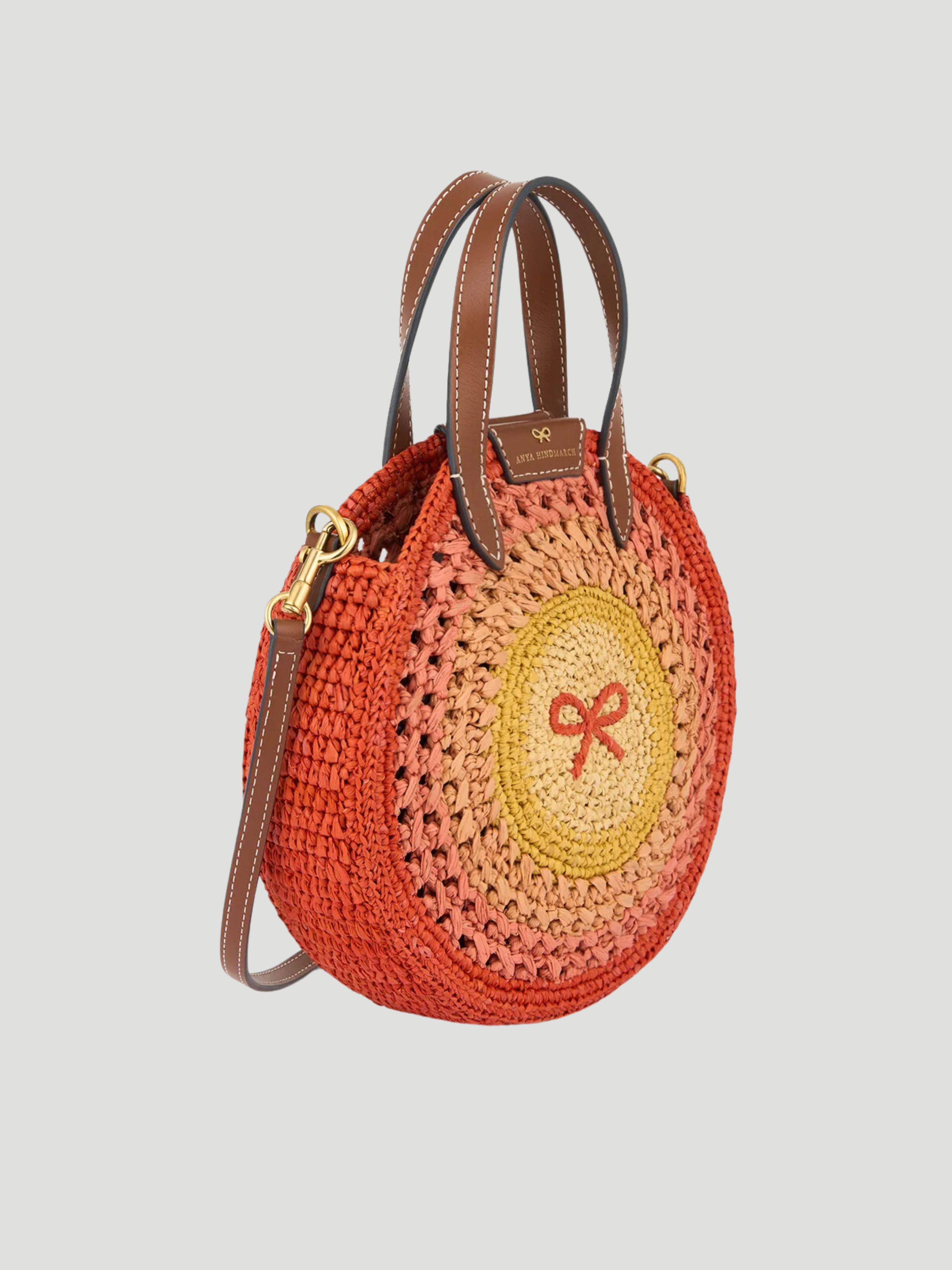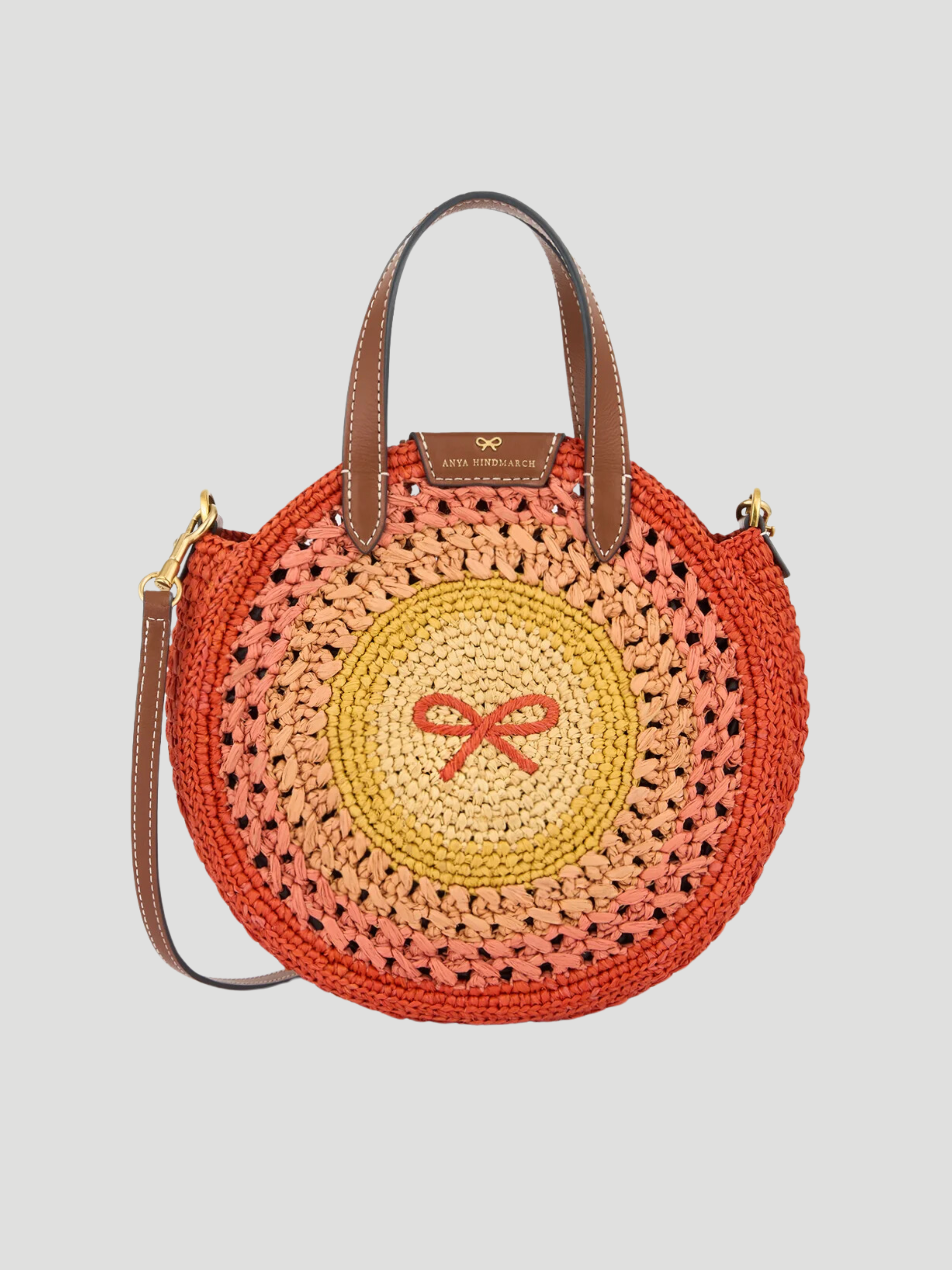 Indulge in luxury with Anya Hindmarch's Raffia Small Round Bow Cross-body Tote. Hand-woven from multicoloured raffia, this bag is perfect for a holiday evening out. The iconic Anya bow takes center stage, while the top zip features an oversized tassel made from smooth eco leather. With enough space for your essentials, it's the perfect blend of style and functionality.