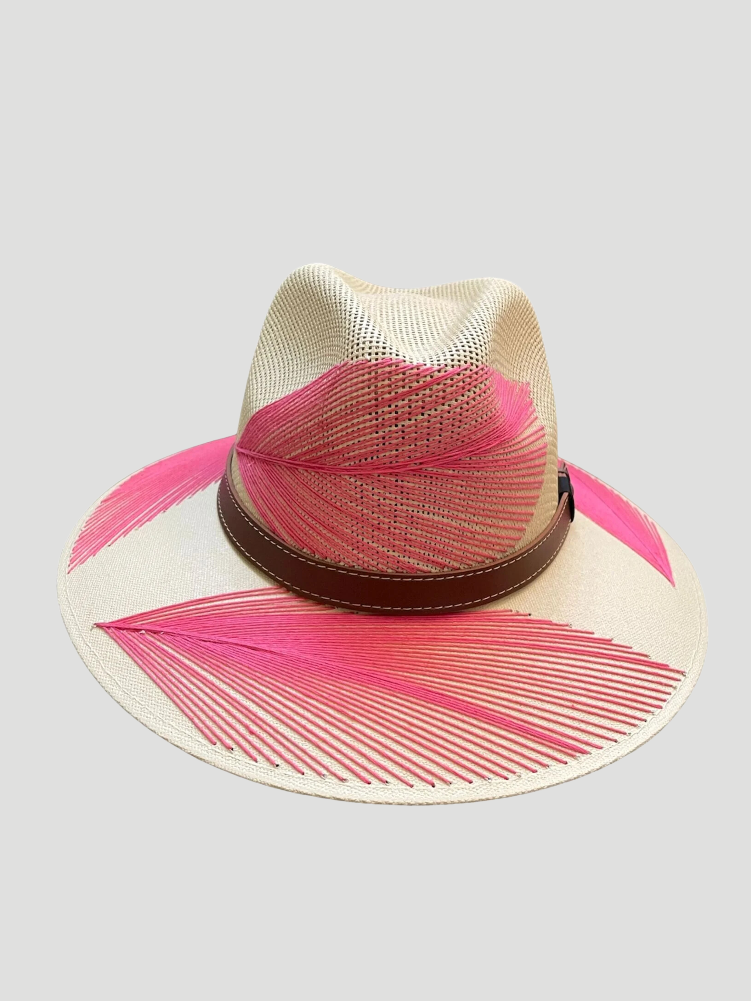 Exude elegance and artistry with our Plumas Hat in Pink. Hand-stitched feather designs by skilled female Mexican artisans add a unique touch to the classic fedora silhouette. Designed for comfort and style, the medium size and water-resistant material make it suitable for any occasion. From Chisme Lifestyle.