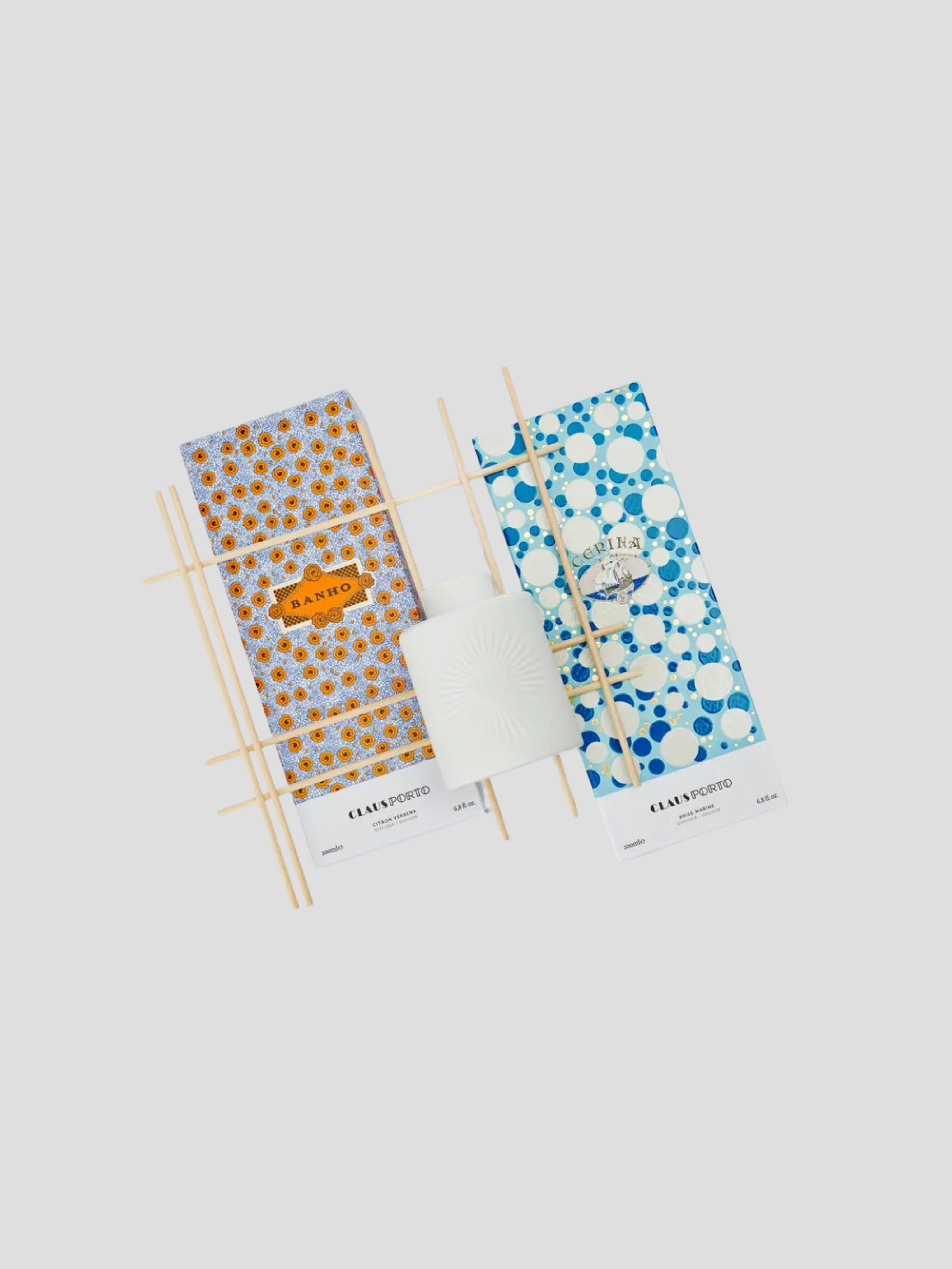 Let Banho fill your home with the fresh, uplifting scents of Mediterranean citrus groves. Claus Porto diffusers are the ultimate in-home fragrance luxury, combining distinctive visuals with inspirational fragrances. Natural rattan reed sticks are held in a biscuit porcelain vase designed with elegant white simplicity. Contains 2x3,4 fl.oz. bottles of fragrance.