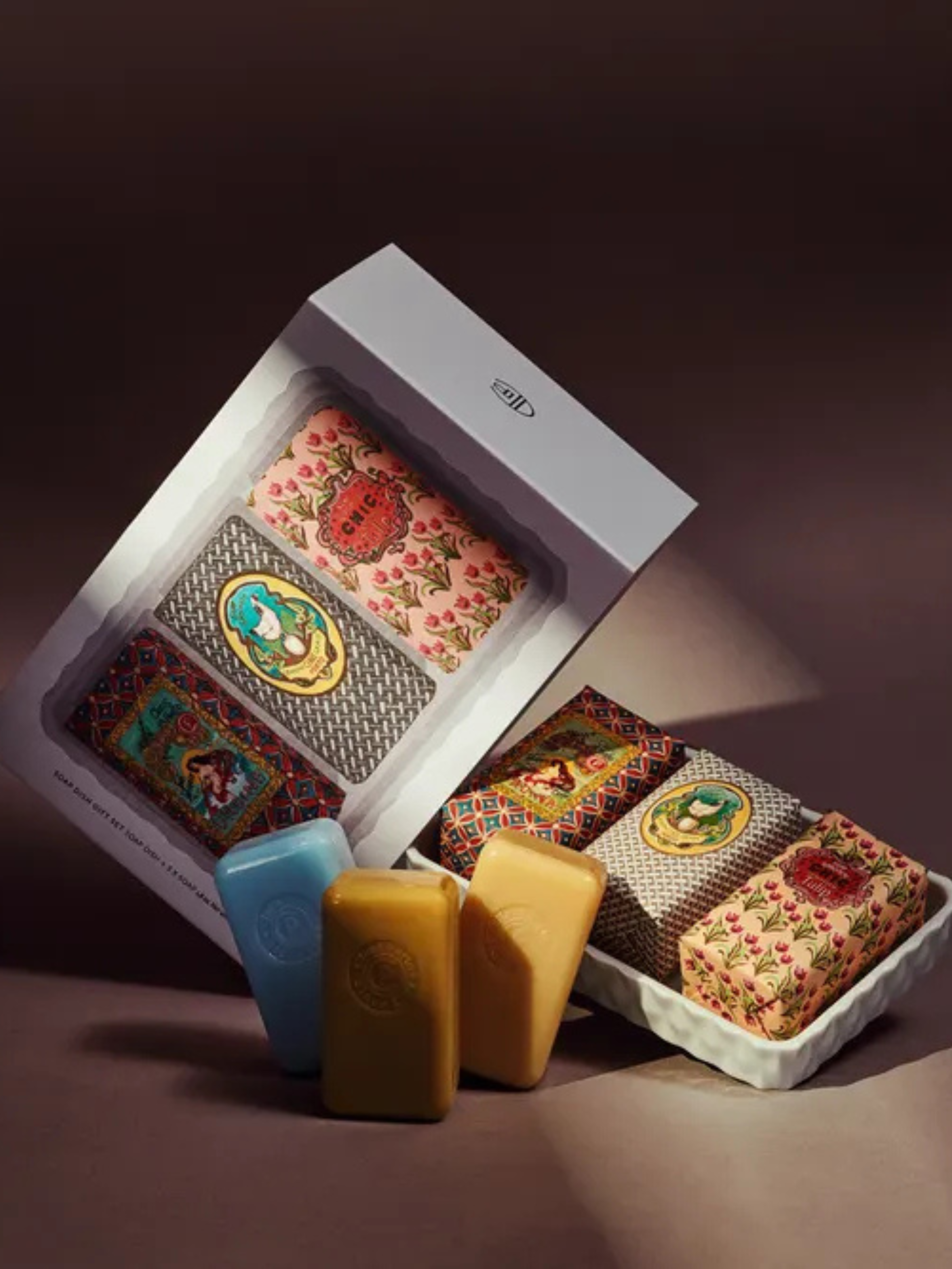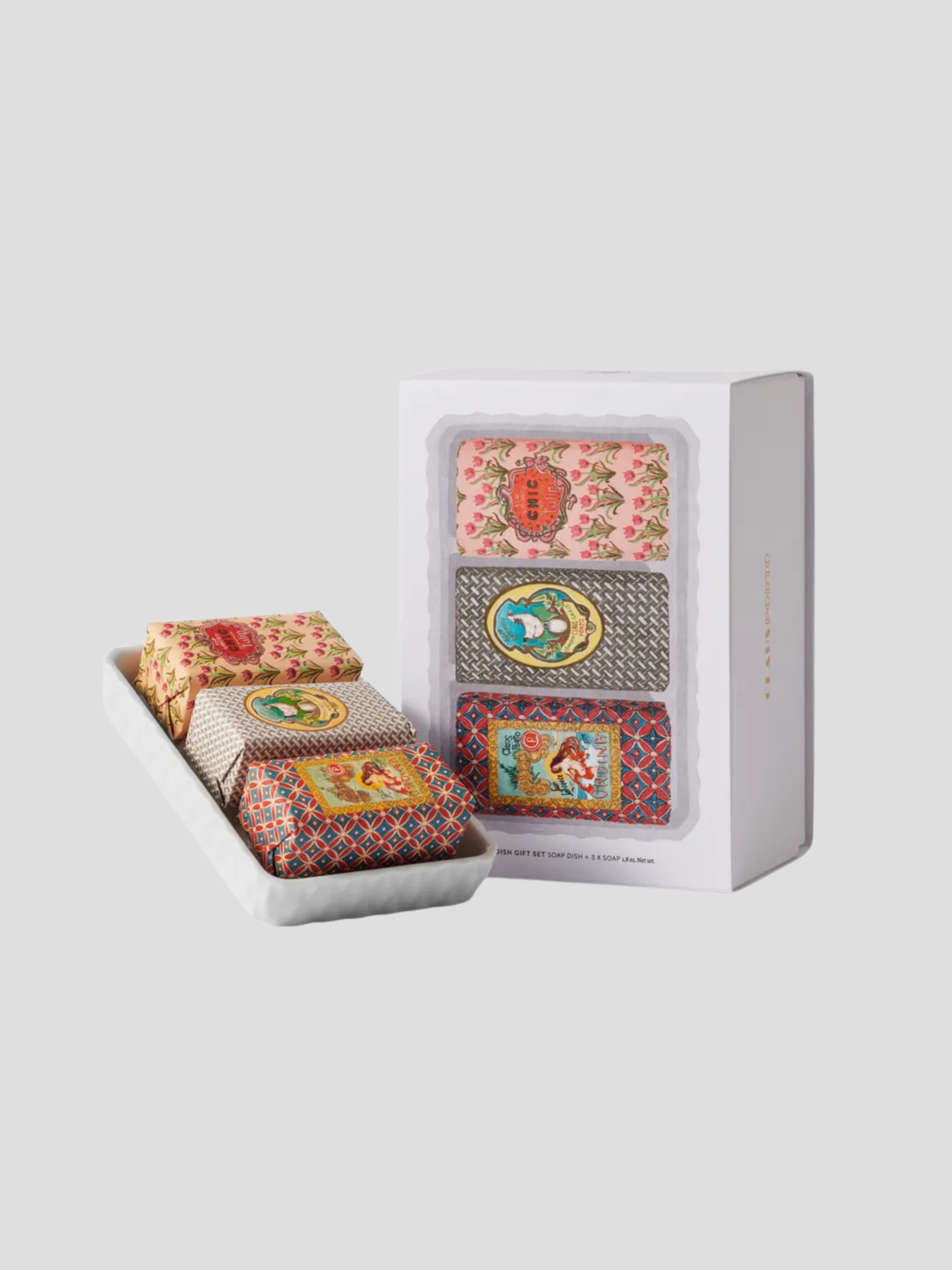 This Gift Set contains three soaps from our Classico Collection: the delicate Ondina, the refreshing Chicken and the heartwarming Chic. Made with nourishing oils, 100% of vegetable origin, these soaps with Belle Époque-inspired labels play a fundamental role in our brand's unique story. This set also contains an elegant porcelain soap dish, made in Portugal, exclusively for Claus Porto.