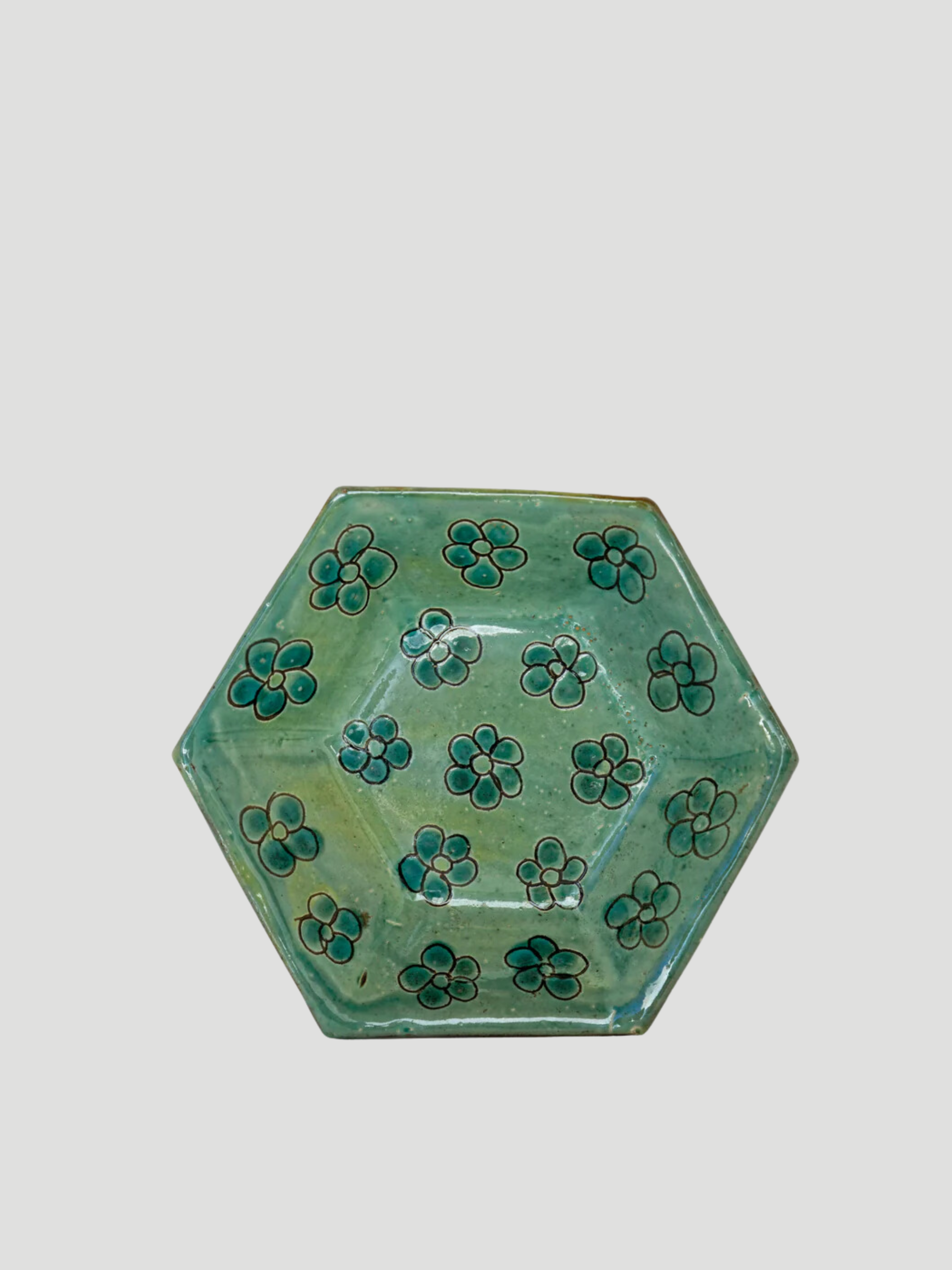 Dainty daisies bloom across this hexagonal dessert plate from Michele Safra Interiors, infusing your tablescape with an enchanting floral touch. Handcrafted from high-fired Aswan clay and finished with a lead-free glaze, each plate is a delicate piece of art that brings elegance and charm to any setting. Perfect for serving slices of gâteau to guests or for use as a decorative piece in your home, it seamlessly combines functionality with artistry.