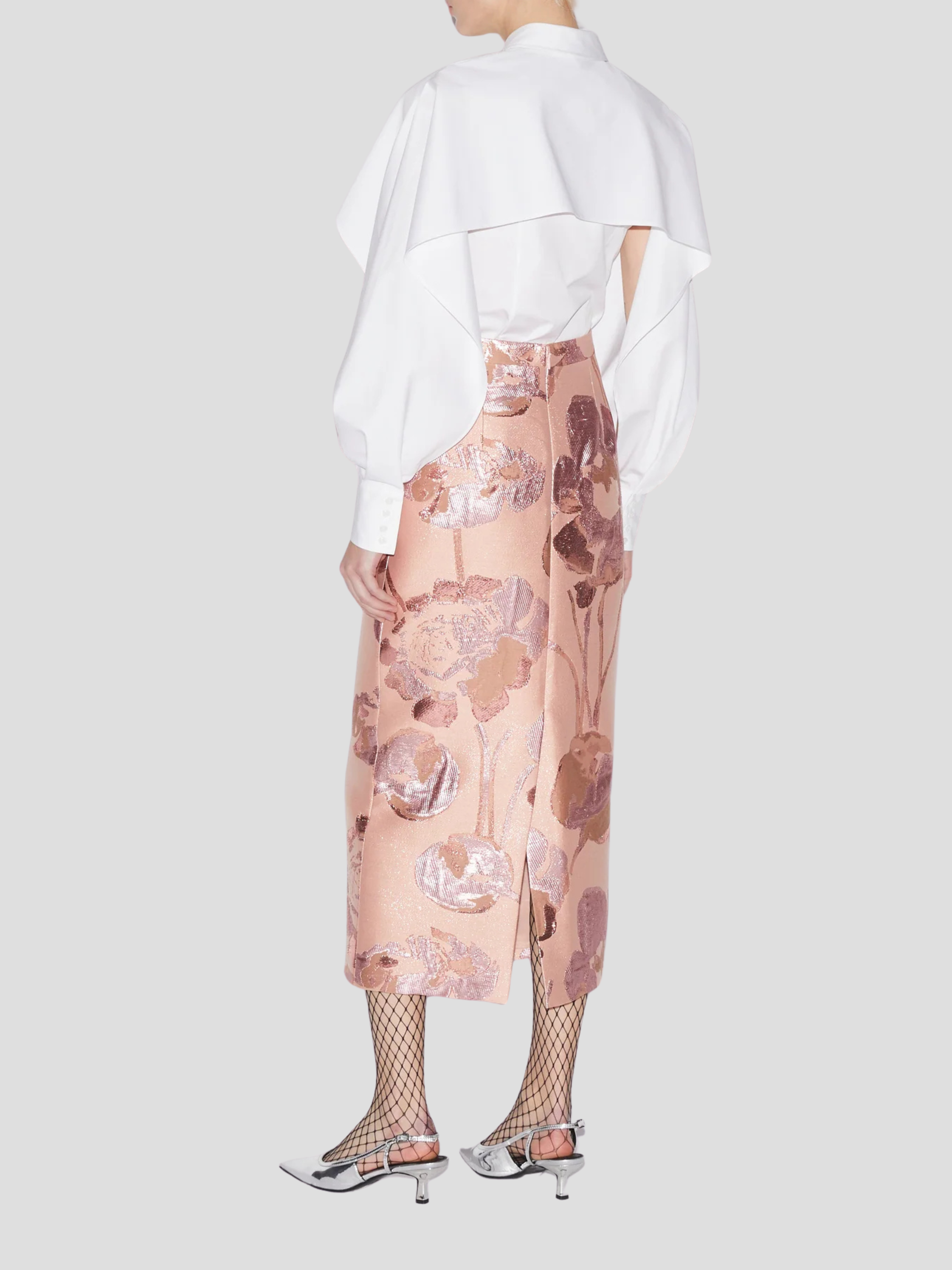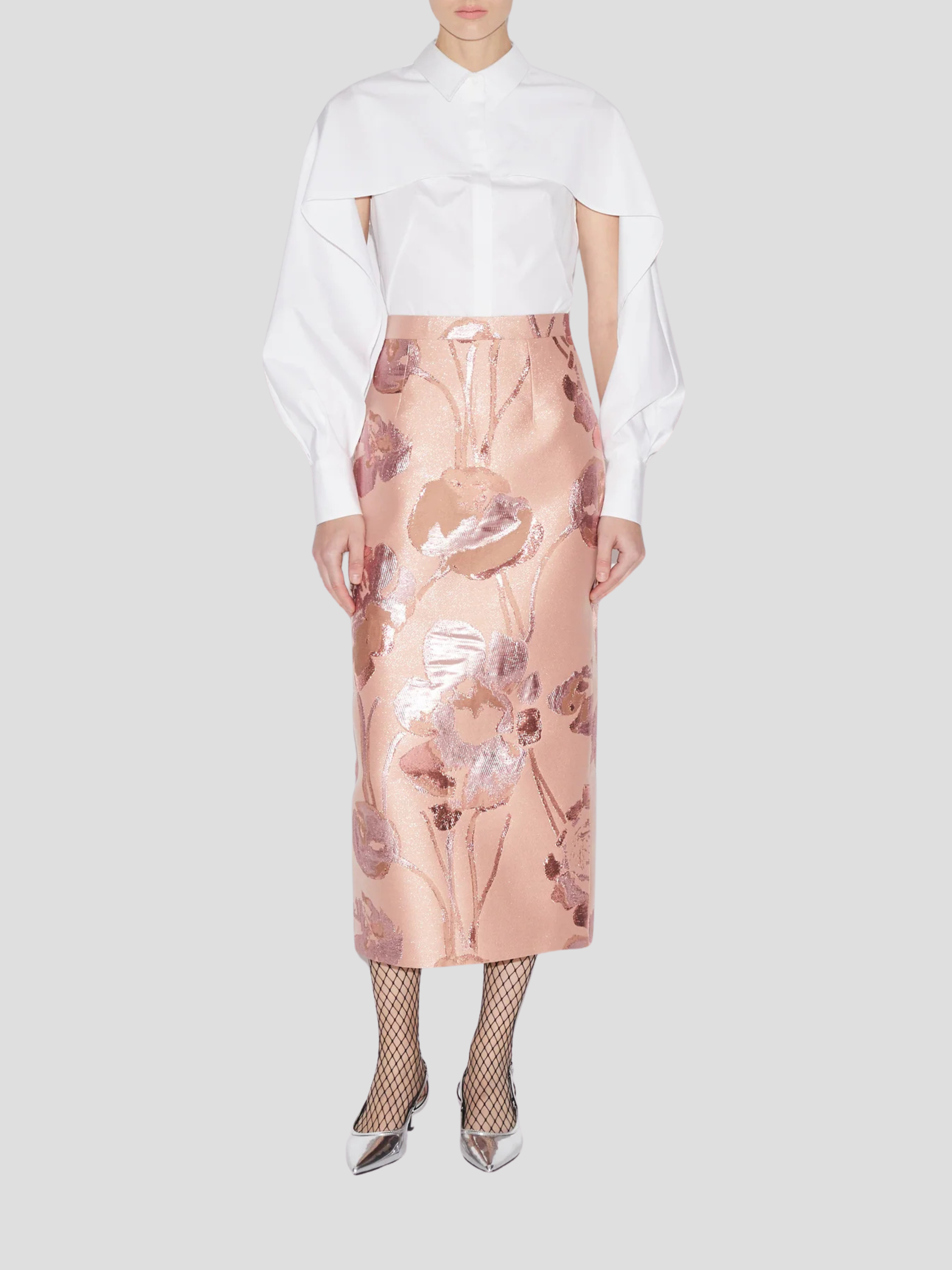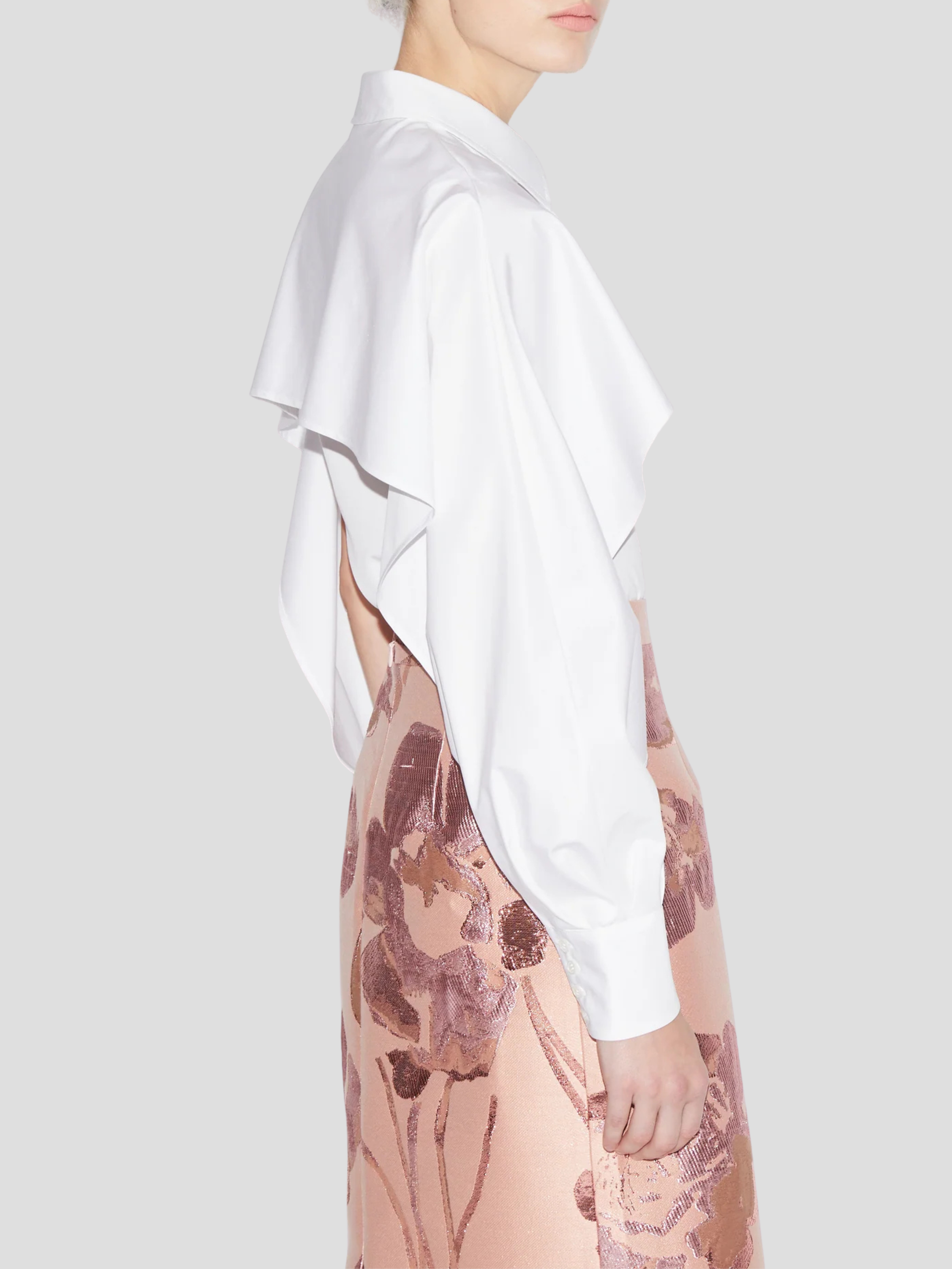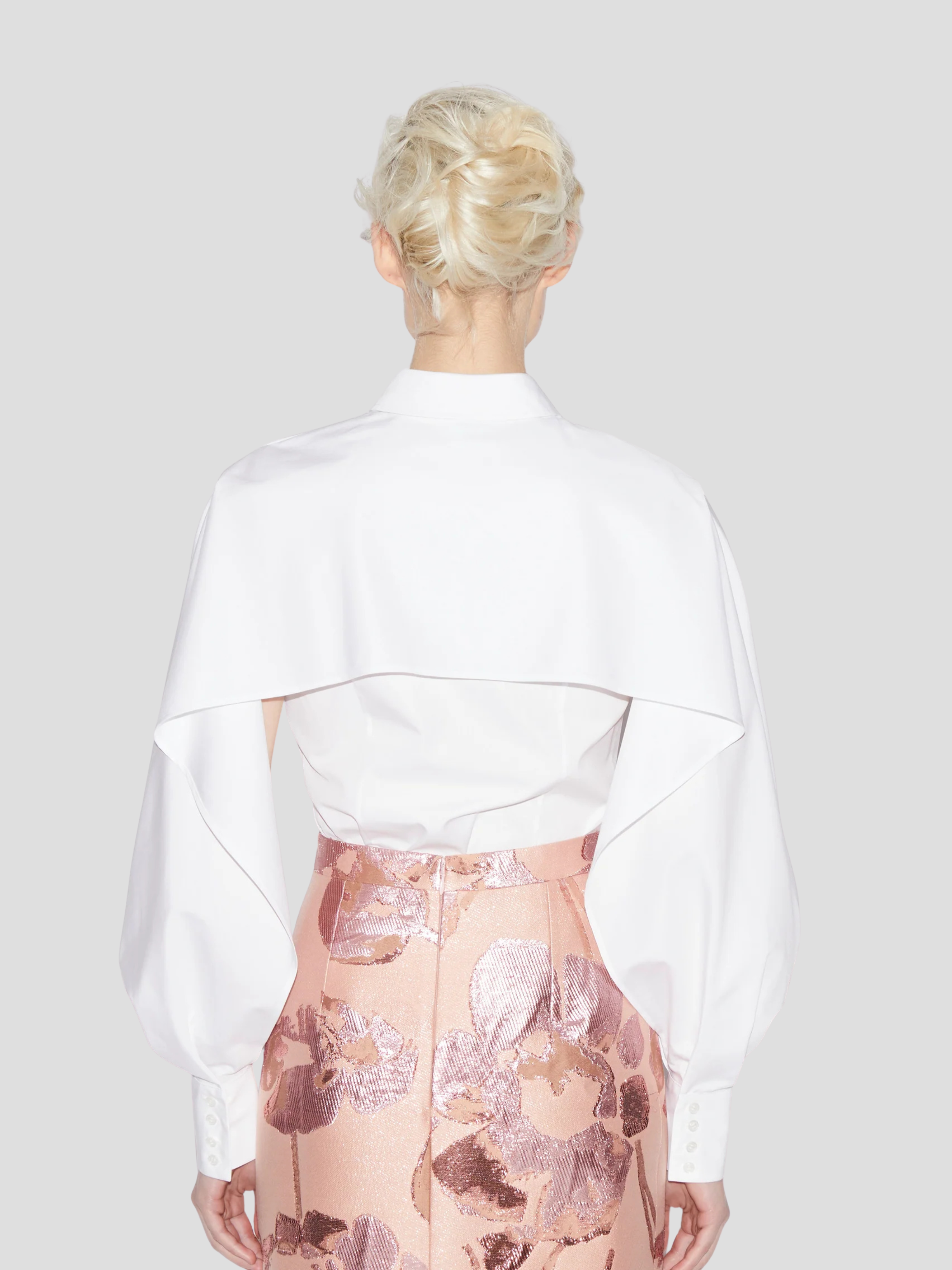 The Edwidge Shirt reinvents classic tailoring with sculptural elegance. Cut from crisp white cotton, this refined silhouette features a sharp collar and concealed placket, while its standout detail—a dramatic cape-like overlay cascading over the shoulders—adds architectural volume and modern femininity. With voluminous sleeves that taper into wide cuffs, the Edwidge Shirt is a statement staple that transitions effortlessly from day to evening.