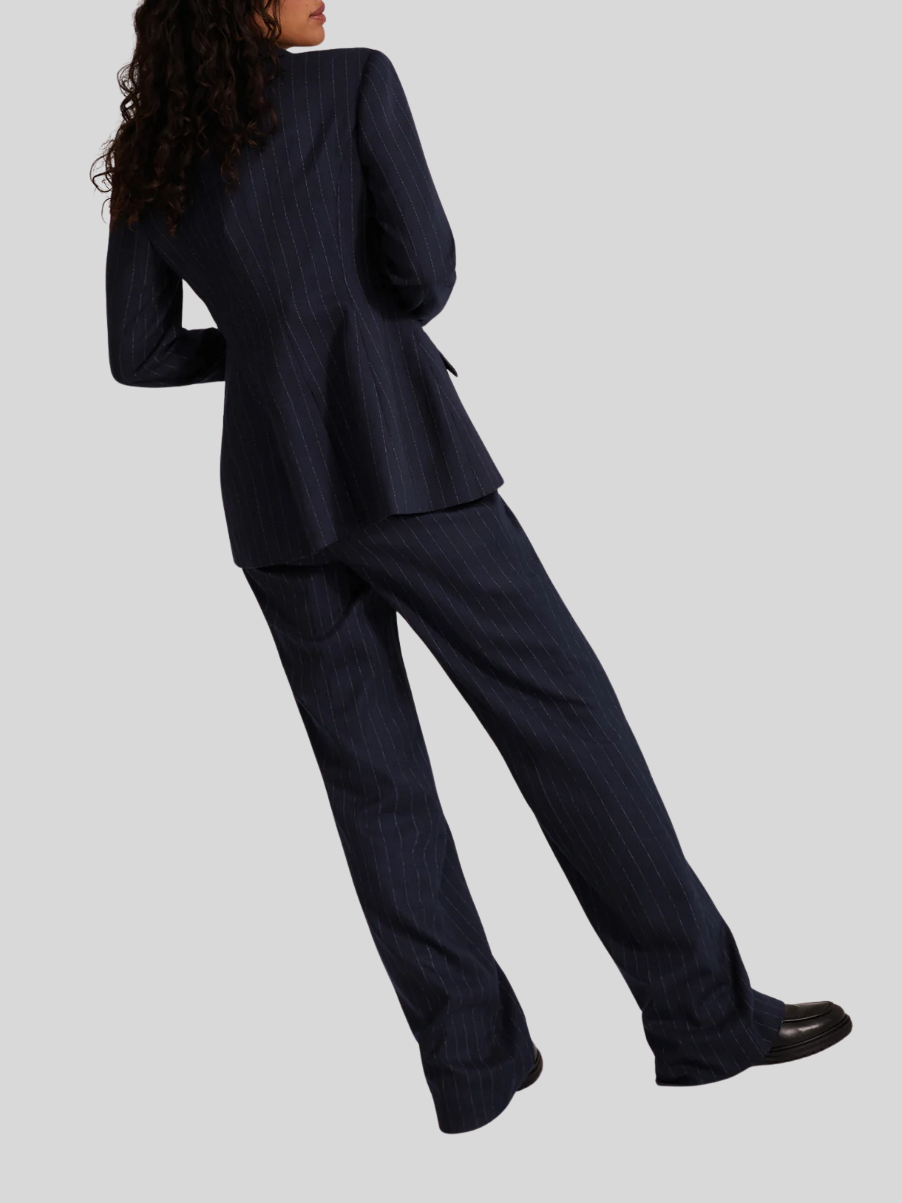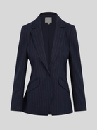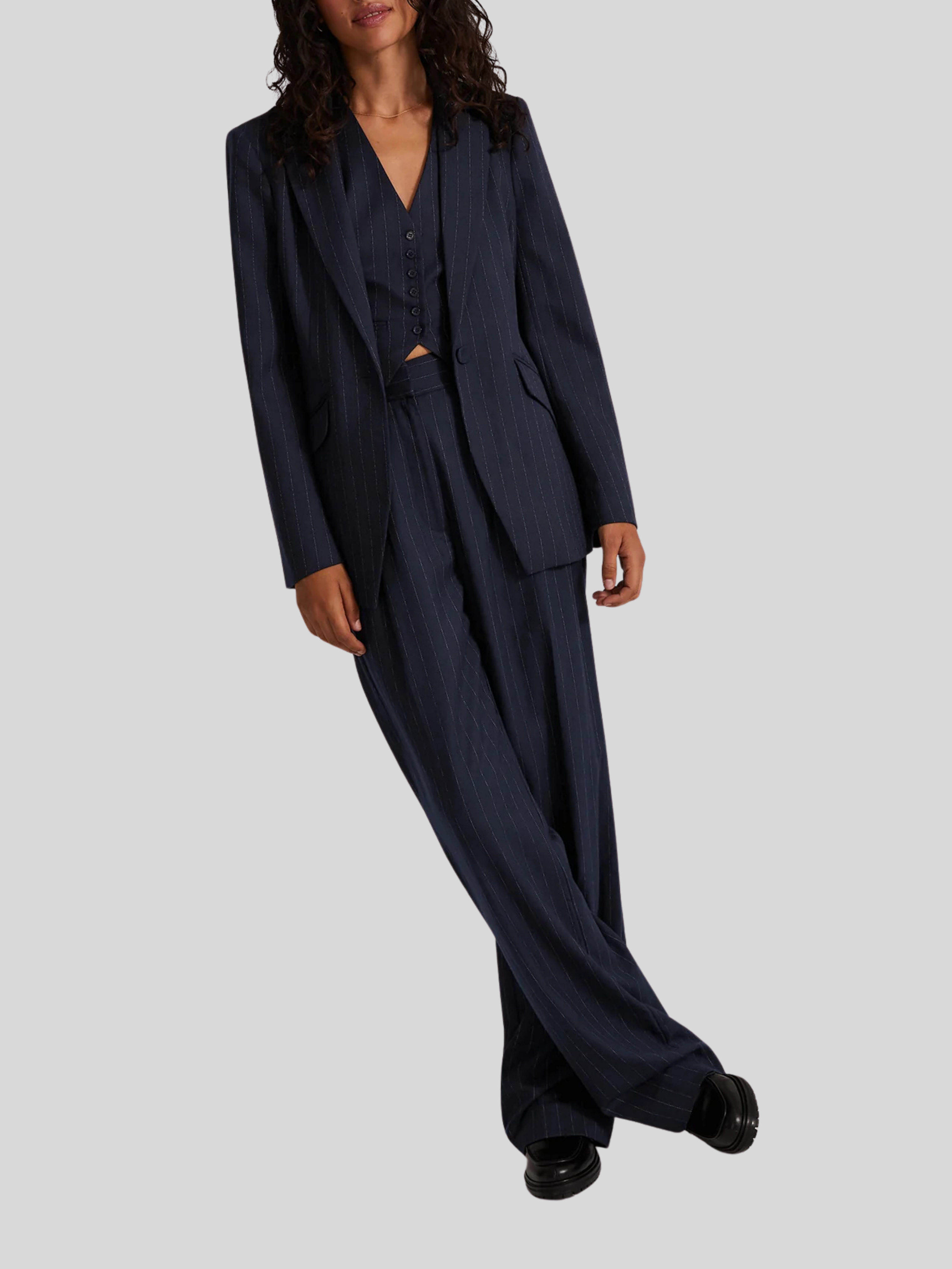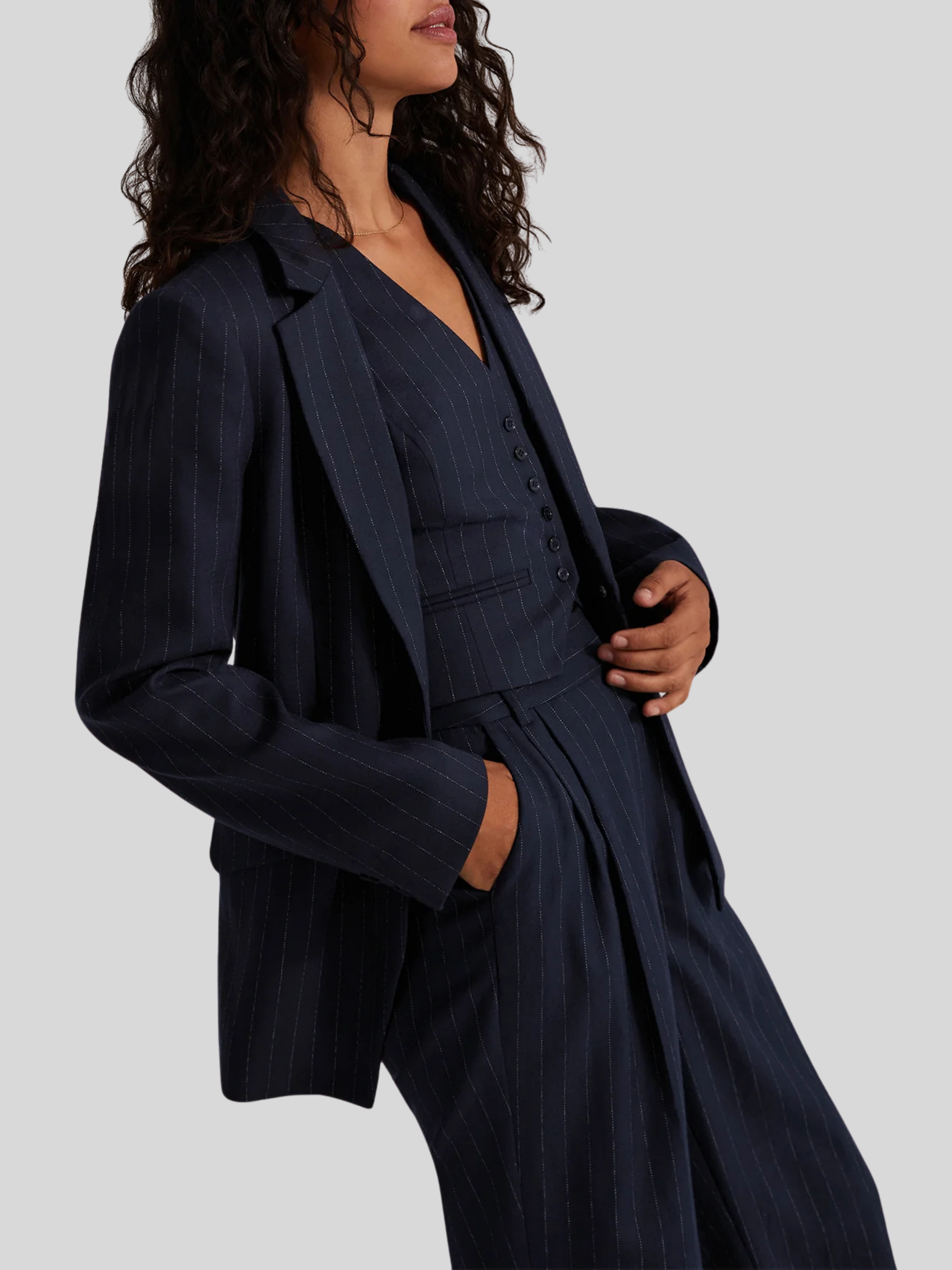 Our single button blazer could be our single most favorite layer. Crafted in navy pinstripe in a blend suiting fabric, The Favorite Blazer has a contoured waist so it hangs beautifully and gives just enough shape and structure. We wear it with everything (yes, everything) but we swoon over the suiting set when paired with The Favorite Vest.