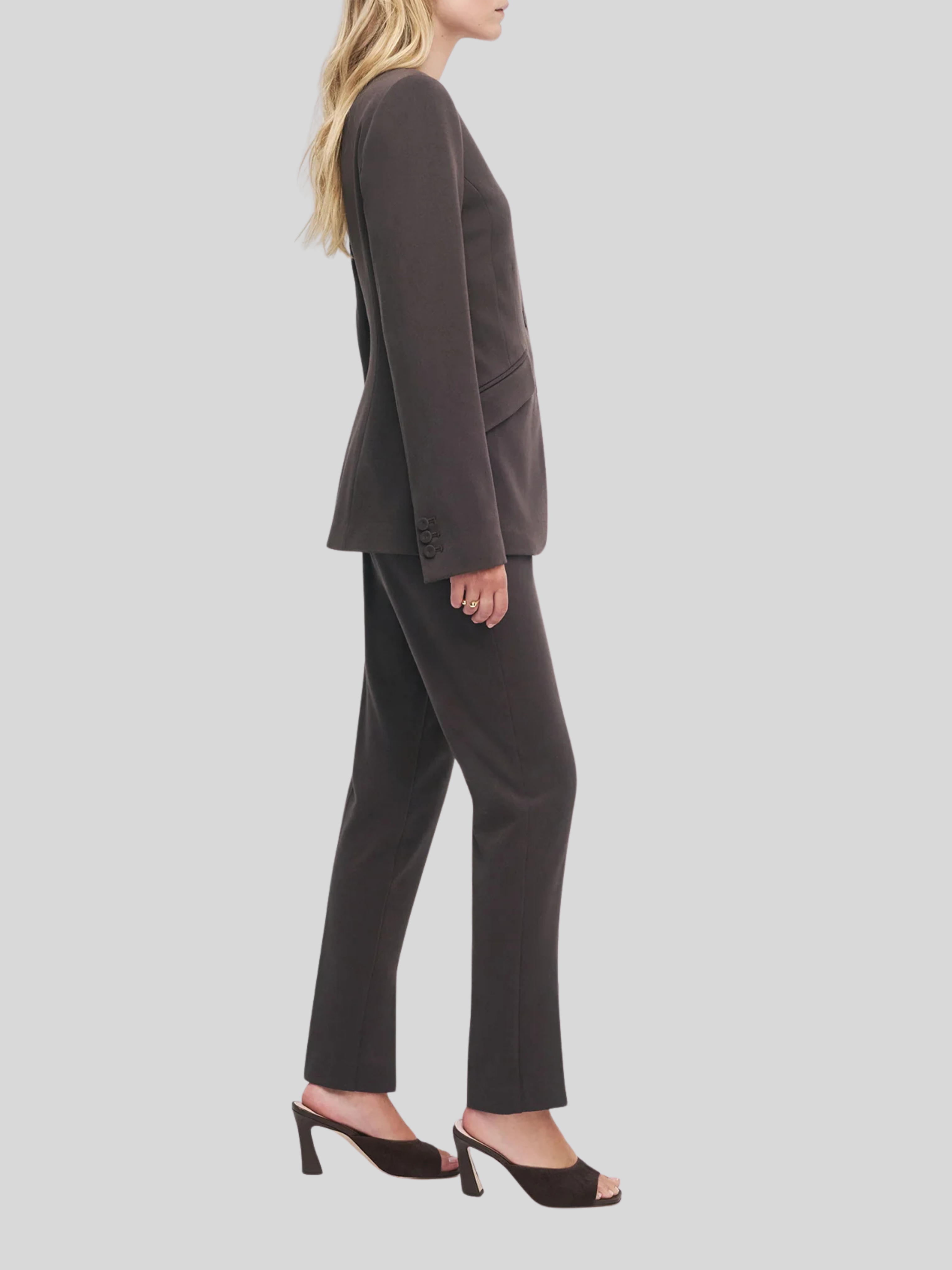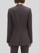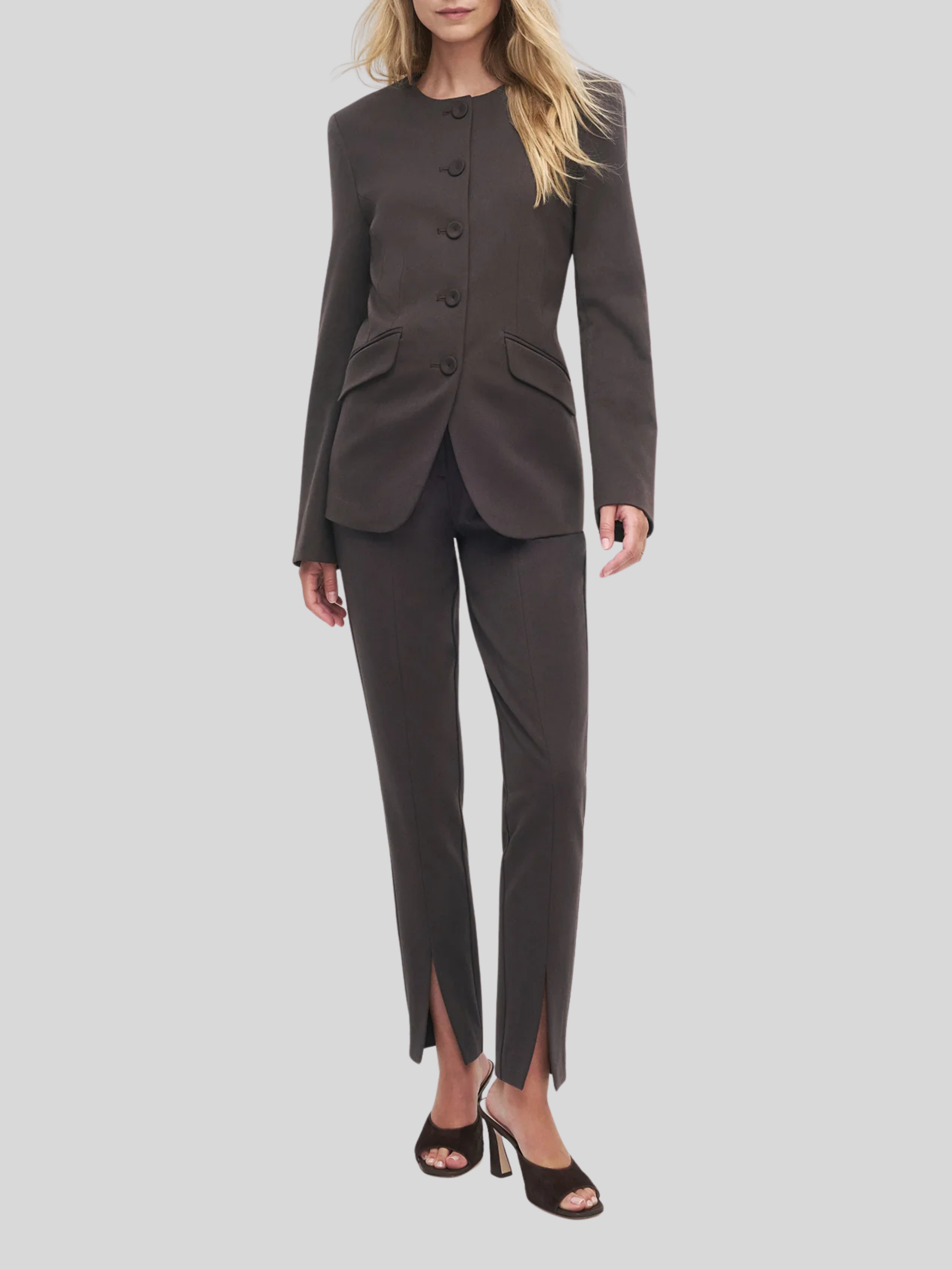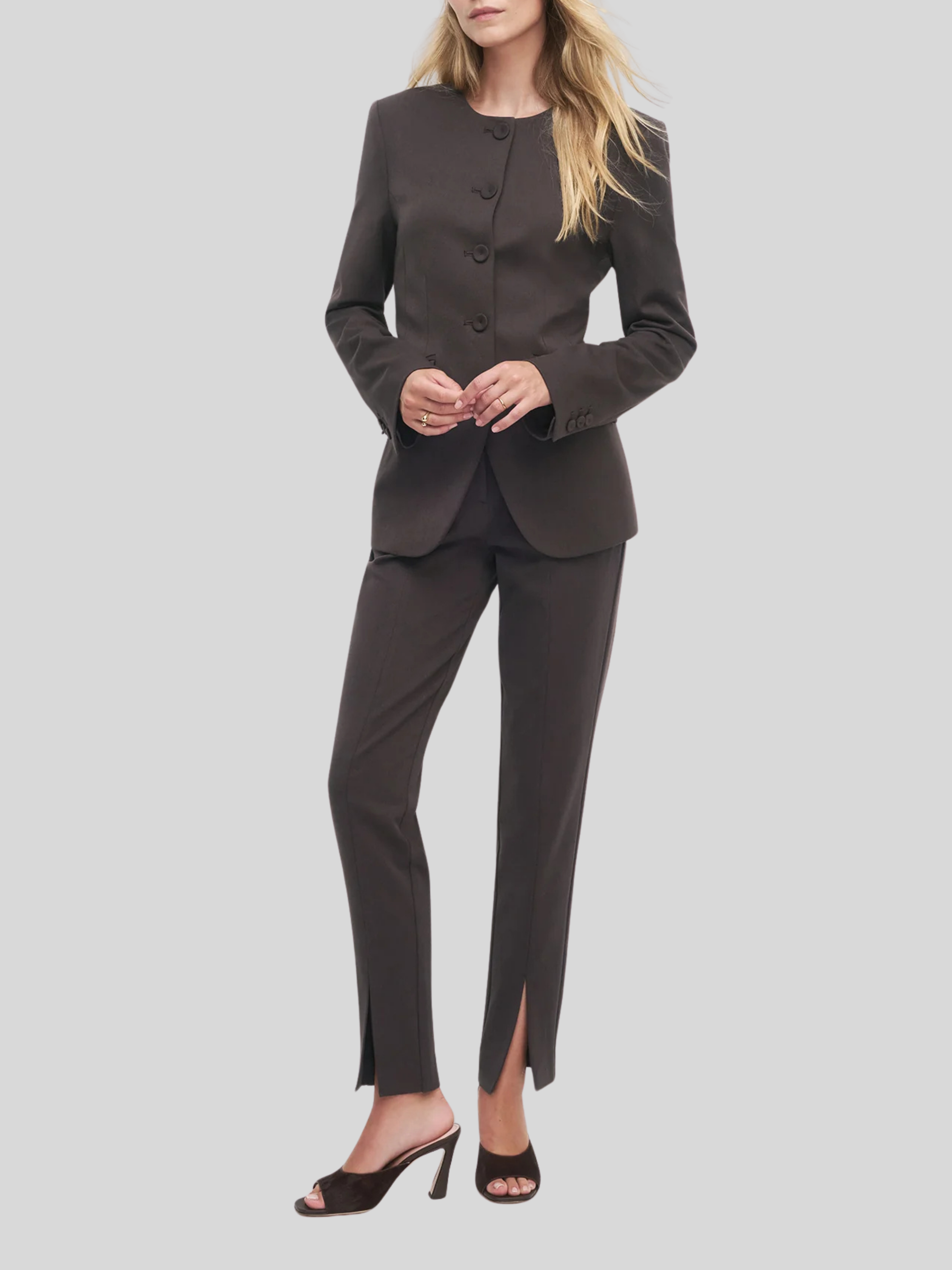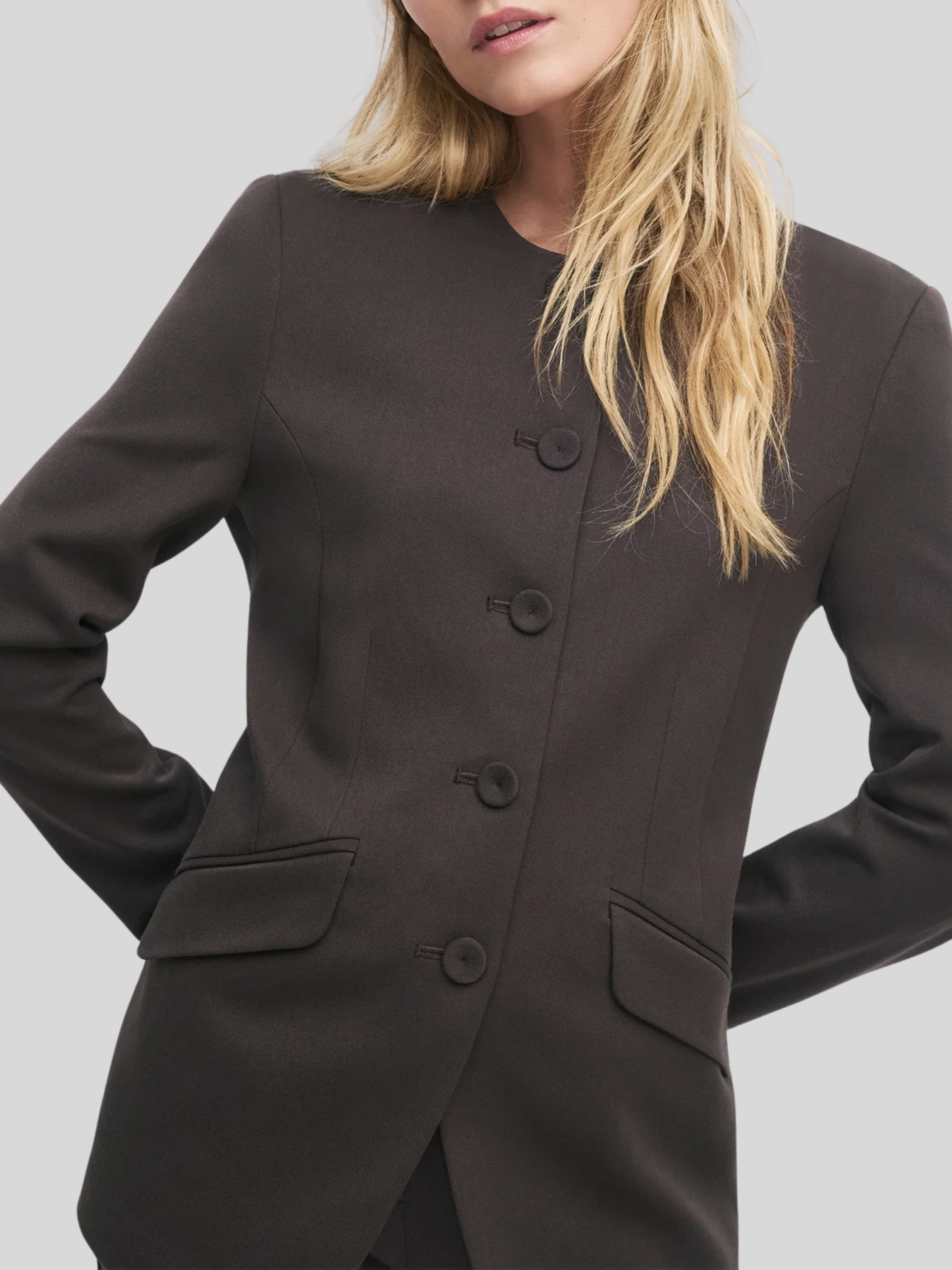 The Victoria Jacket does it differently. Collarless with a crew neckline, slanted pockets, and a slightly defined waist. Single-breasted with a front button closure, cut from a suiting blend that works any day of the week.