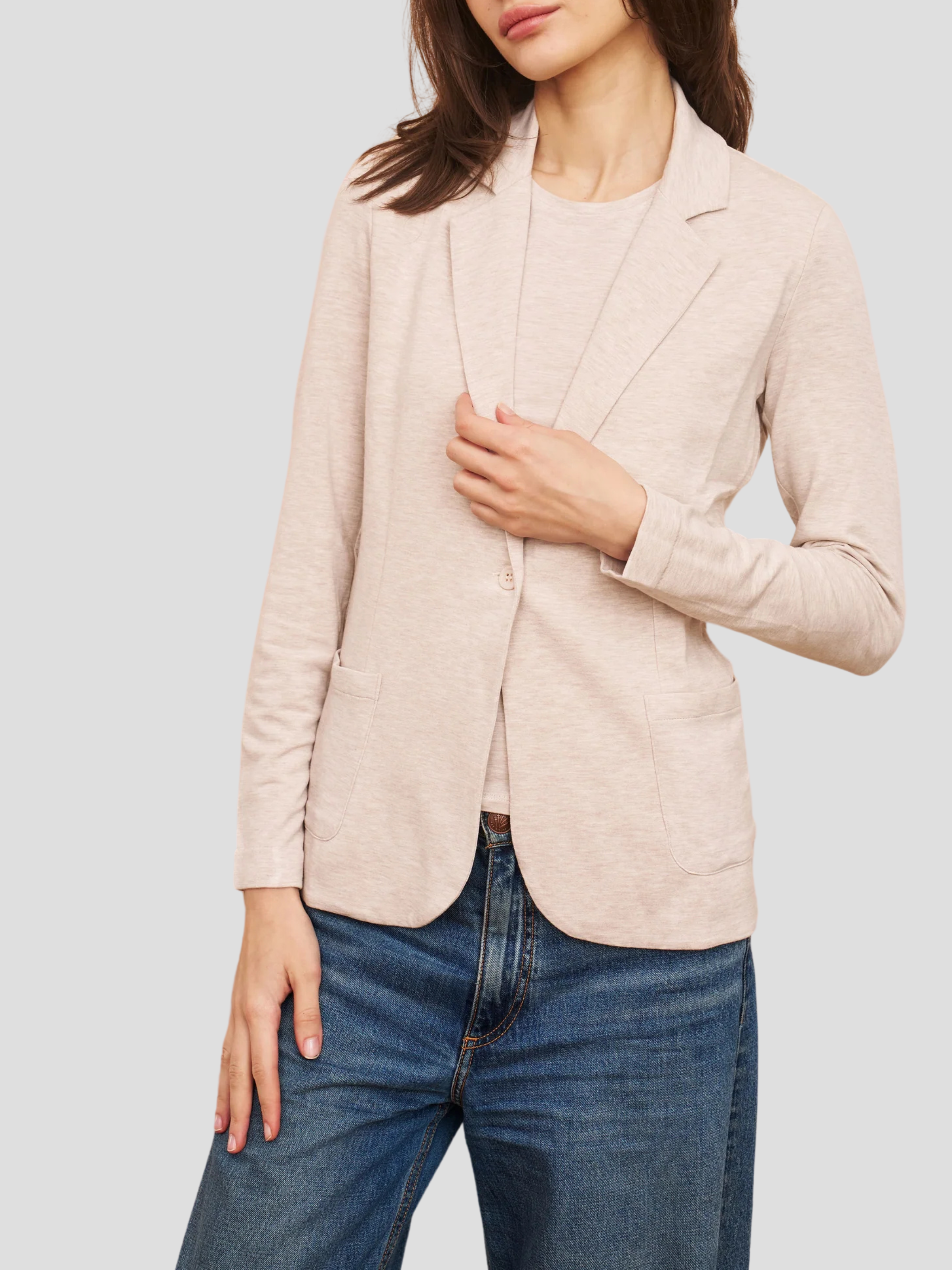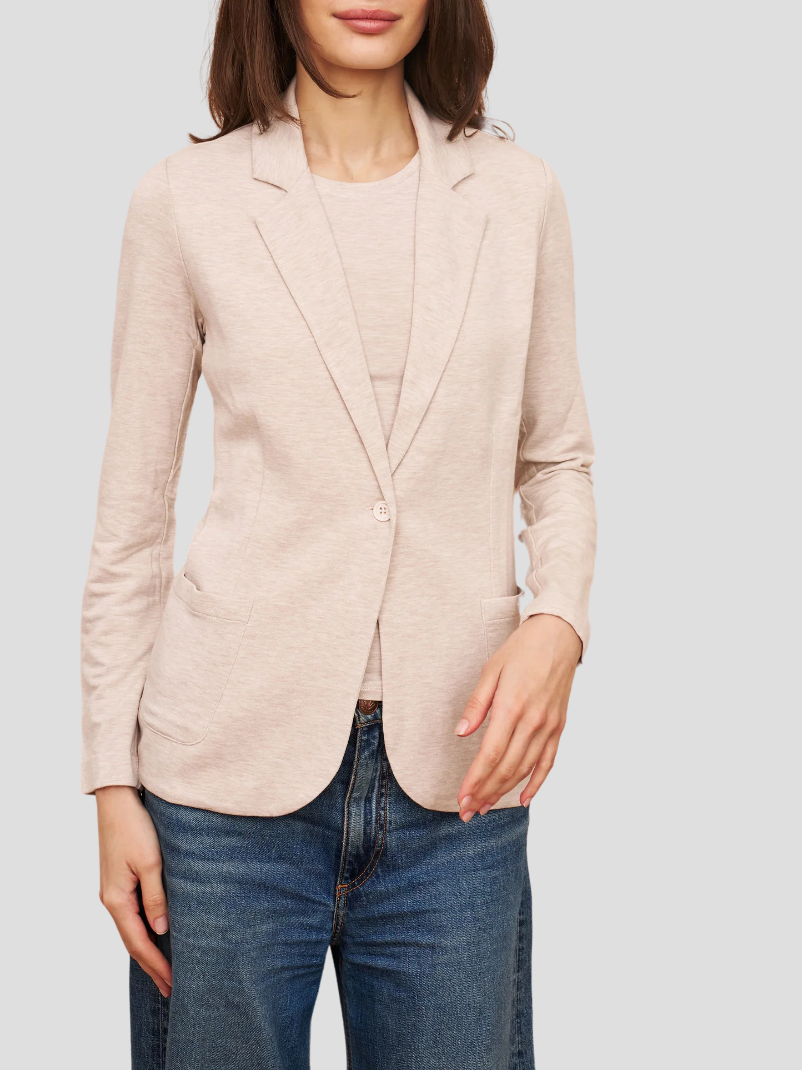 Crafted from luxurious French terry fabric, this sophisticated one-button blazer in ecru offers effortless elegance with exceptional comfort. The refined silhouette and neutral hue create a versatile statement piece that transitions seamlessly from professional settings to evening occasions. A timeless addition to your curated wardrobe.