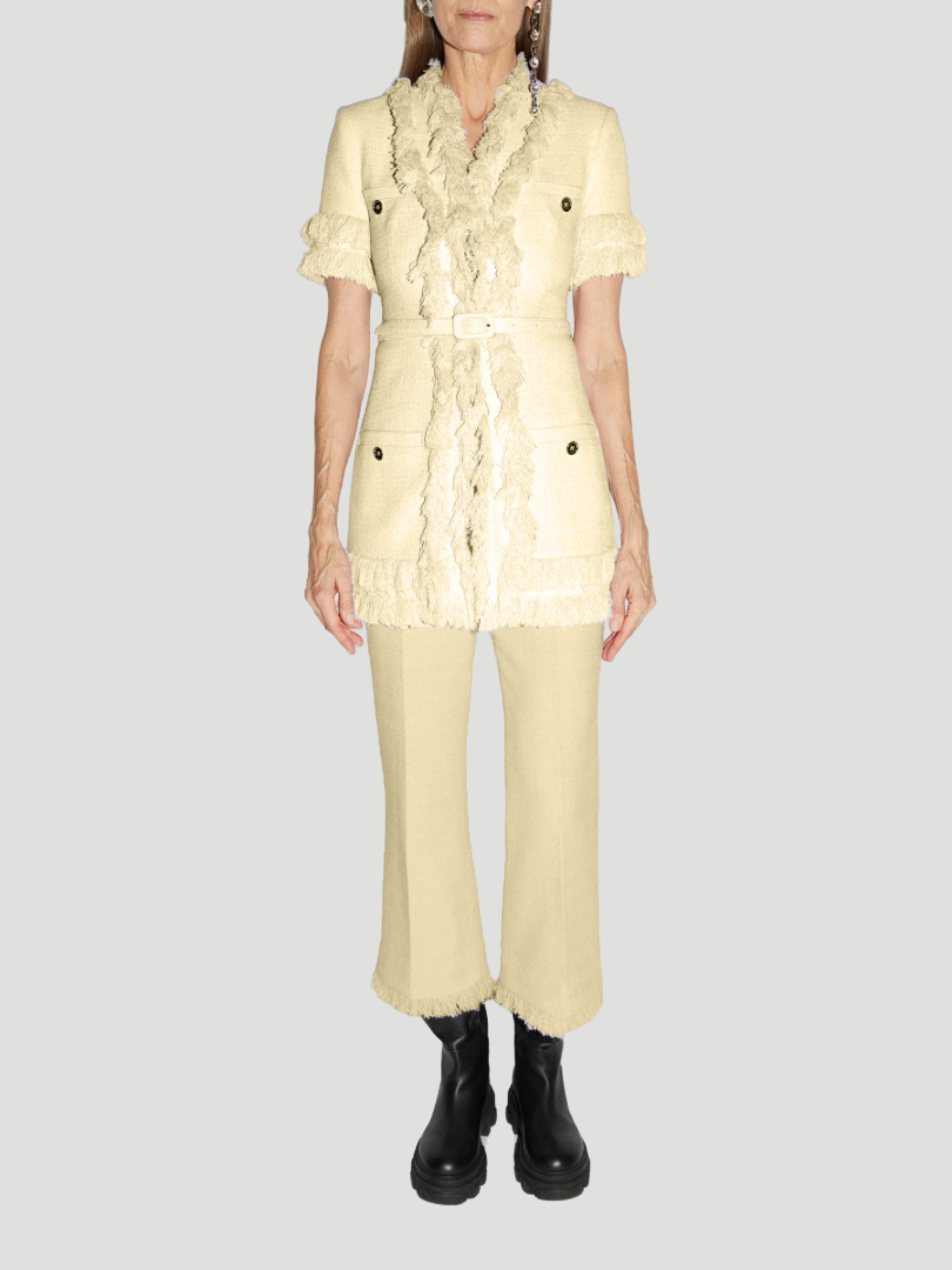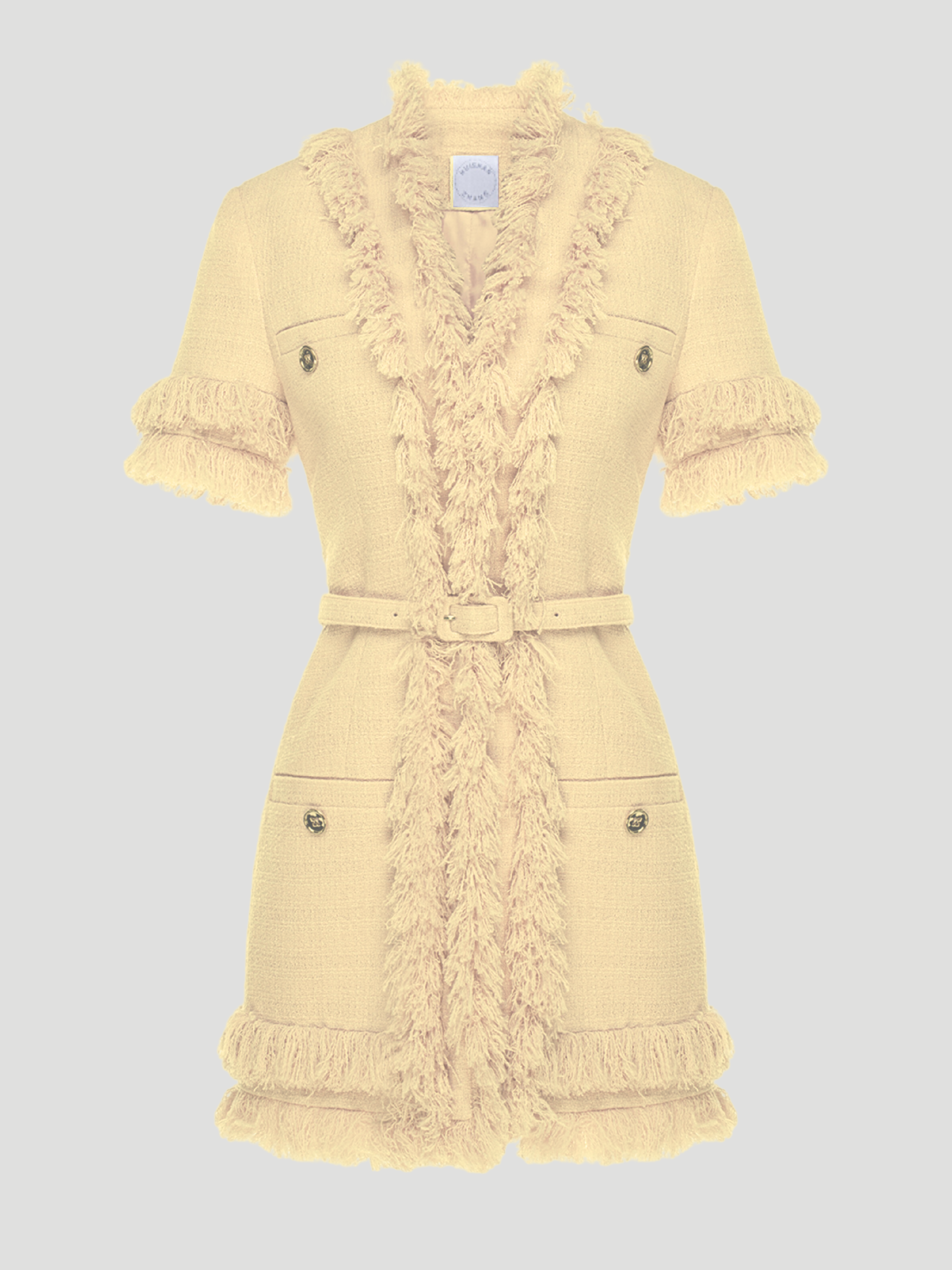 Introducing the Renya Tweed Short-Sleeved Fringe Trim Vest in Yellow, designed by Huishan Zhang. This unique vest features a vibrant yellow color, short sleeves, and fringe trim details. Crafted with quality tweed material, this vest is a perfect statement piece for any occasion. Experience the luxury and style of Huishan Zhang with this one-of-a-kind vest.