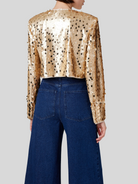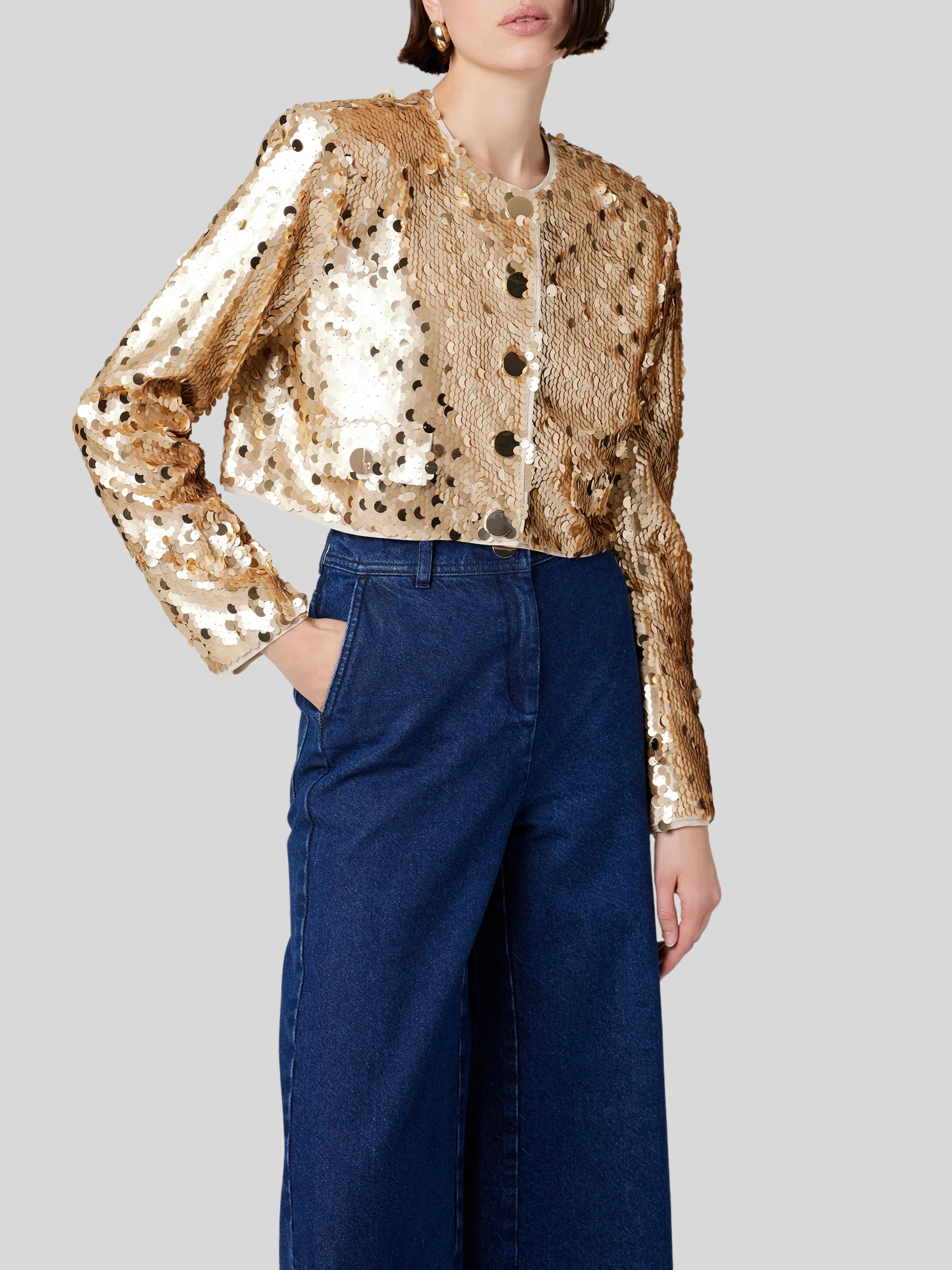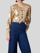 The Jones Crew Neck Cropped Jacket brings a bold shine to any look with its all-over sequin finish. Cut in a clean, collarless silhouette, it’s designed for a modern, cropped fit. Perfect for layering over dresses or pairing with high-waisted jeans.