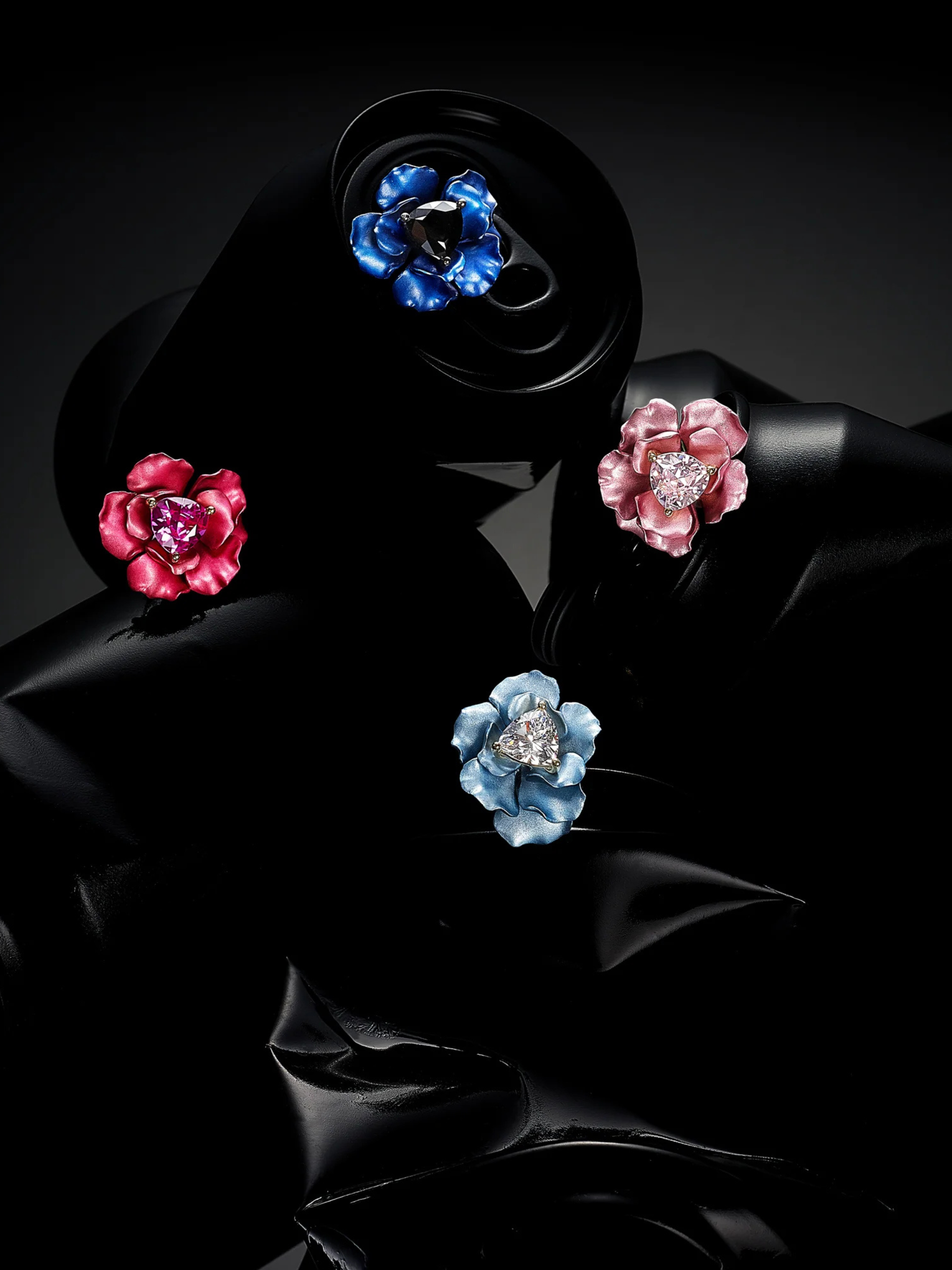 A stunning pair of stud earrings in powder blue recycled aluminium and 18k gold vermeil, with 14k gold earring posts and omega backs, intricately hand-set with laboratory-grown simulated trillion-cut white diamonds.