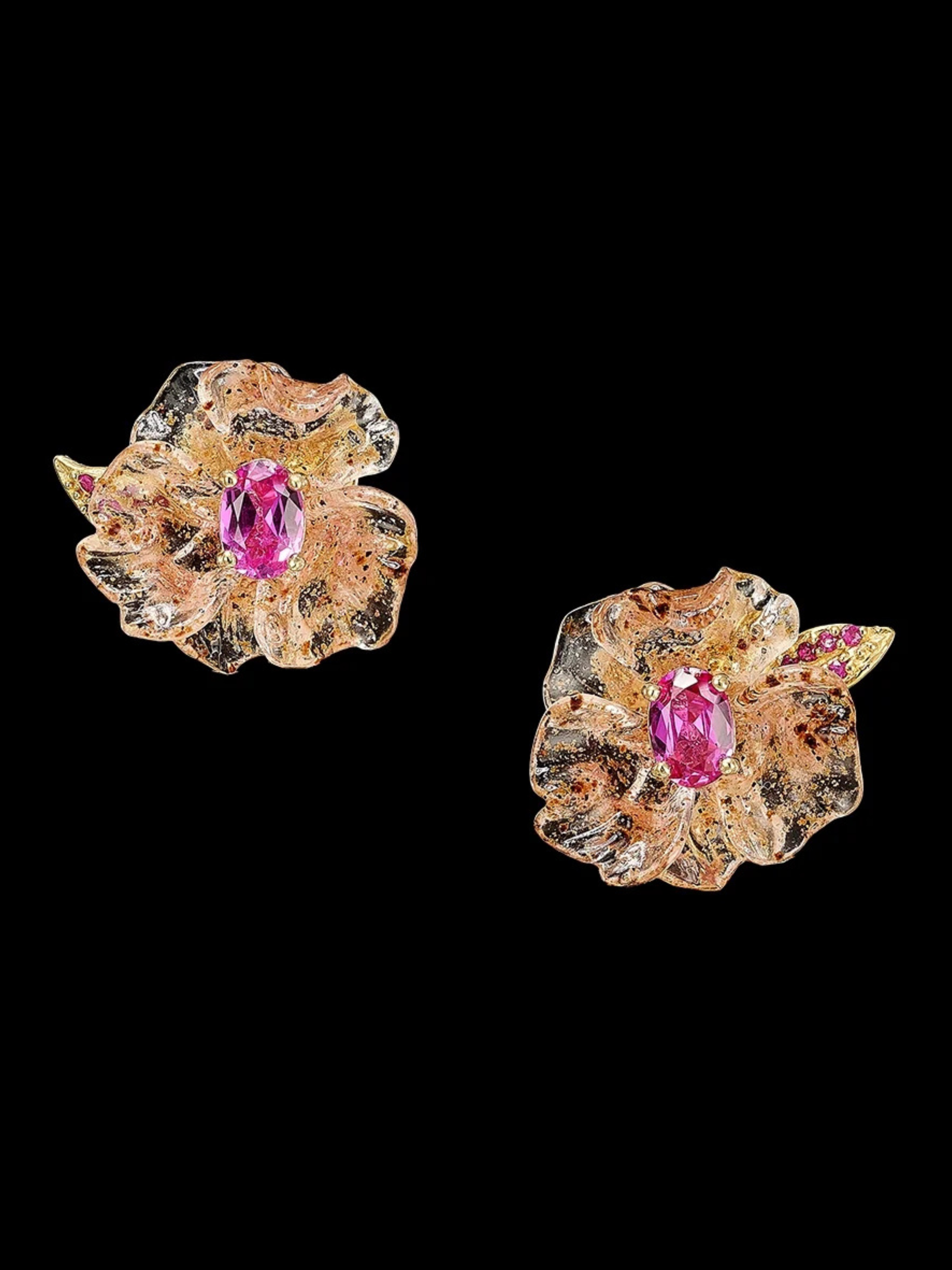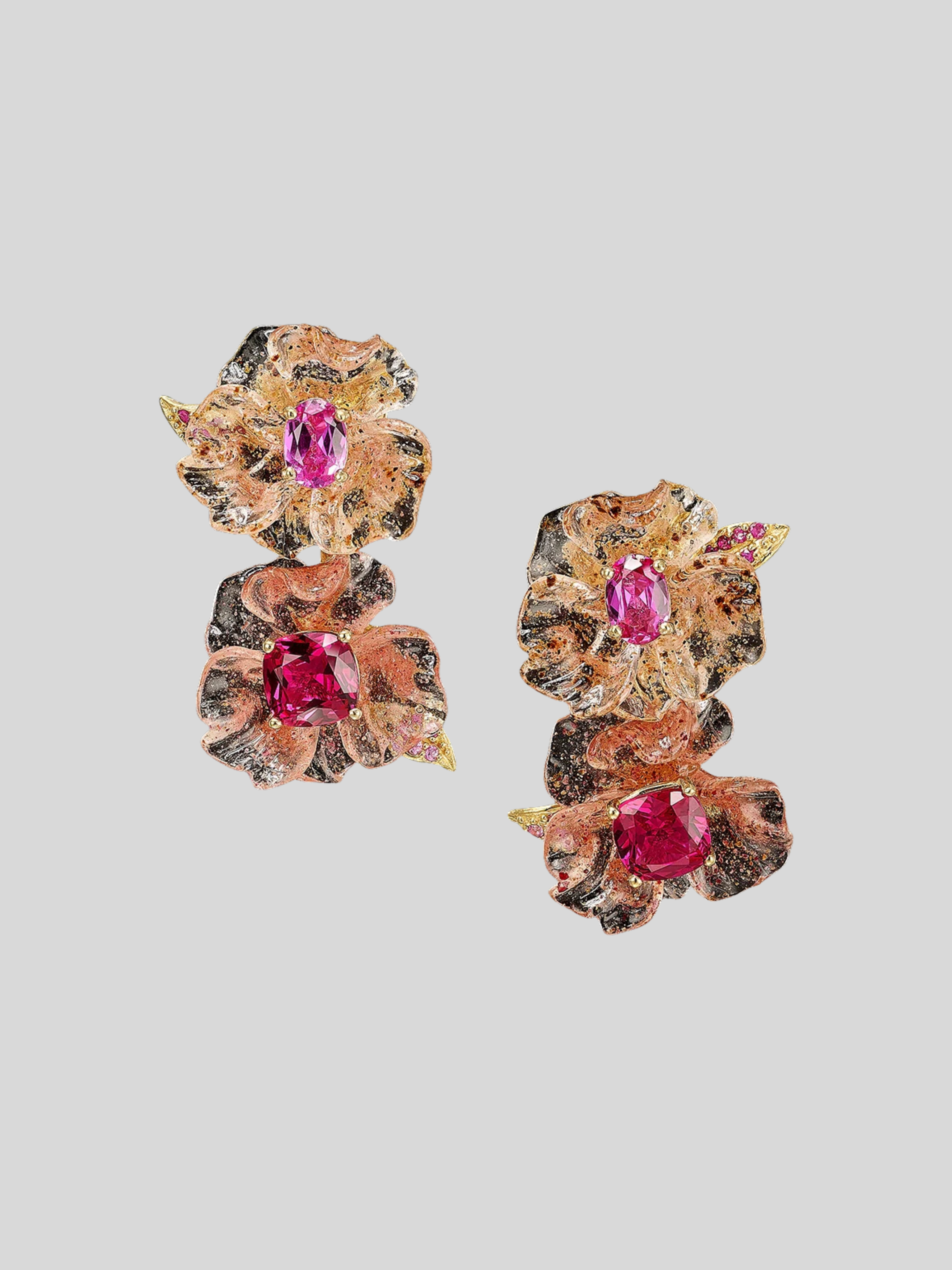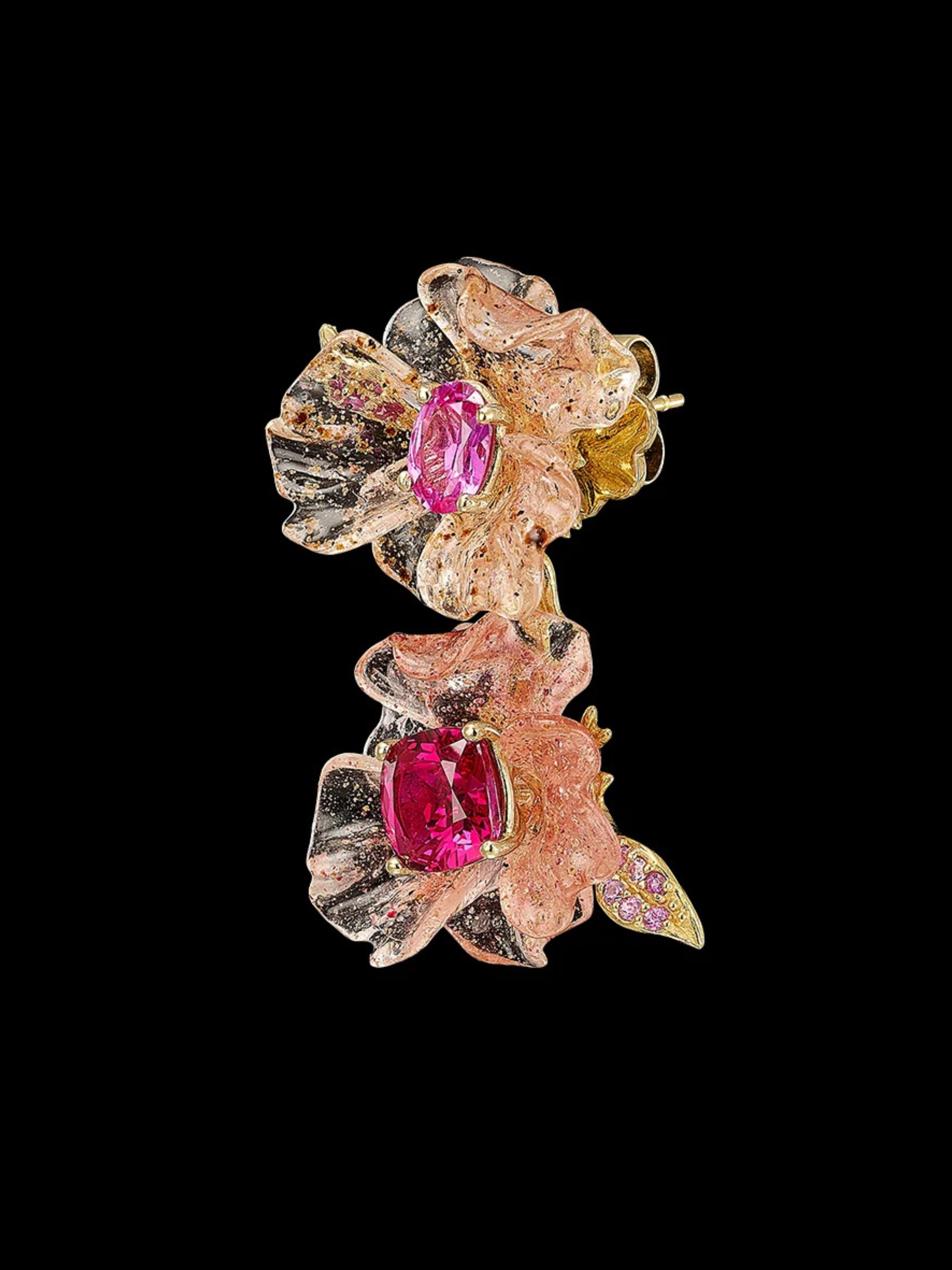 The Ruby Petunia Drop Earrings are handcrafted with Beetroot and Dragonfruit Fruit Gems™, with betalains contributing to hues of red and purple extracted from beetroots and dragonfruits; casted in the form of petunia flowers, hand-set with a pair of laboratory-grown rubies and pink sapphires, with delicate golden leaves pave-set with orange sapphires.