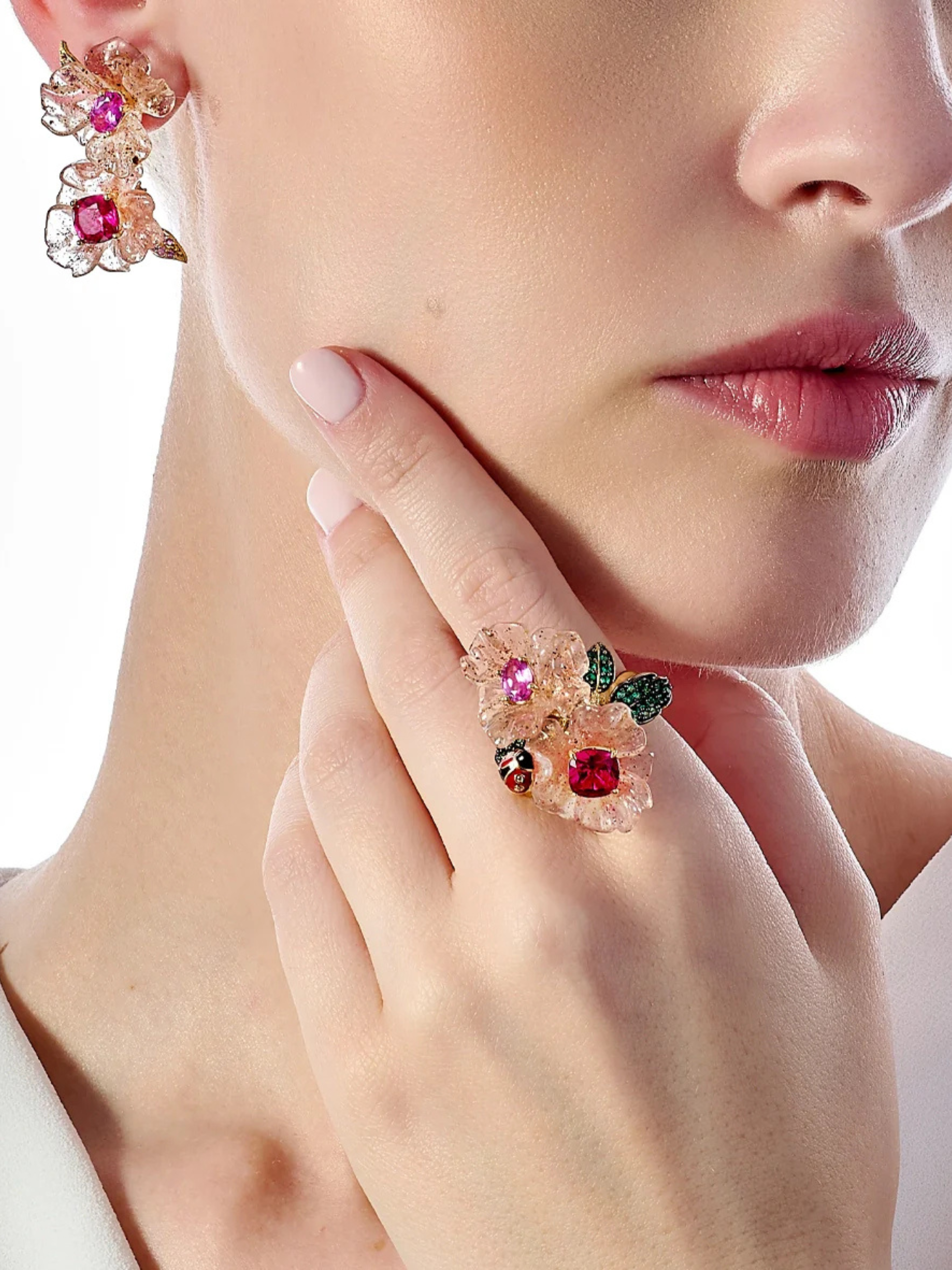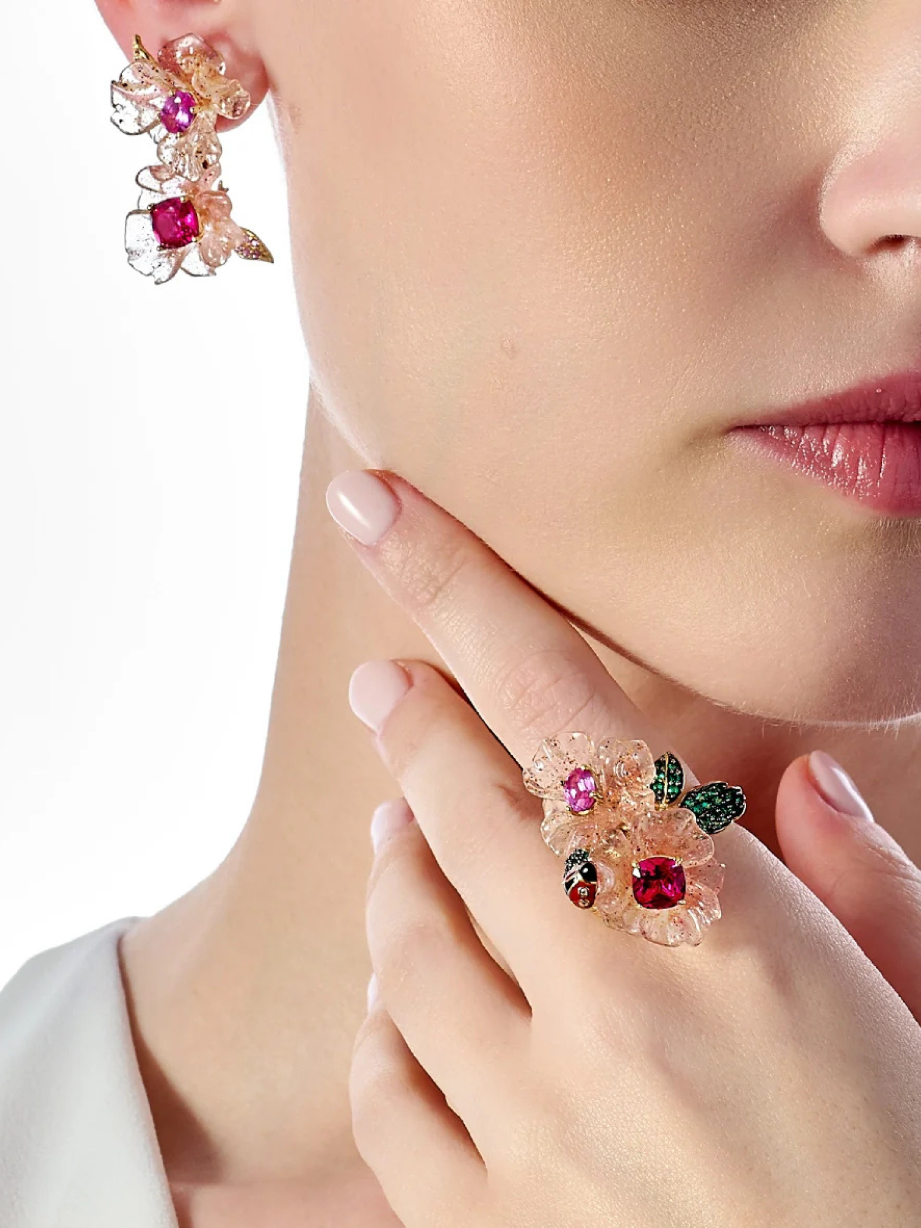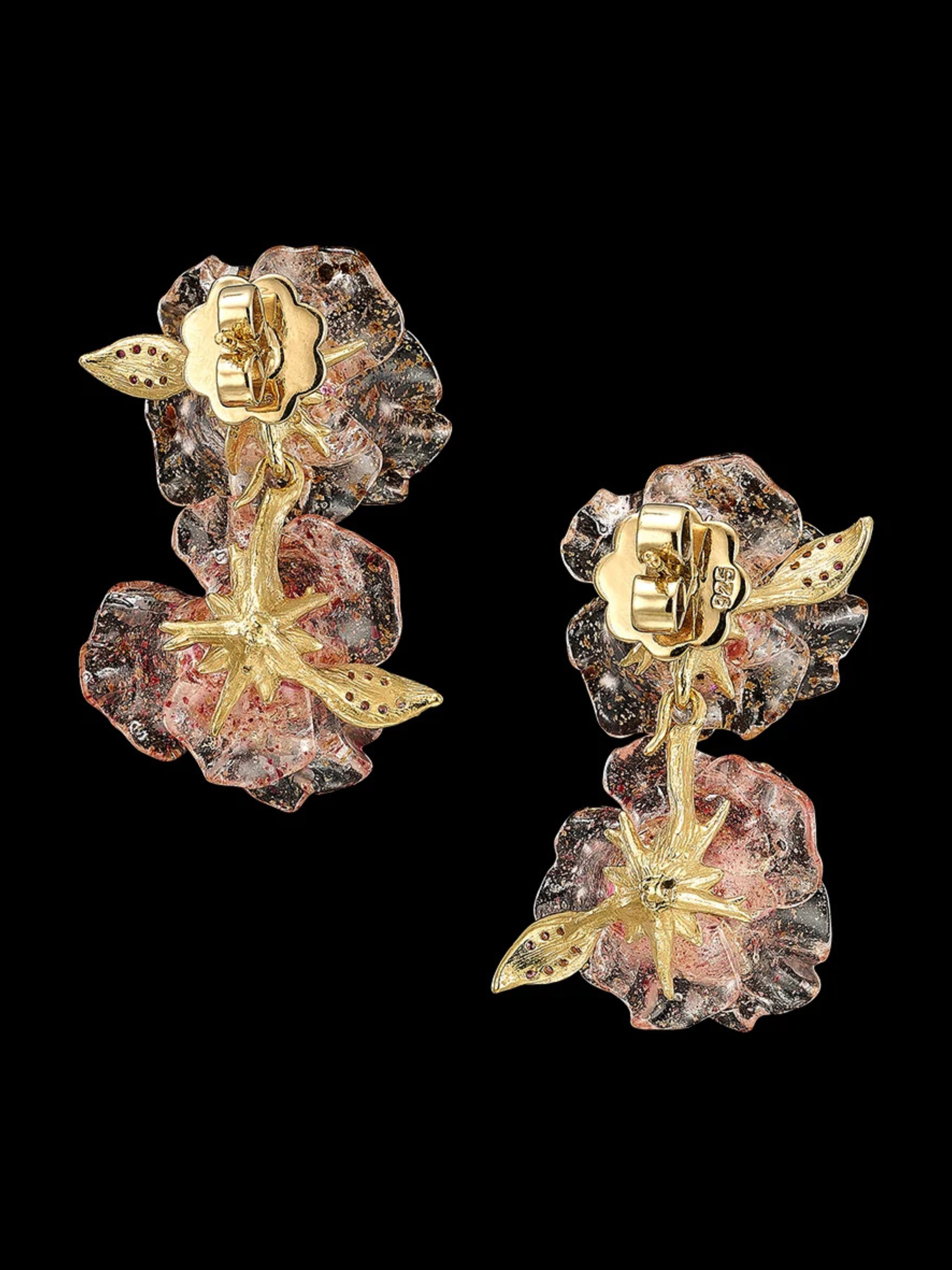 The Ruby Petunia Drop Earrings are handcrafted with Beetroot and Dragonfruit Fruit Gems™, with betalains contributing to hues of red and purple extracted from beetroots and dragonfruits; casted in the form of petunia flowers, hand-set with a pair of laboratory-grown rubies and pink sapphires, with delicate golden leaves pave-set with orange sapphires.