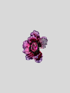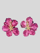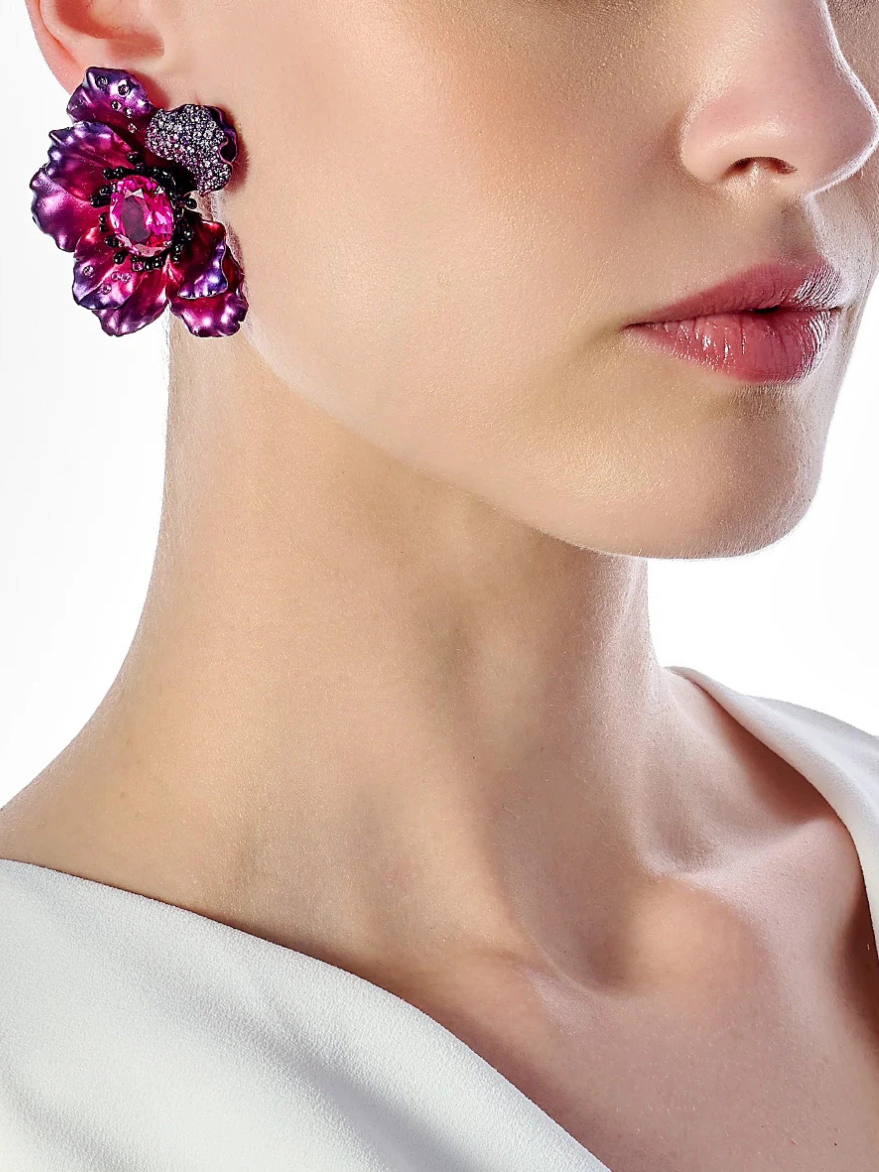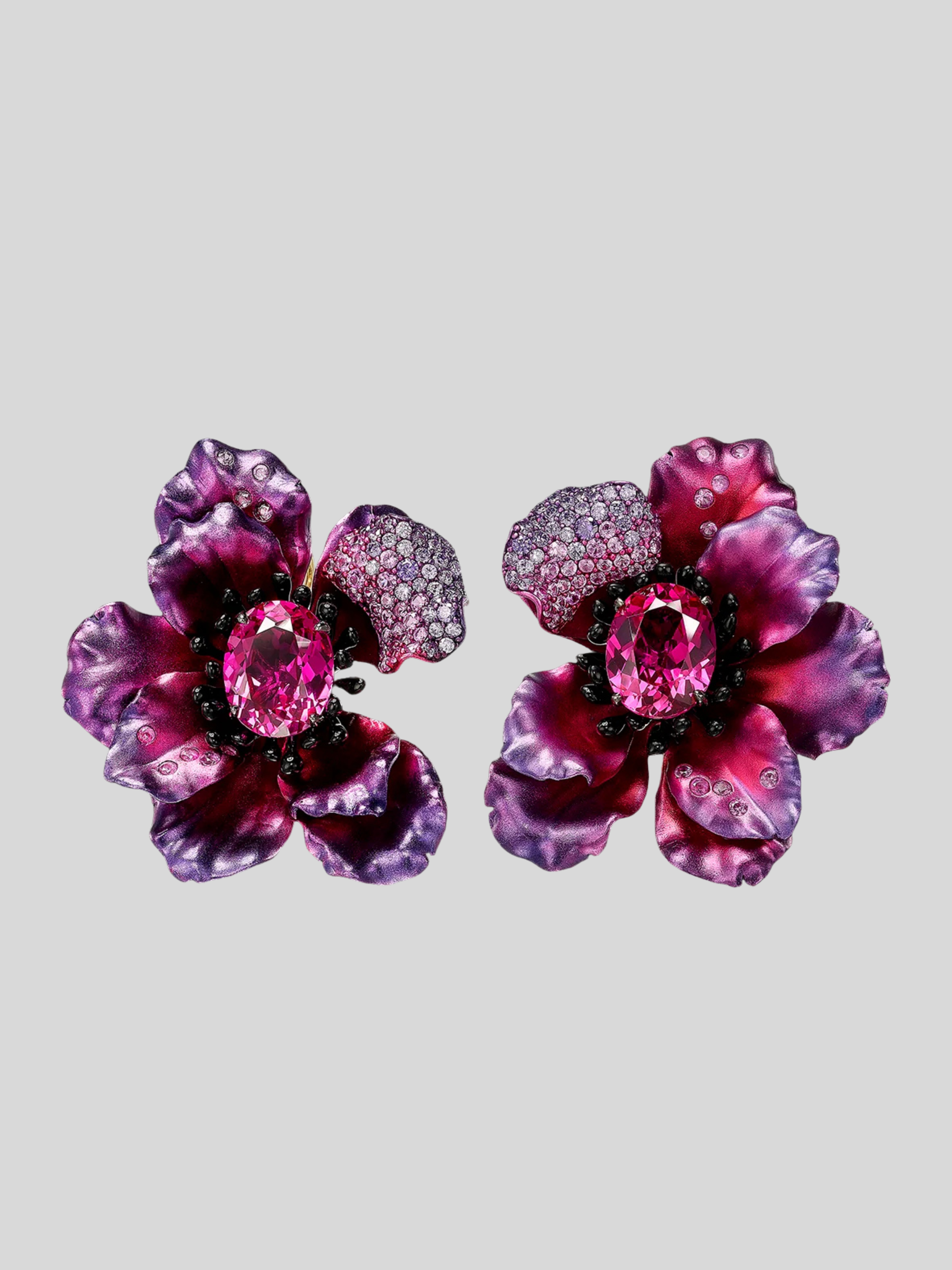A stunning pair of feather-light earrings with omega backs in painterly anodised recycled aluminium and 18k gold vermeil, with 14k gold earring posts. This innovative pair of earrings is intricately hand-set with laboratory-grown and created gemstones including fuchsia pink sapphires, rose pink sapphires, and violet and lilac amethysts.