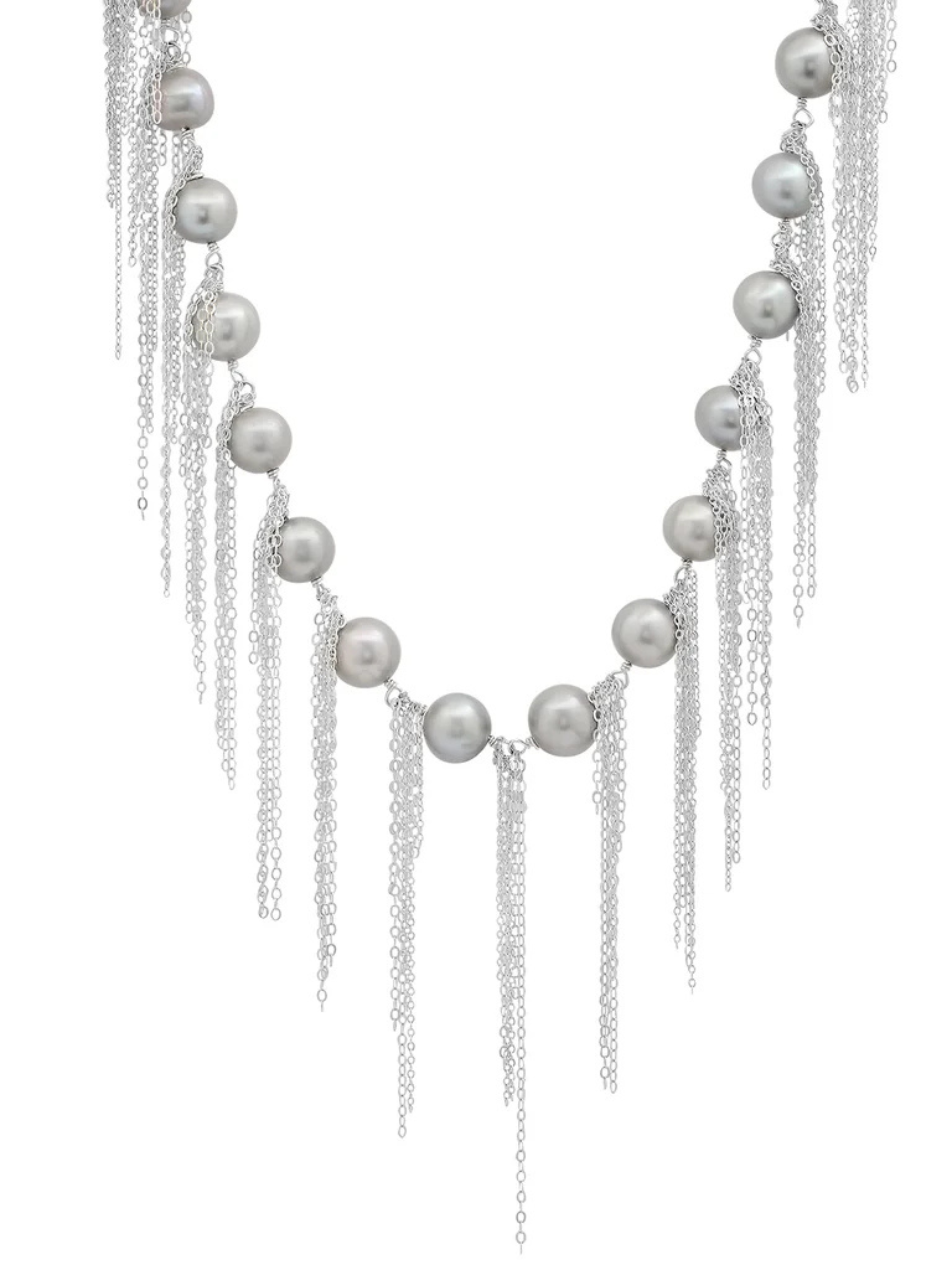 Elevate your elegance with this 31" Silver Freshwater Pearl Fringe Necklace. Featuring lustrous freshwater pearls delicately arranged in a graceful fringe design, this necklace adds a refined shimmer to any ensemble. Its timeless silver setting enhances the pearls’ natural glow, creating a sophisticated accessory perfect for both formal occasions and polished everyday wear.