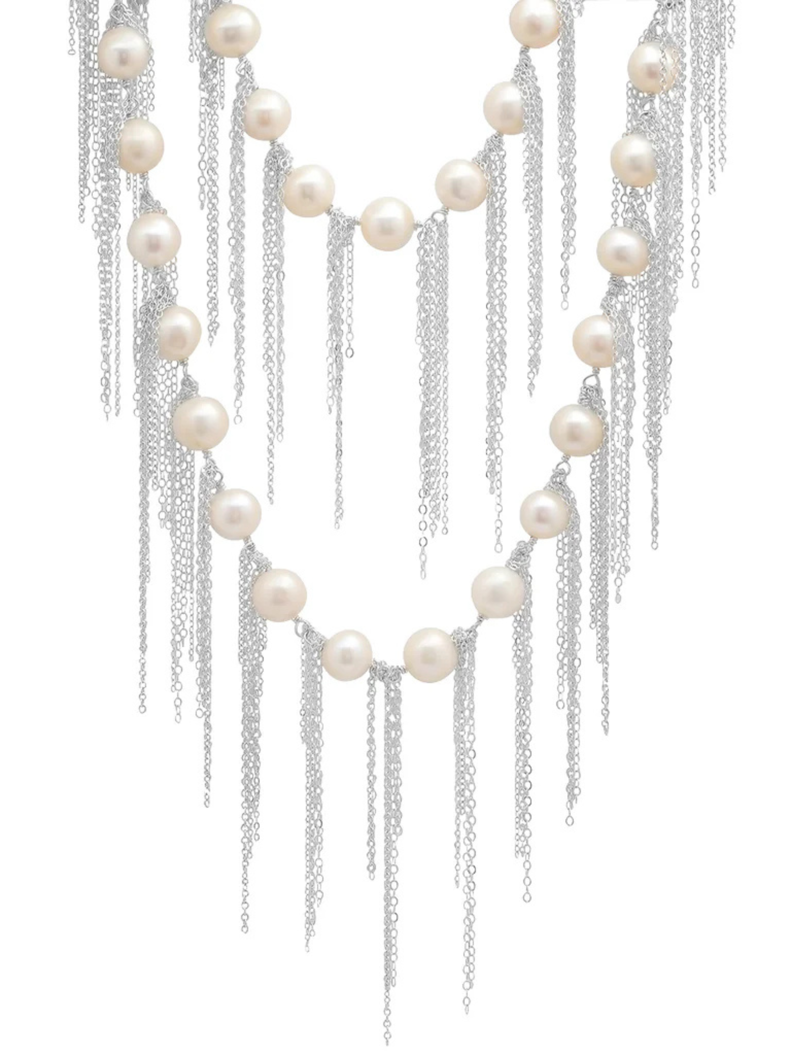 Elevate your elegance with this 62" White Freshwater Pearl Fringe Necklace. Featuring lustrous freshwater pearls delicately arranged in a timeless fringe design, it effortlessly enhances both classic and contemporary ensembles. The generous length allows for versatile styling, making it a refined accessory for any occasion.