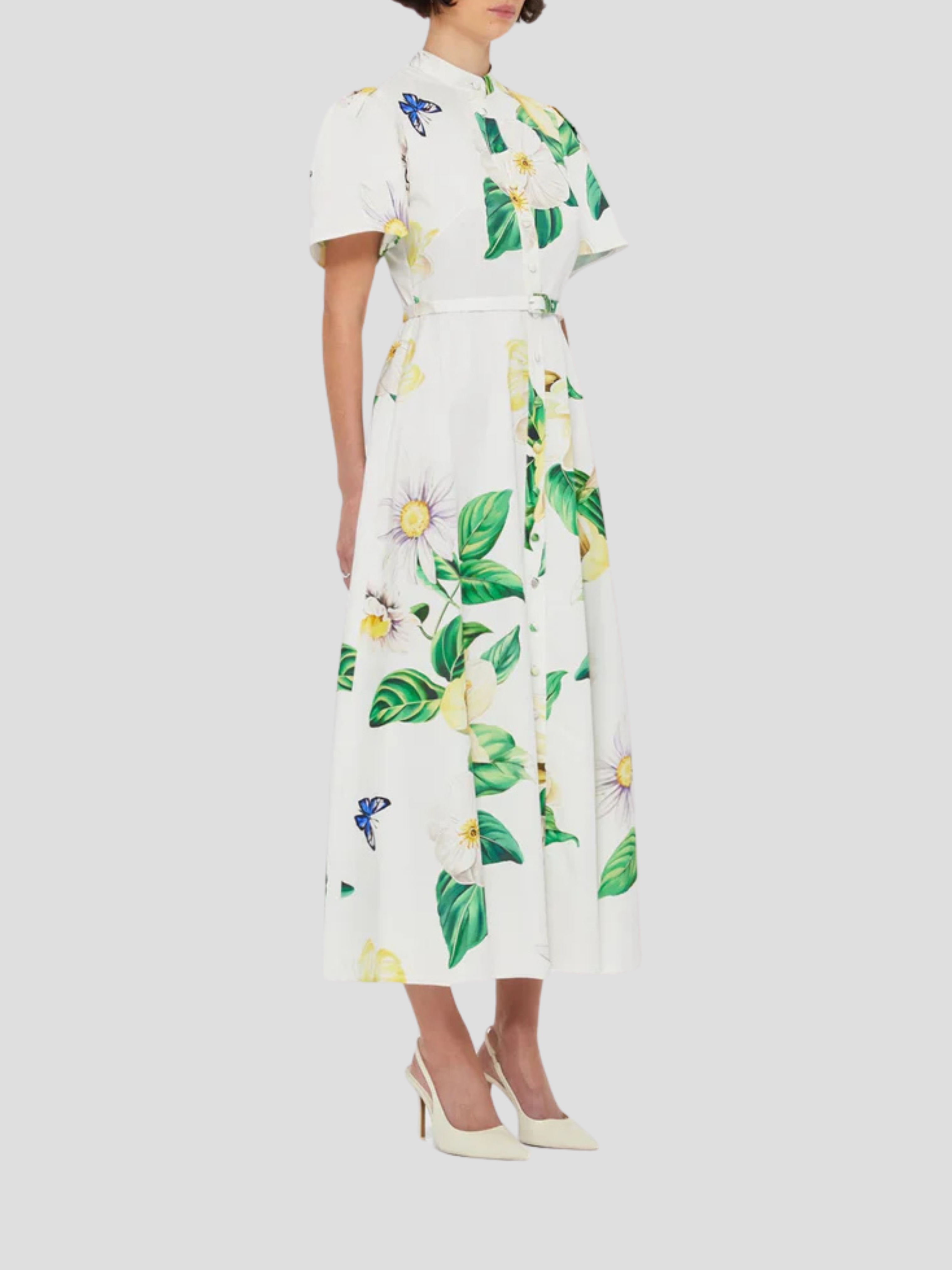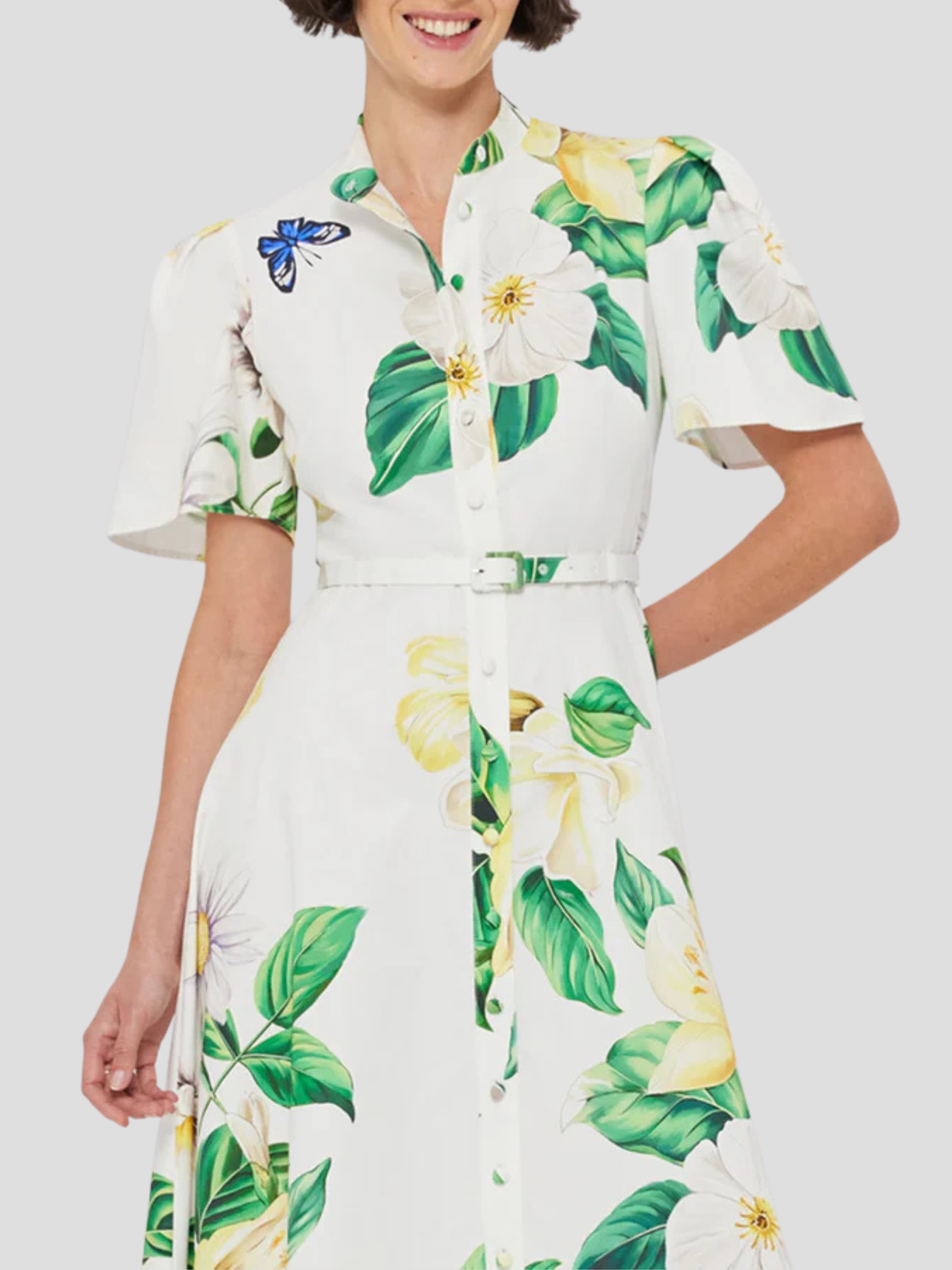 Delicate daisies and camellias are hand-painted onto a fresh white canvas. Playful cobalt blue butterflies flutter irregularly across the print, one can almost feel the sensation of sunshine through the fabric.