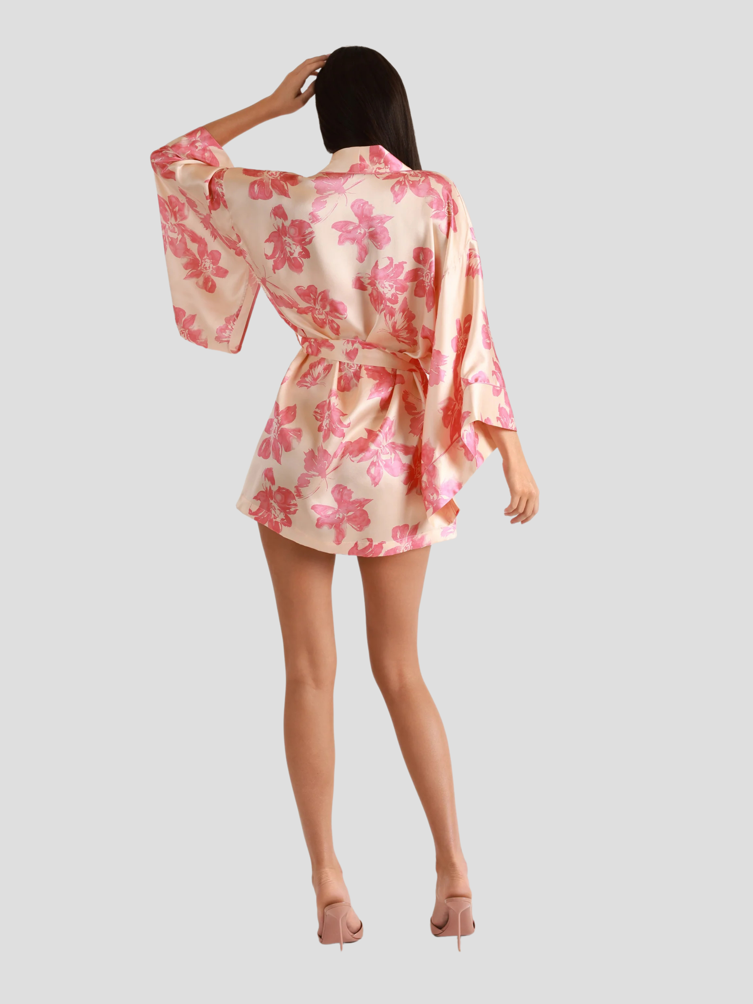 Papillon Et Orchid Silk Kimono in Blush Rose Print
