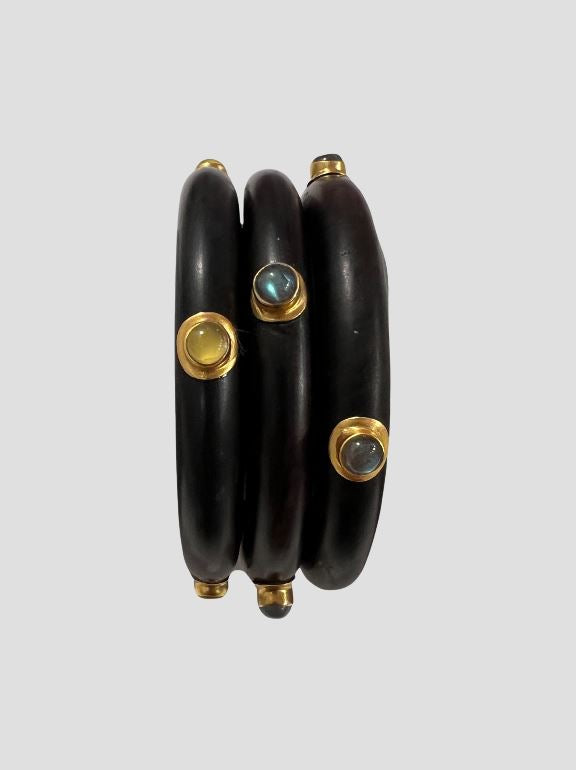 SET OF 3 BLACK WOOD BANGLE W MULTI STONE