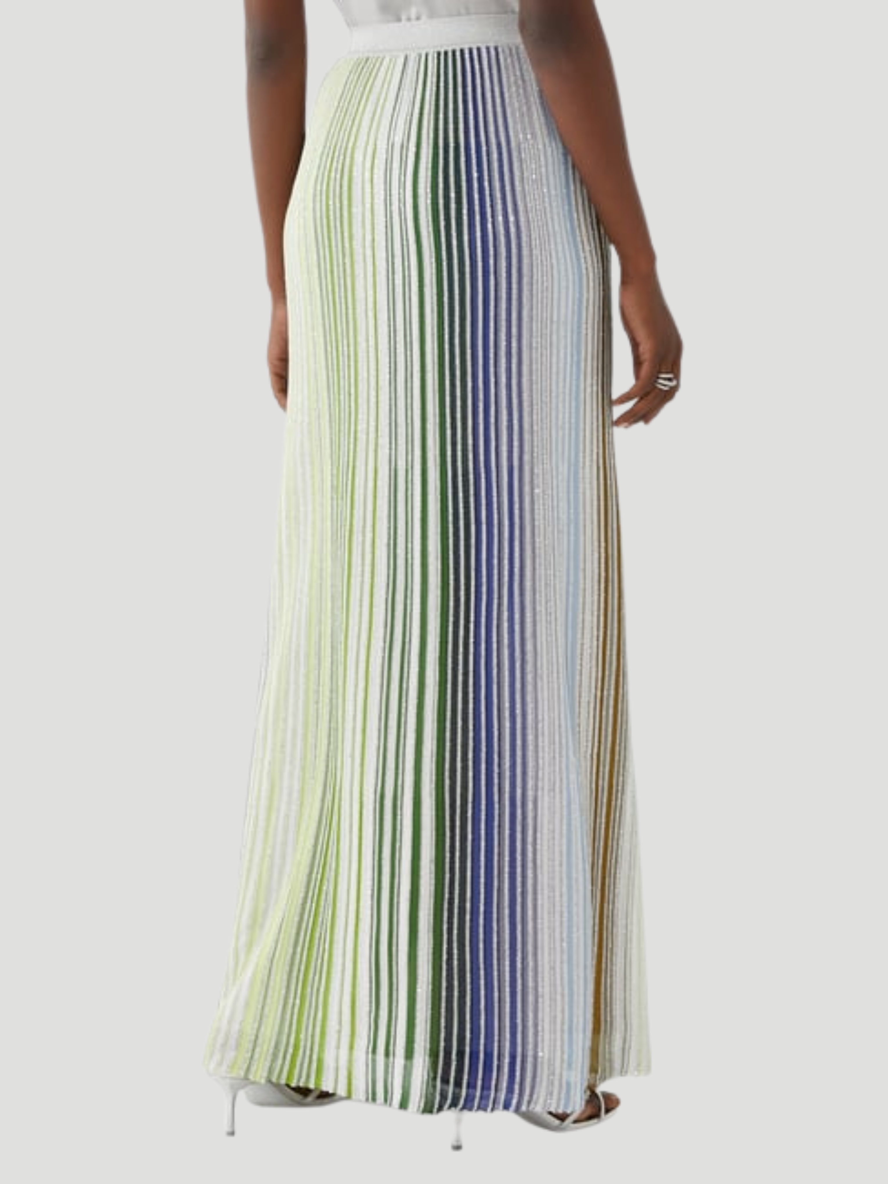 Add a pop of color to your wardrobe with Missoni's Partialized Knit Sequinned Maxi Skirt. The vibrant green and blue tones, combined with intricate sequin detailing, make this piece perfect for any special event. Made with high-quality, lightweight fabric and an elastic waistband for comfort and style.