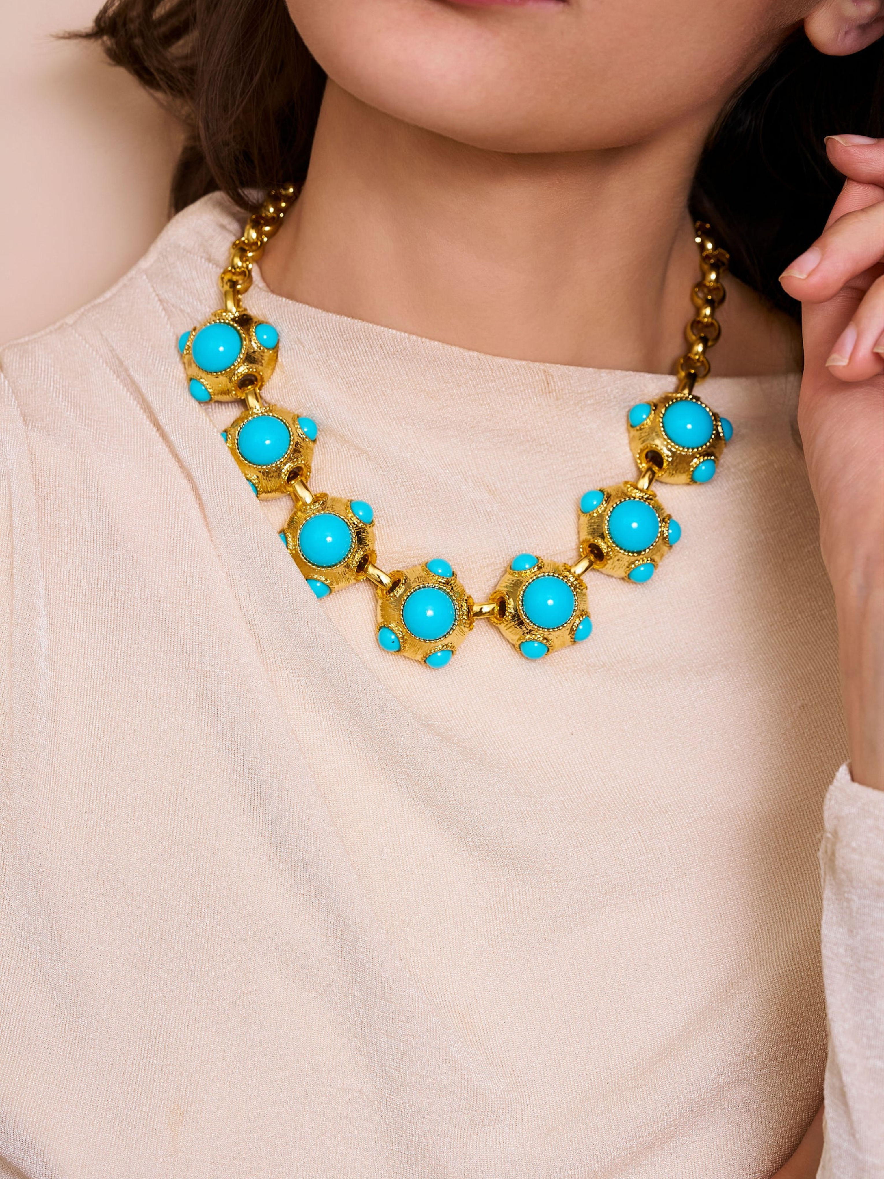 The lustrous satin gold finish exudes understated luxury, while the vibrant turquoise center adds a pop of color and visual interest. The combination of textures and hues creates a harmonious and captivating aesthetic that is sure to turn heads.
