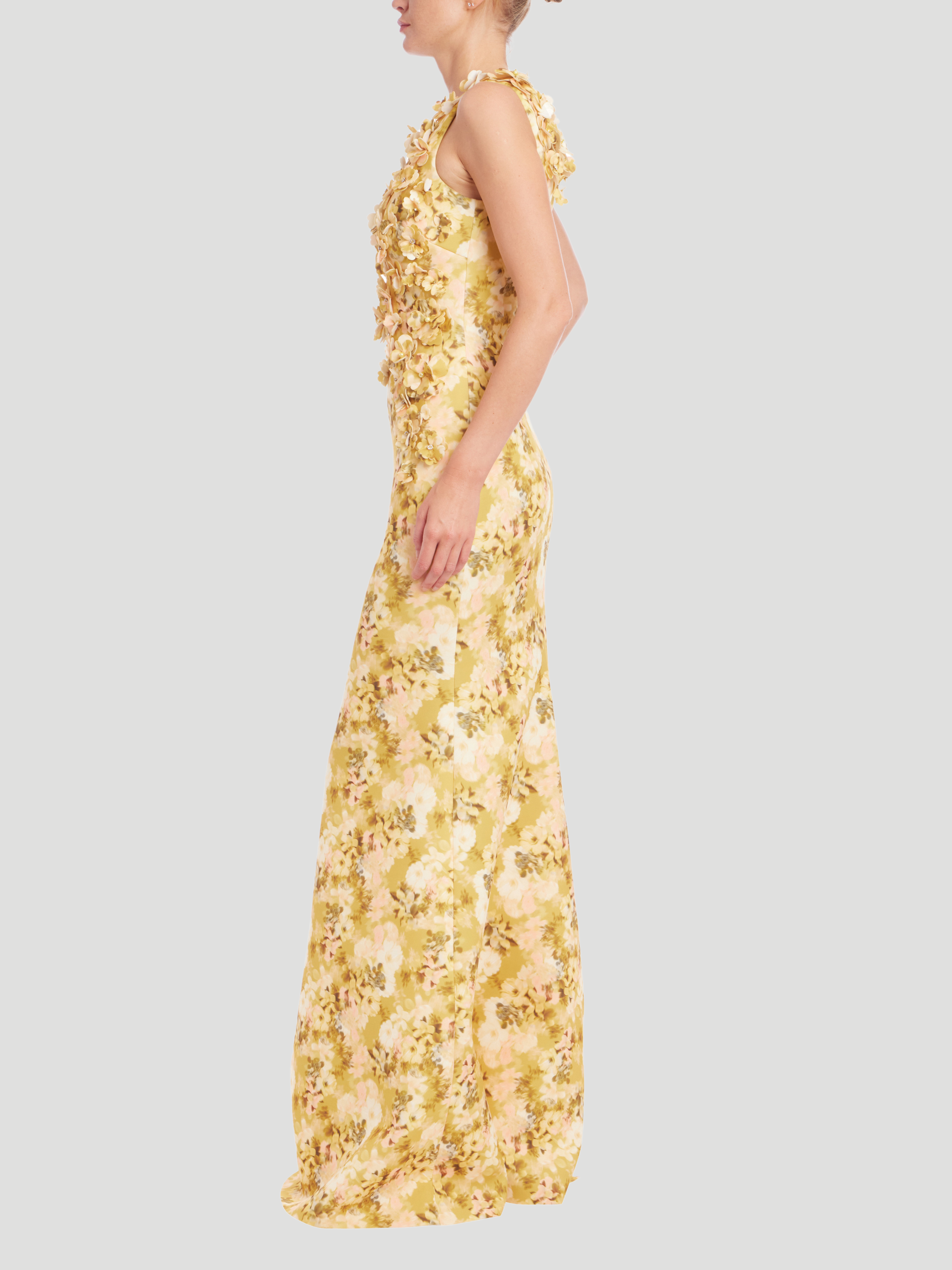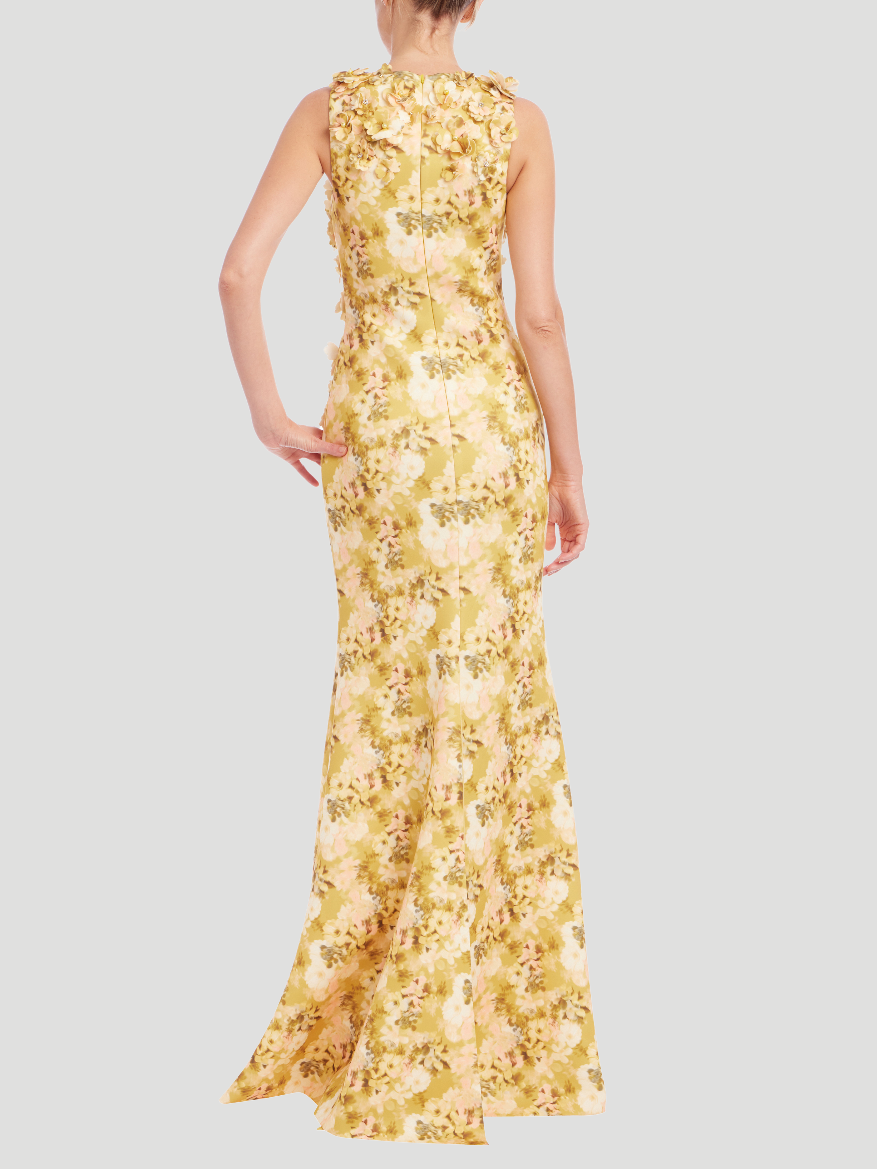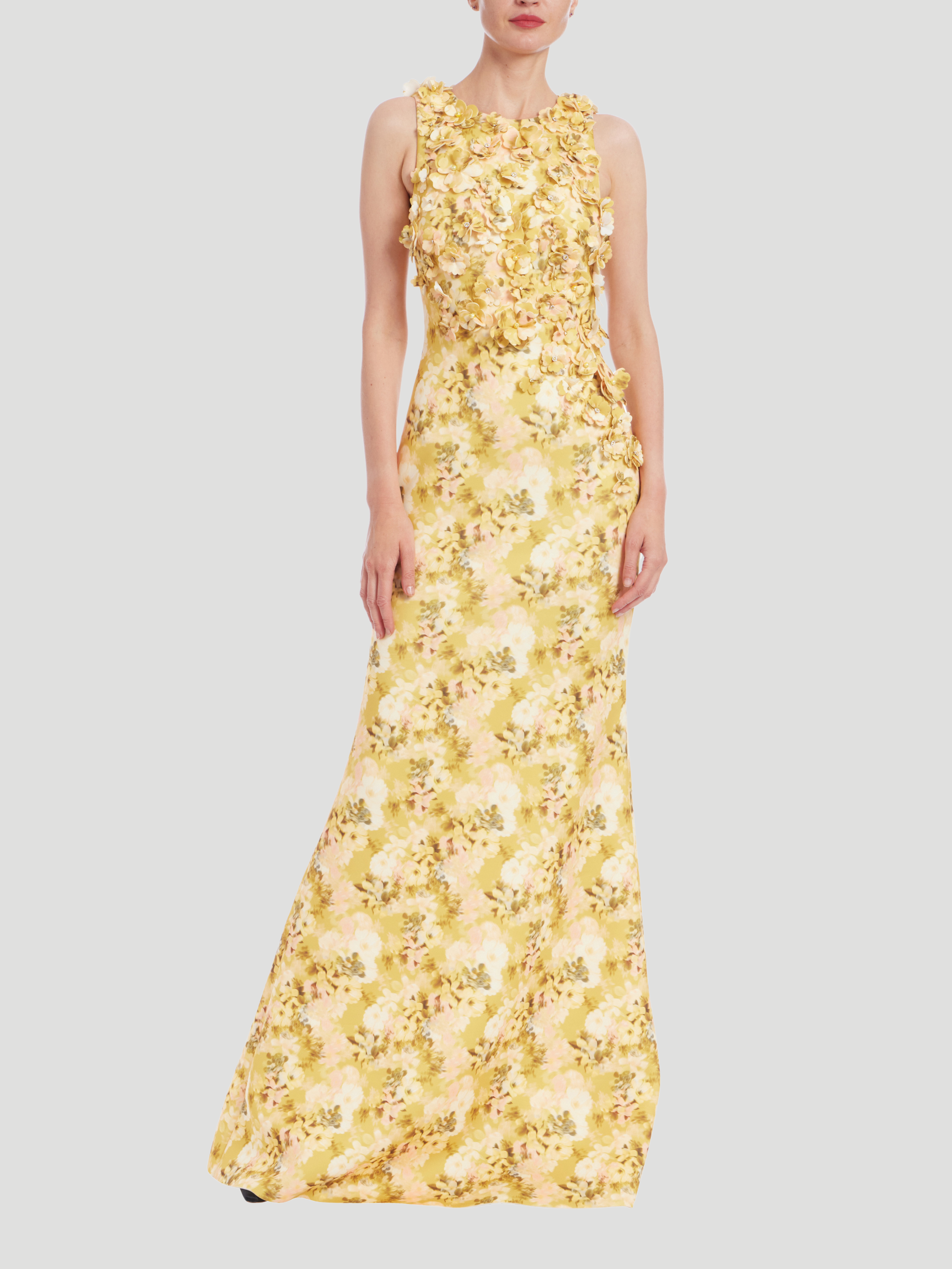 From the soft floral print to the sunlit yellow base, Badgley Mischka's 3D Applique Sleeveless Column Gown is a stunning ode to spring. Made from structured scuba fabric, it boasts vibrant color and delicate 3D floral appliqués that create a dynamic, textured look. The racer neckline adds a modern, sporty touch. Perfect for any special occasion.